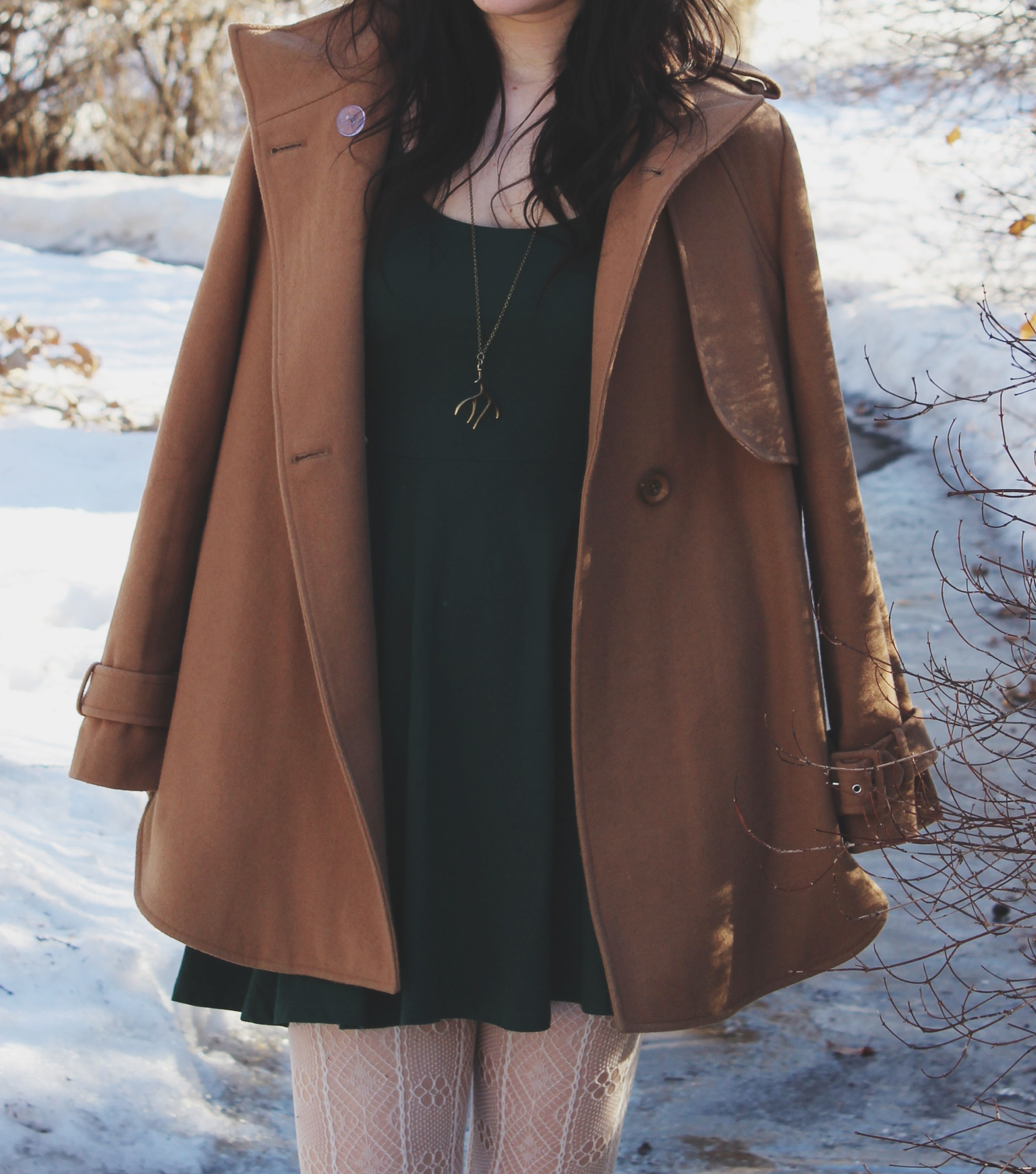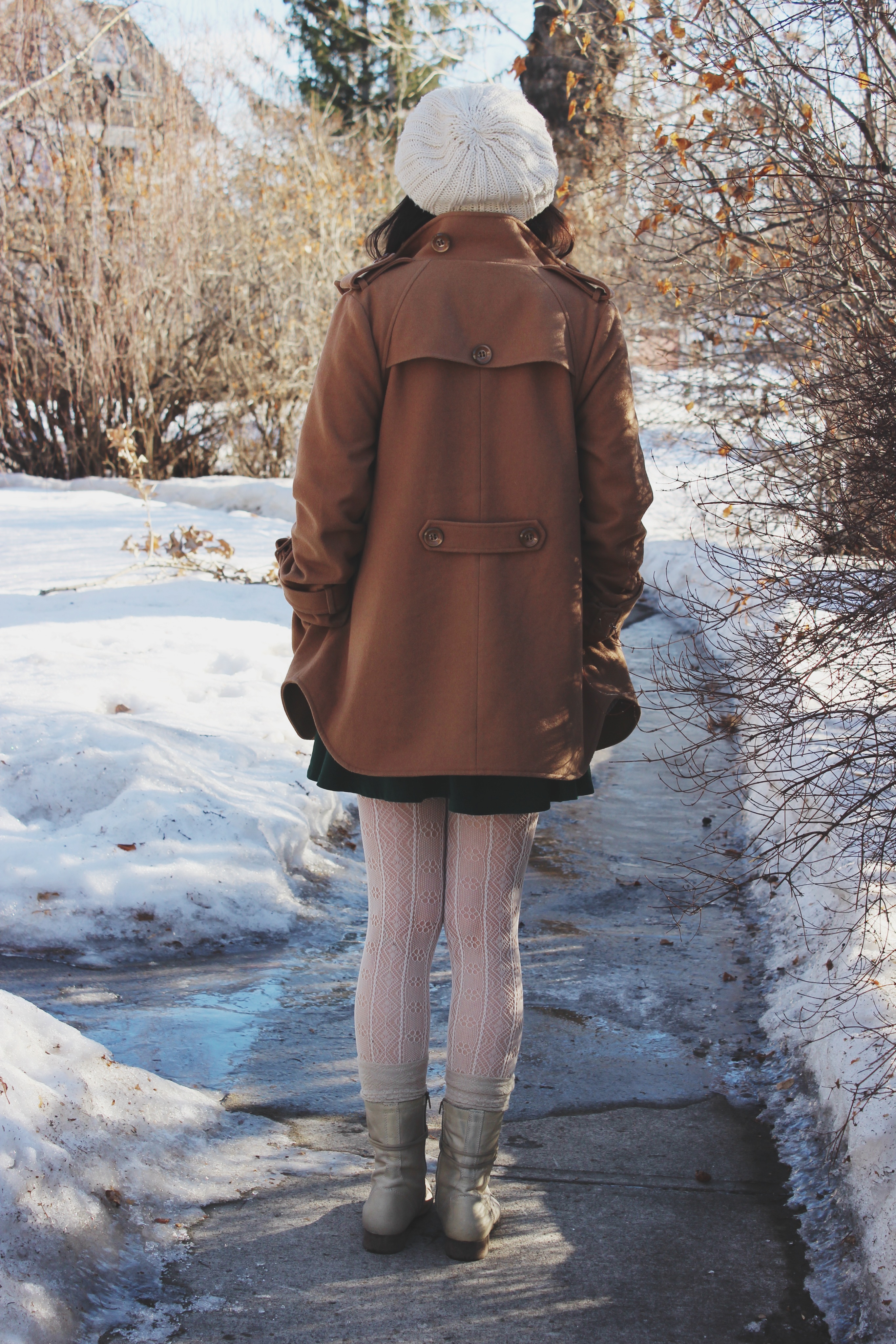 This winter I decided It was time for a new coat. I wasn’t 100% sure what I was looking for but I wanted something cute and dressy and something a little different from the navy blue coat I already own. It actually took me a while to find something that I really liked so when I found this coat I was really excited! I found it at a store in Calgary called Dick and Janes. I always find really cute dresses and shirts there and my previous winter coat, so I knew it was a good place to look for my new one. The green dress underneath is from Urban Outfitters, I love the colour and I love how simple it is. When you have a dress that’s really plain you can add some patterned tights for a more interesting look.