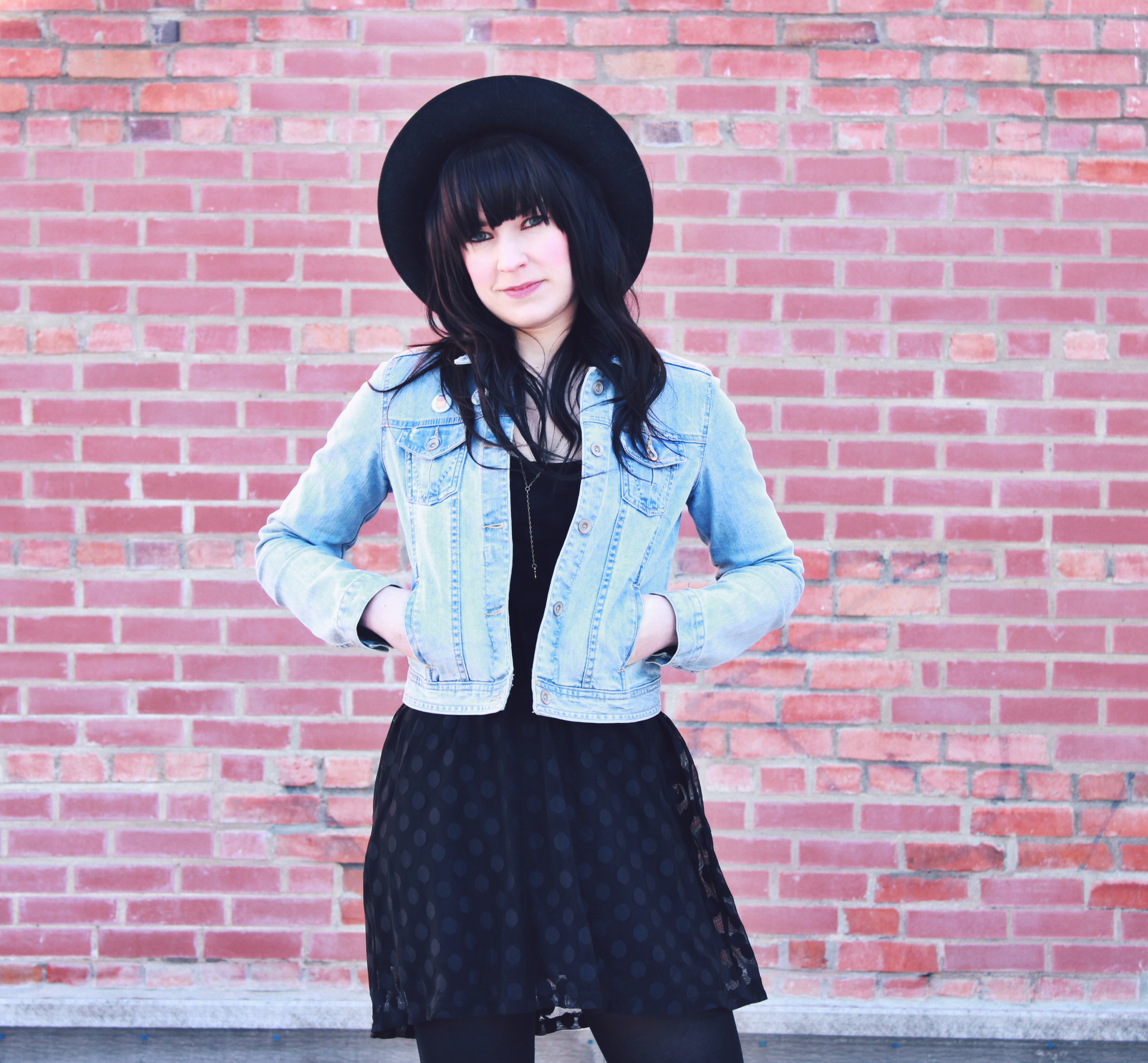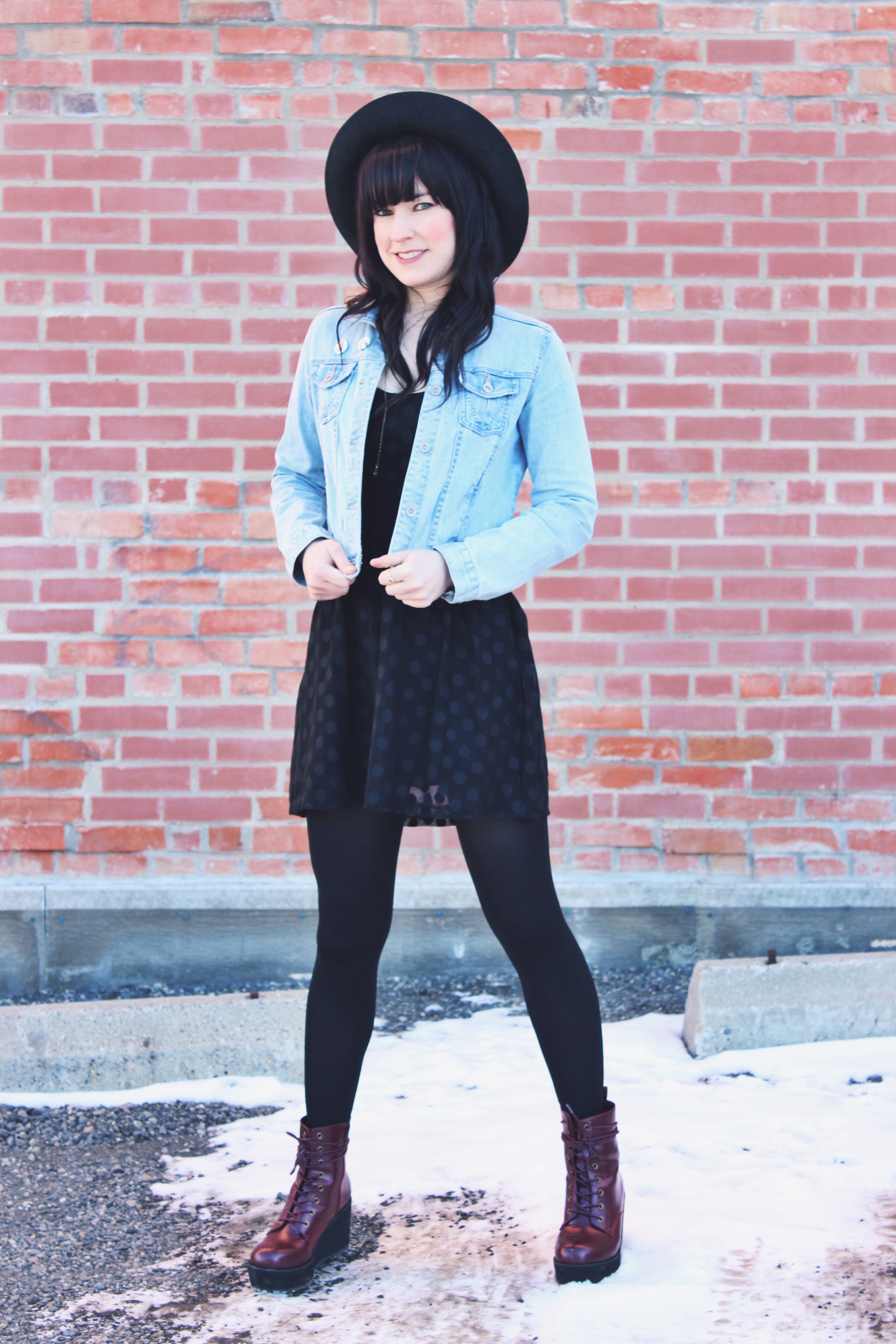 Outfit Details: Hat:Brixton/Denim Jacket: Zara/Dress: Volcom/Necklace: Coutu Kitsch/Tights: H&M/Boots: Shelly’s London
