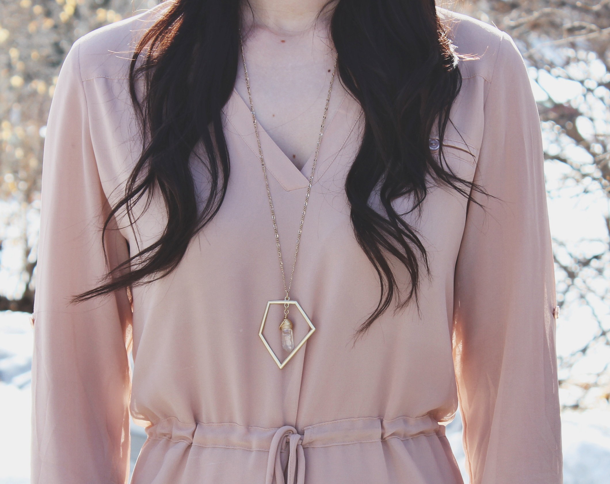 It’s not officially spring yet but It’s actually starting to feel like it is! The sunshine and the warmth in the air just gives me an overall feeling of well being and contentment. It’s so nice to just get outside and soak up some sunshine while you can. For this look i’m wearing a pale pink dress by Naked Zebra. Sometimes I have to be careful with this colour, if it’s too close to my skin tone it can wash me out a little. I find that as long as my makeup is right that doesn’t happen. I thought this dress was perfect to wear with my new quartz necklace by Shesso. It’s so lovely and sparkly, It adds that little something extra to the outfit.