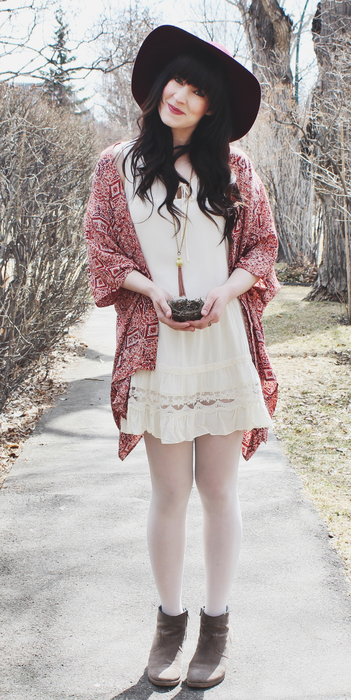 Outfit Details: Hat: Forever 21/Kimono: Forever 21/Dress: Forever 21/Booties: Crown Vintage/Necklace: CoutuKitsch