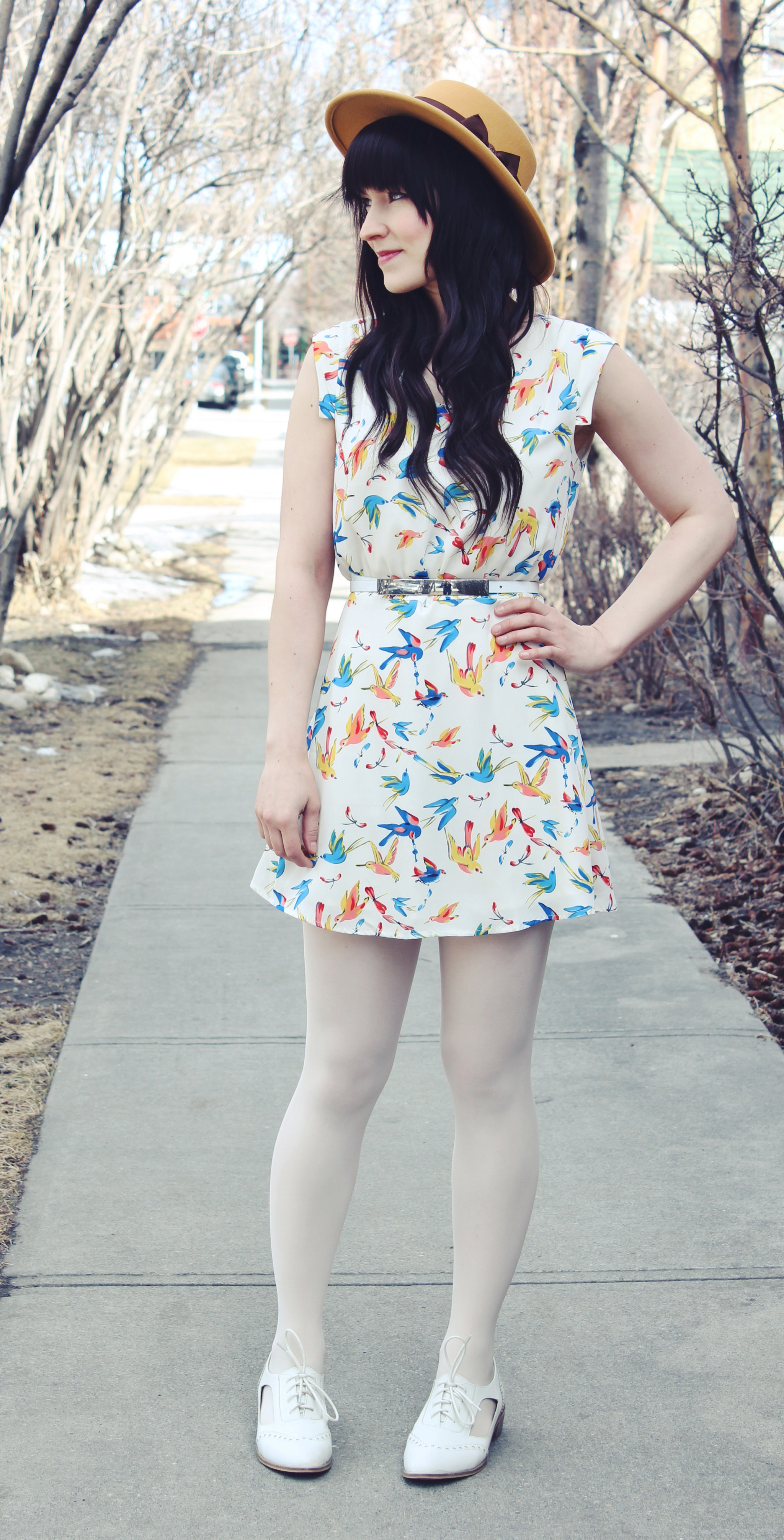 Ever since watching Portlandia, I can’t help but hear Fred and Carrie saying “put a bird on it!” every time I see anything with a bird graphic on it. That is exactly what I thought of when I put on this dress. They put a lot of birds on it! I like a good bird print as much as the next person, even if the show did make it a little difficult to take seriously. To finish off the outfit I added my new Goorin Bros hat. It’s bright and colourful and very different from anything else I own!