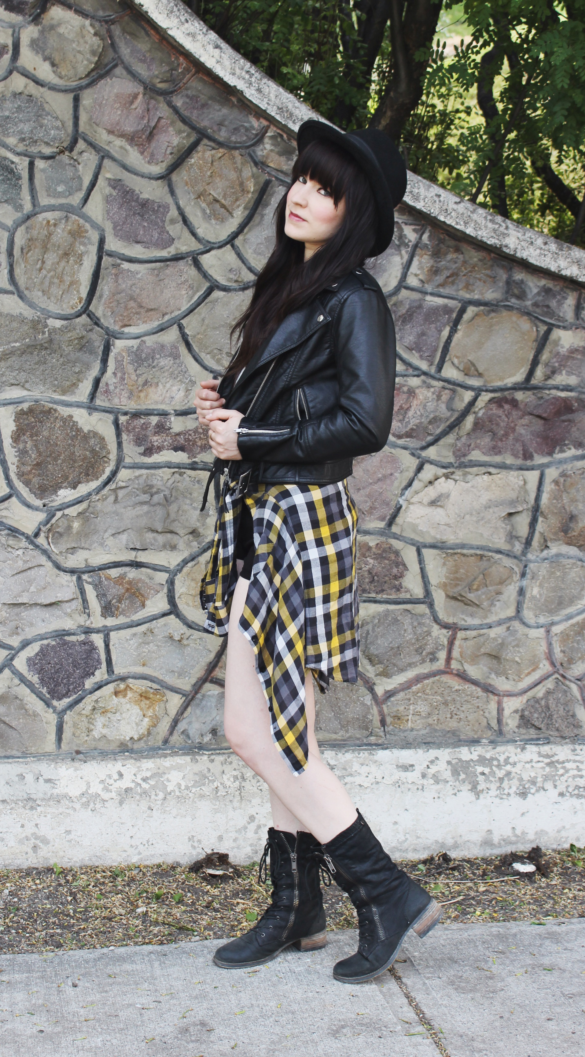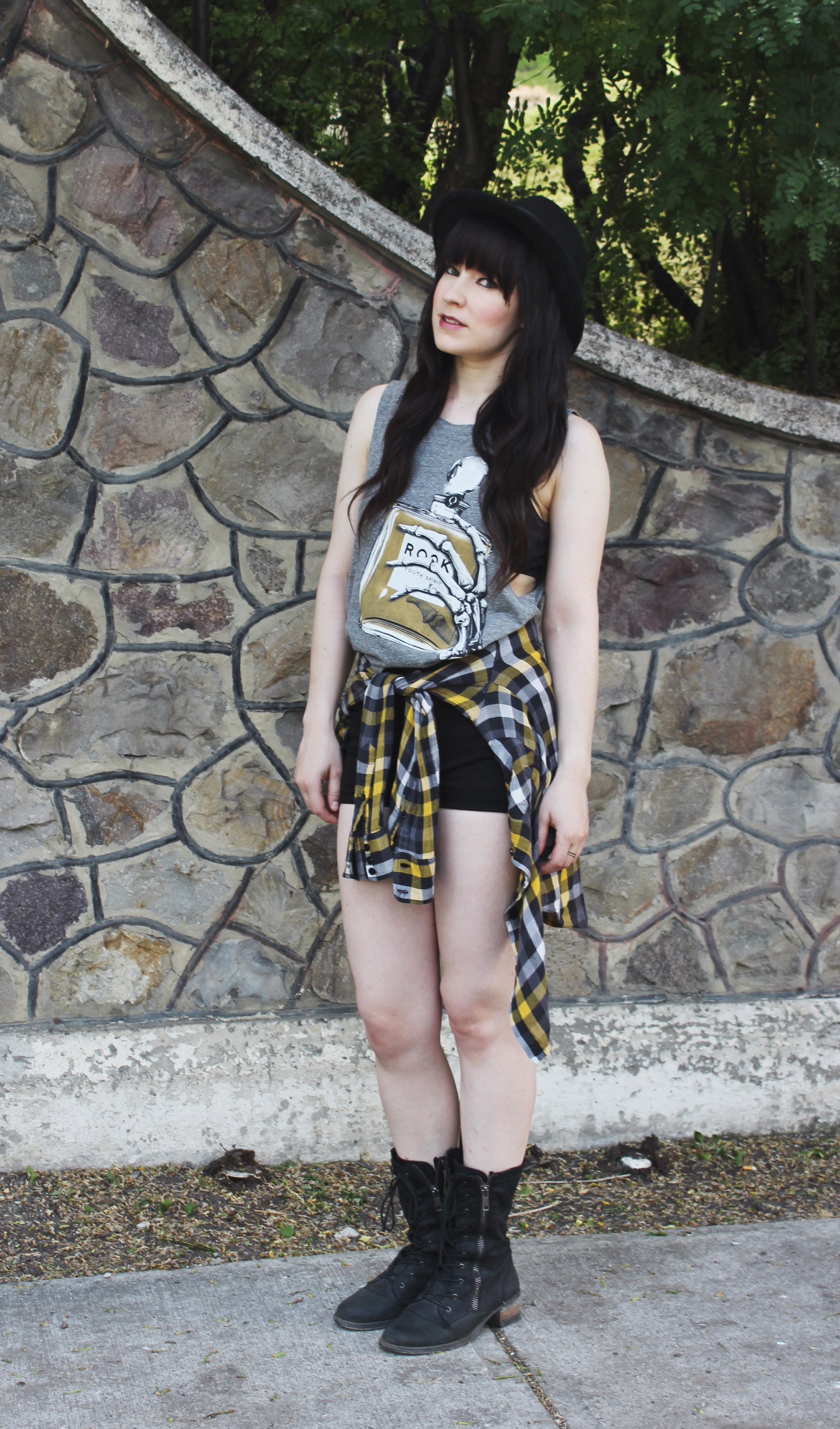 For this look i’m mixing it up a little and wearing something different from what I usually wear. I wanted to do something a little more grunge and 90’s inspired and this is the result. I don’t wear shirts with big graphics on them very often but this one really caught my attention. The company (Rook) just started designing women’s clothing not too long ago and they are killing it in my opinion. So far the graphics have been equally awesome to what they offer for men which isn’t always the case. I’ve found the shirts to have a really nice fit as well. The rest of the outfit consists of some high wasted shorts, a plaid shirt and some Army boots that i’ve owned for a while now.