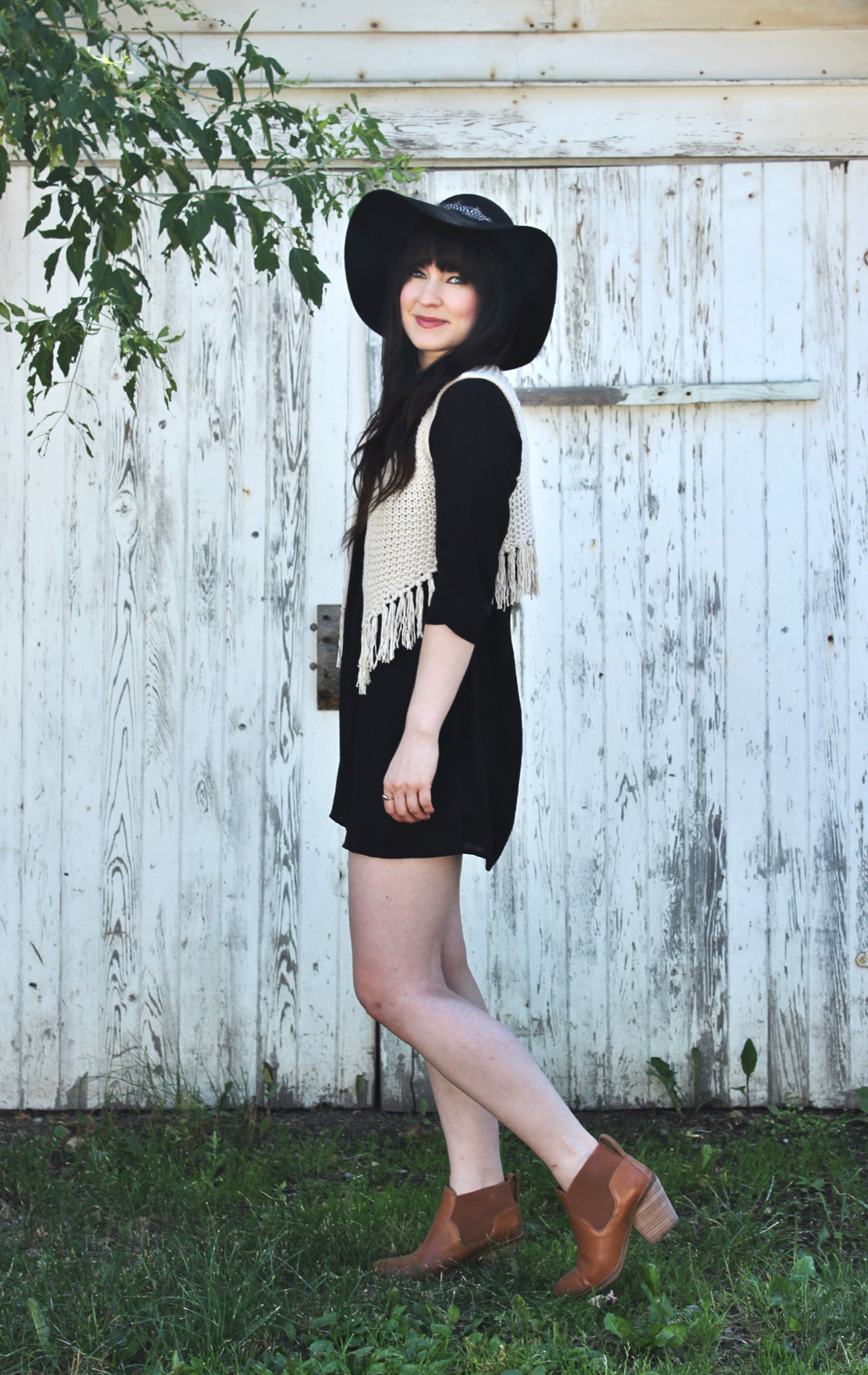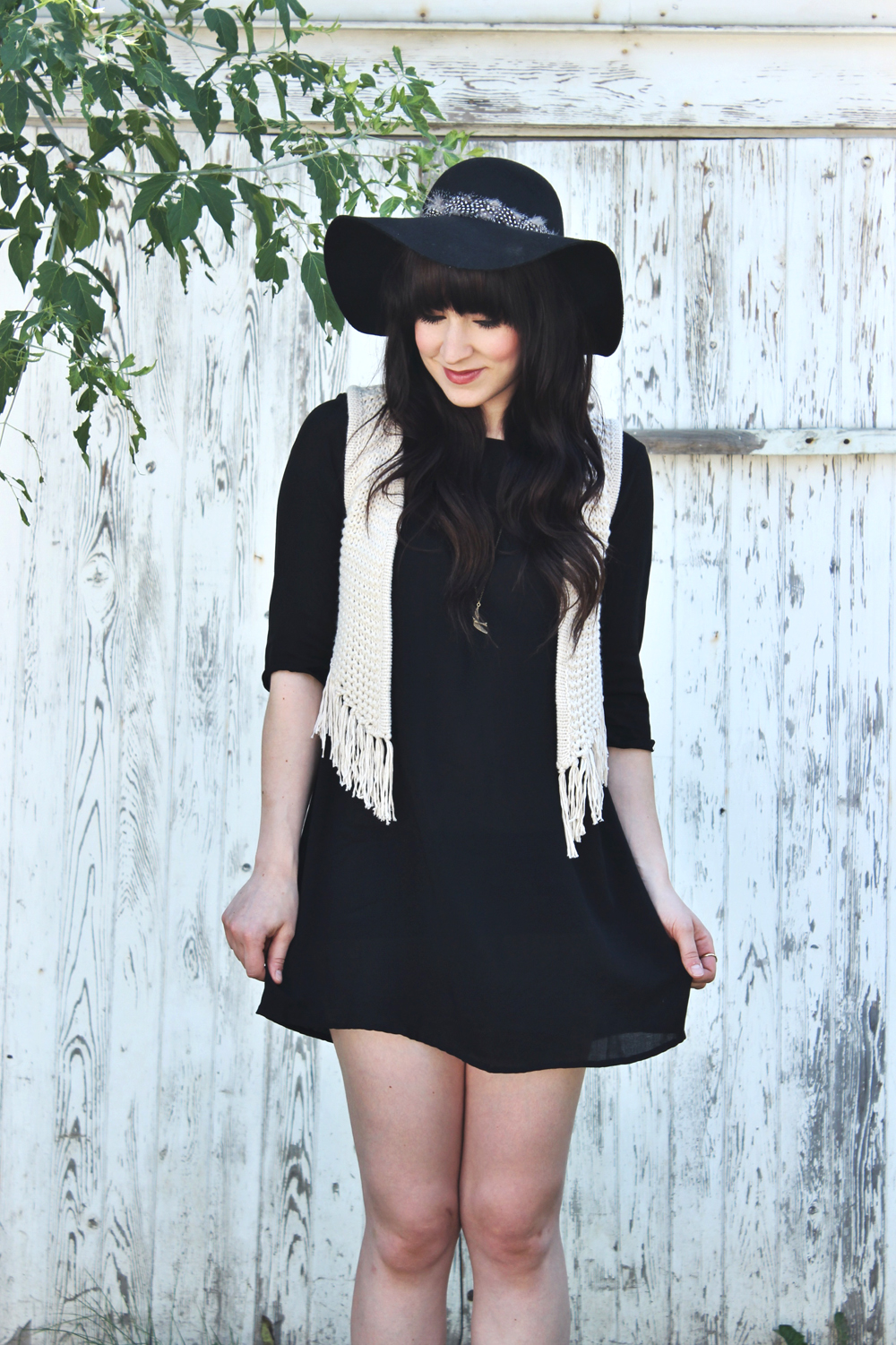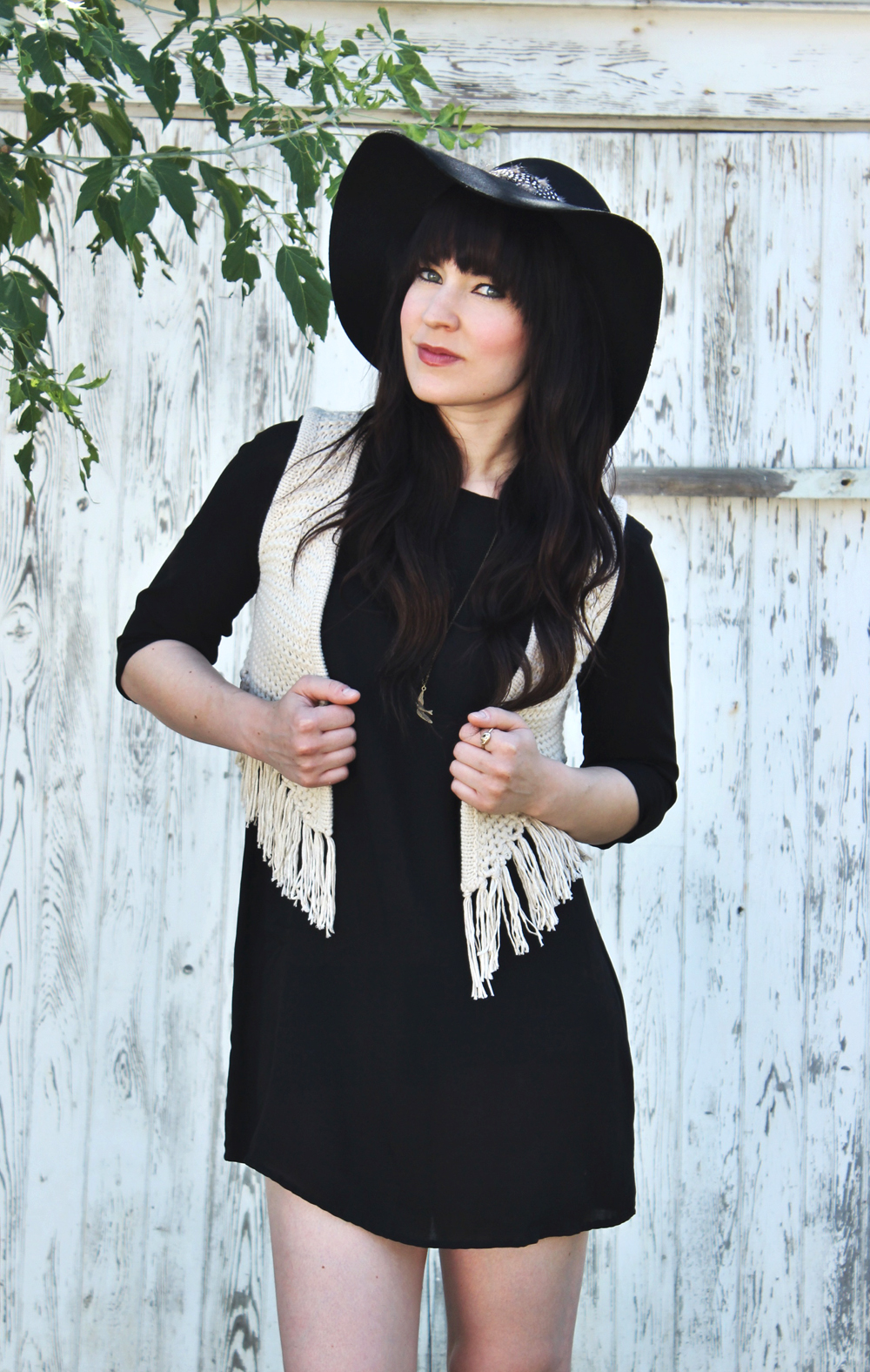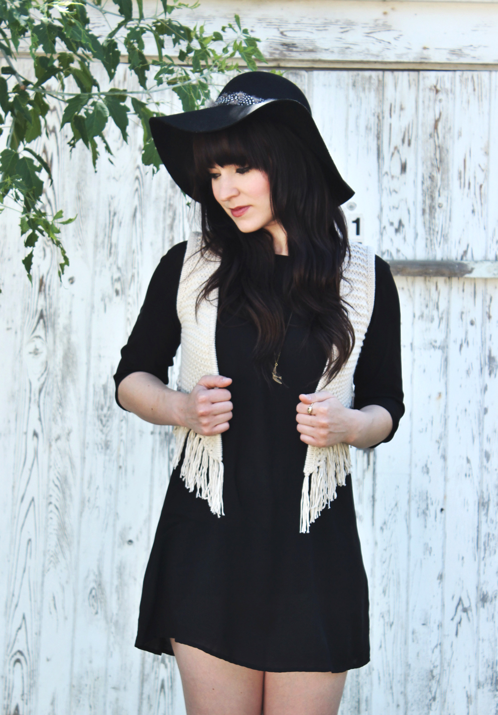 I have to say that recently i’ve become a really big fan of vests. Maybe it’s because i’ve been seeing so many that I like recently, I don’t really know. What I do know is that this knit vest is pretty awesome! It’s such a unique piece and when I saw it I knew I needed to have it. I wanted to pair it with a dress and something with sleeves and I found this black dress from American Apparel that fit that description. It also had a nice shape to it and was black so I knew I would be able to make a lot of different outfits with it. I added a hat and a pair of boots to complete the outfit. This outfit has a bit of a western vibe to it and I kind of like that.