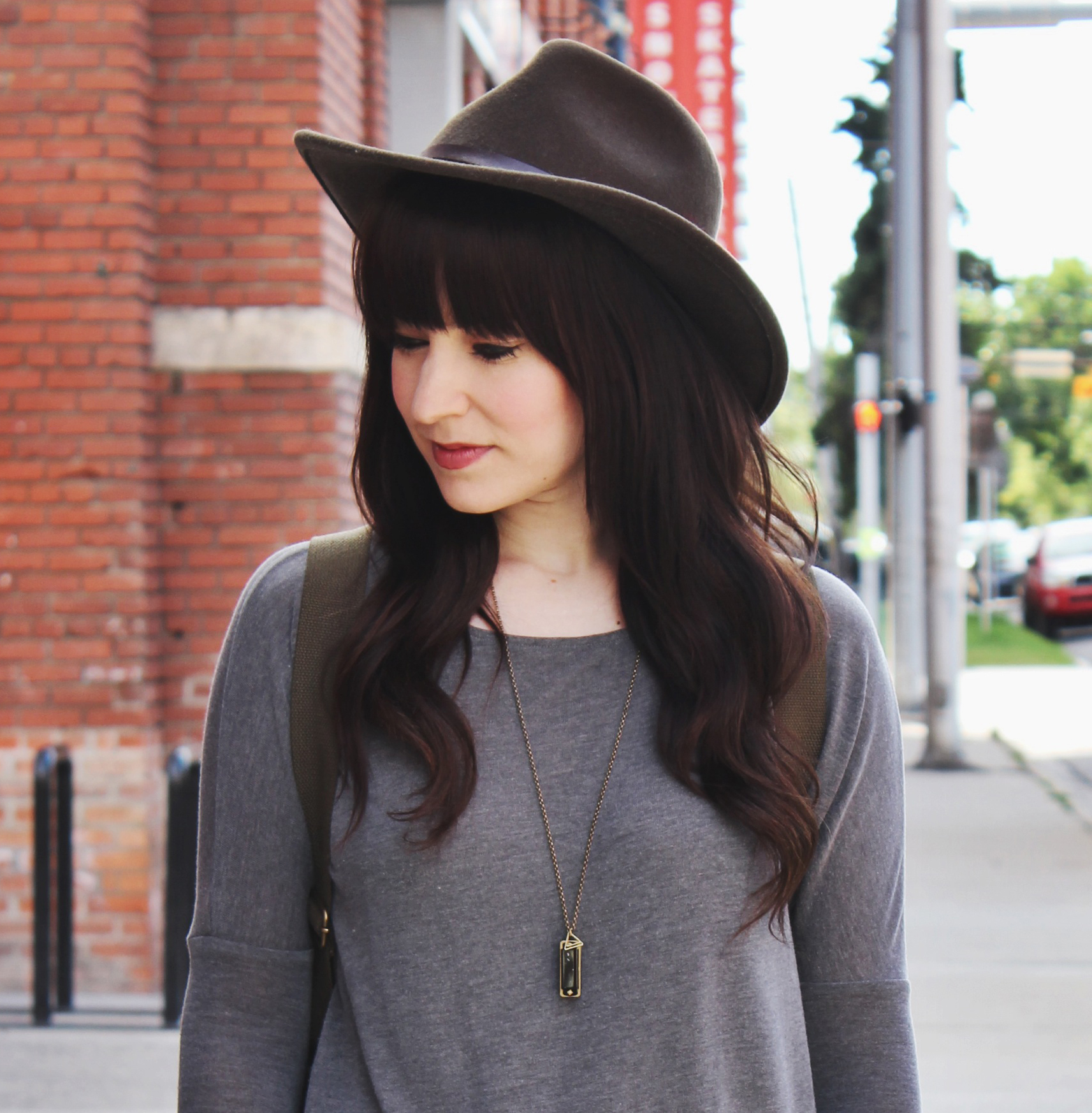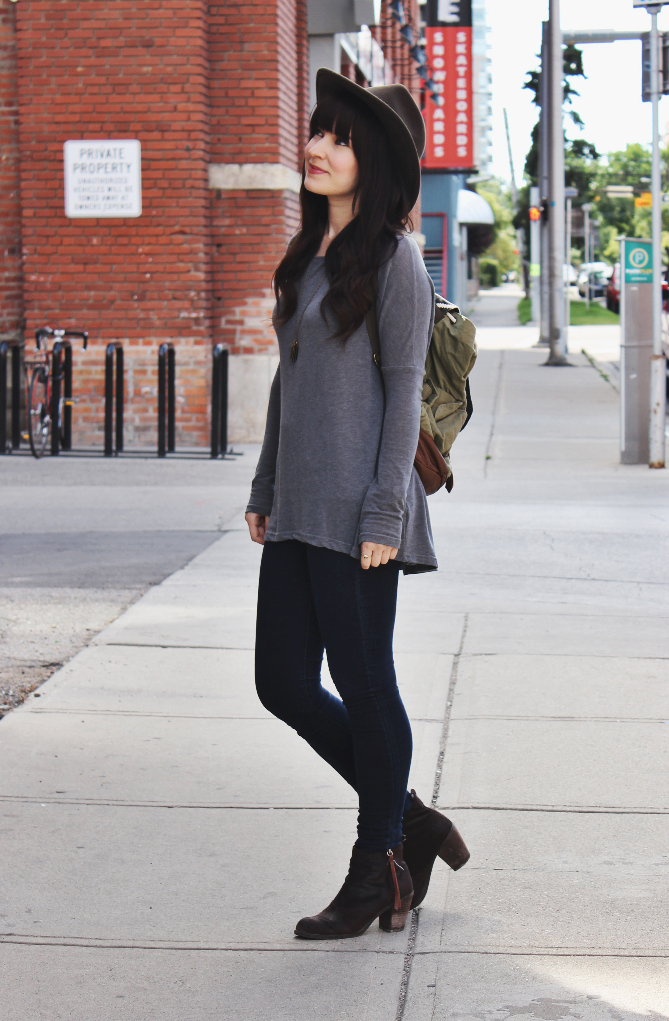 I have a new favourite accessory, this backpack. I love the colour, the style and how much room it has for all of my stuff. I used it last weekend at a music festival and it did a great job of holding all of the random things I brought with me. For the rest of the outfit I wore my favourite oversized long sleeve shirt. This is a style I’m really hoping sticks around this year. Oversized shirts and sweaters are just so comfortable for fall and winter! To balance the looser fit of the shirt I paired it with my favourite dark denim skinny jeans. I also wore a pair of suede ankle boots to keep the outfit from being too casual.