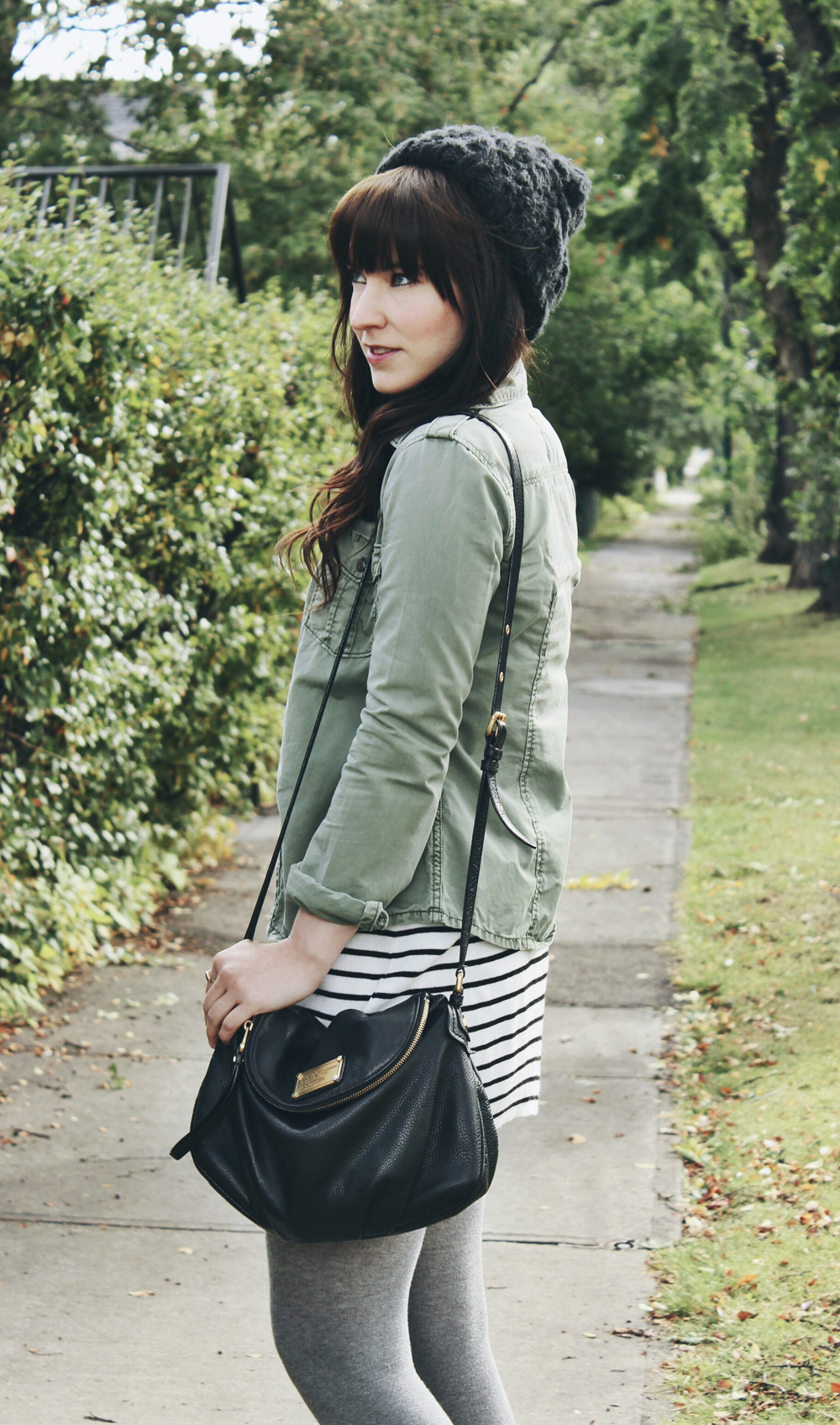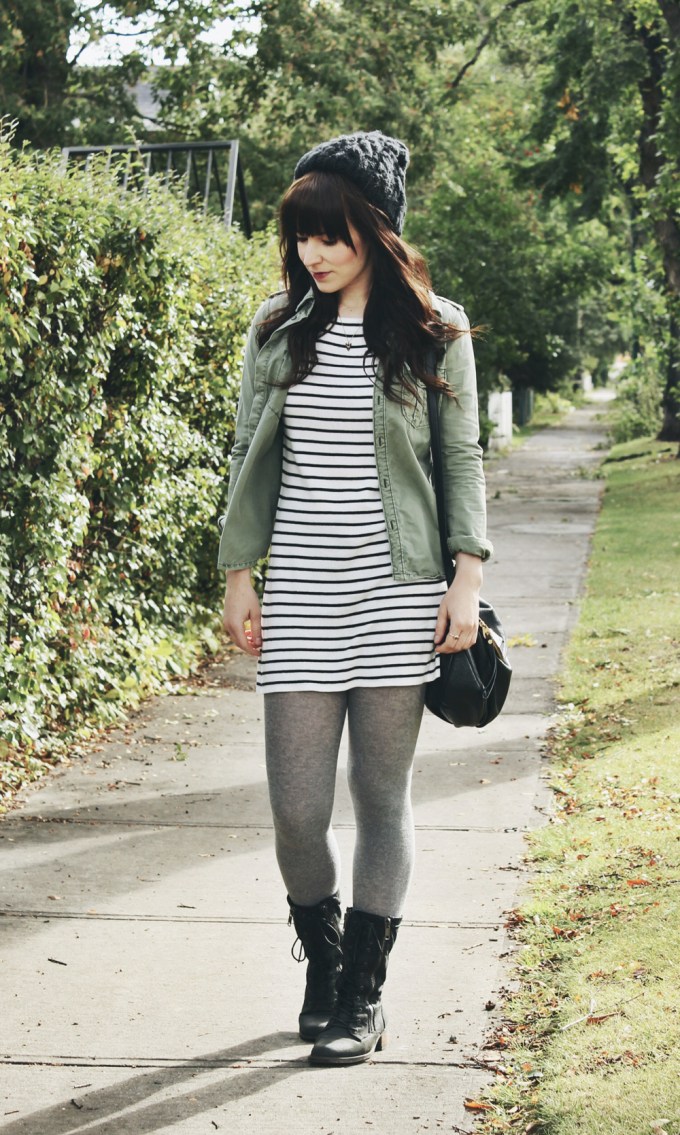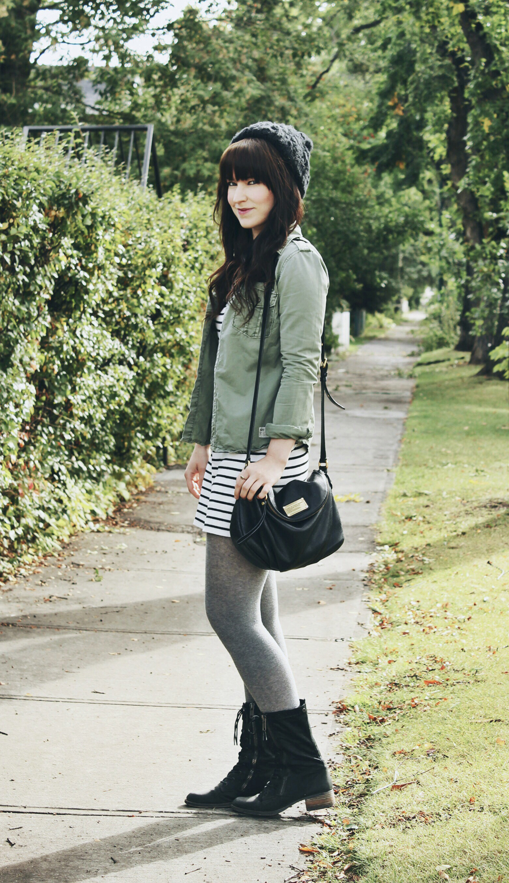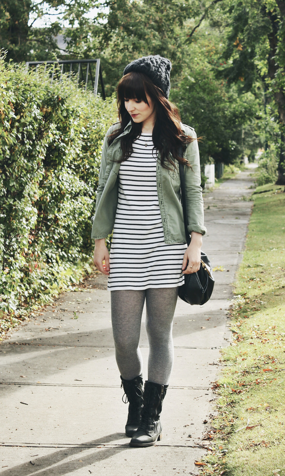 The first item is this military style button down. As long as it’s well fitting, military style clothing is something that always seems to comes back in style, so as long as the item is good quality you’ll be able to wear it for many years. The second item is this nautical style striped dress. Nautical is another style that doesn’t seem to ever go out of fashion. The third item is a black leather purse. Although it’s nice to have a few different options for purses it’s good to have at least one basic and good quality purse that is good for everyday use. The last item that I consider a staple is a nice pair of black boots. I’ve owned these for years now and i’ve never gotten sick of them. They’re a classic military style boot and they’re also very comfortable.
