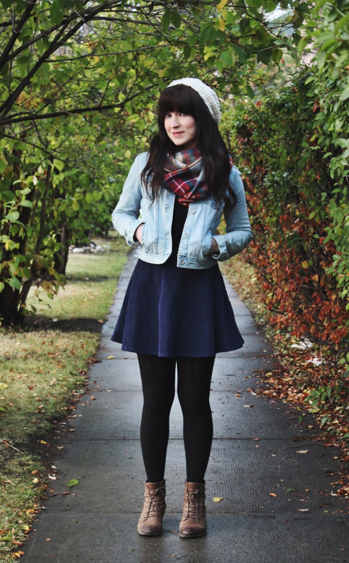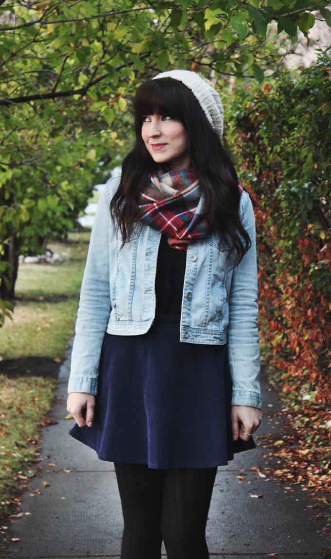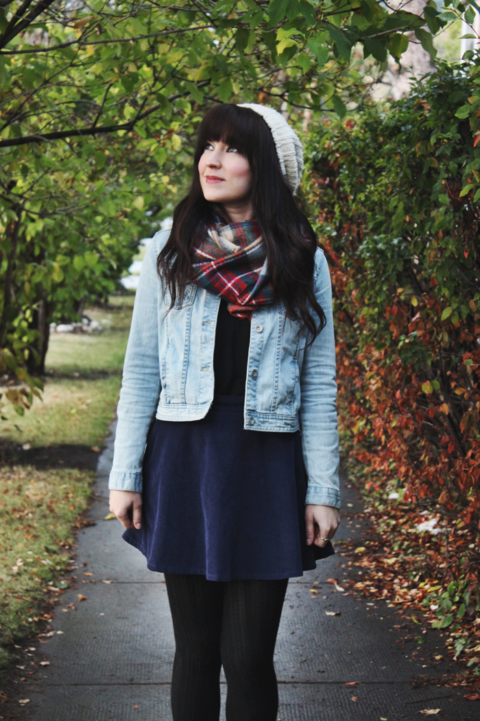 One thing that I love about fall fashion is all the soft and cozy items that are available. This plaid scarf is very soft and very cozy and I love that! I also like that it adds more colour and interest to this outfit. I made sure that I got it in a colour way that matches my winter coats so that come winter time I’ll be able to wear it a lot . The rest of the outfit is pretty basic, a jean jacket and a blue corduroy skirt.