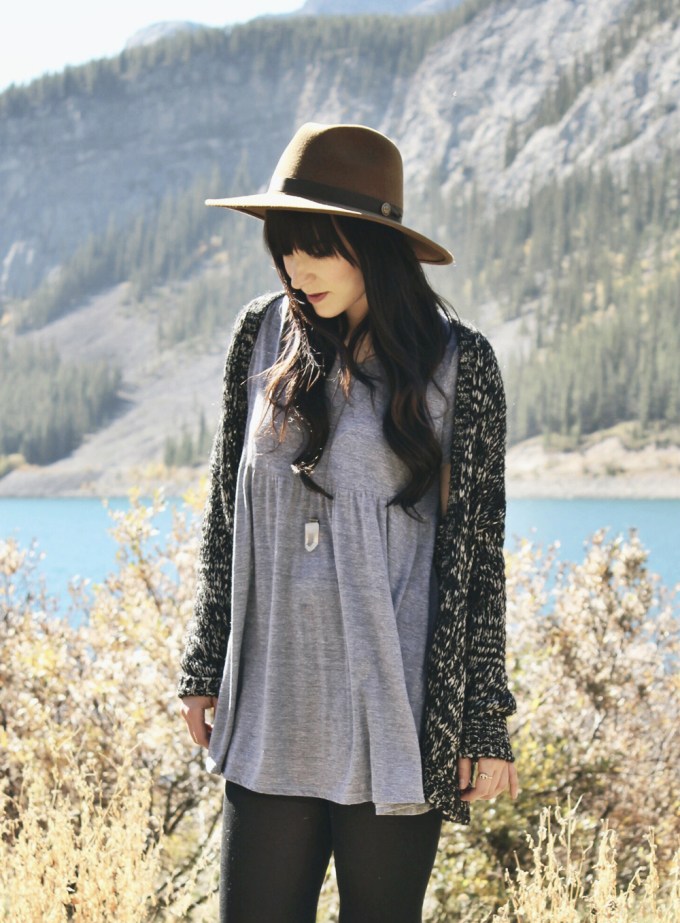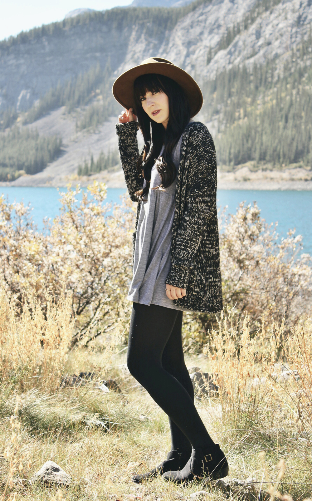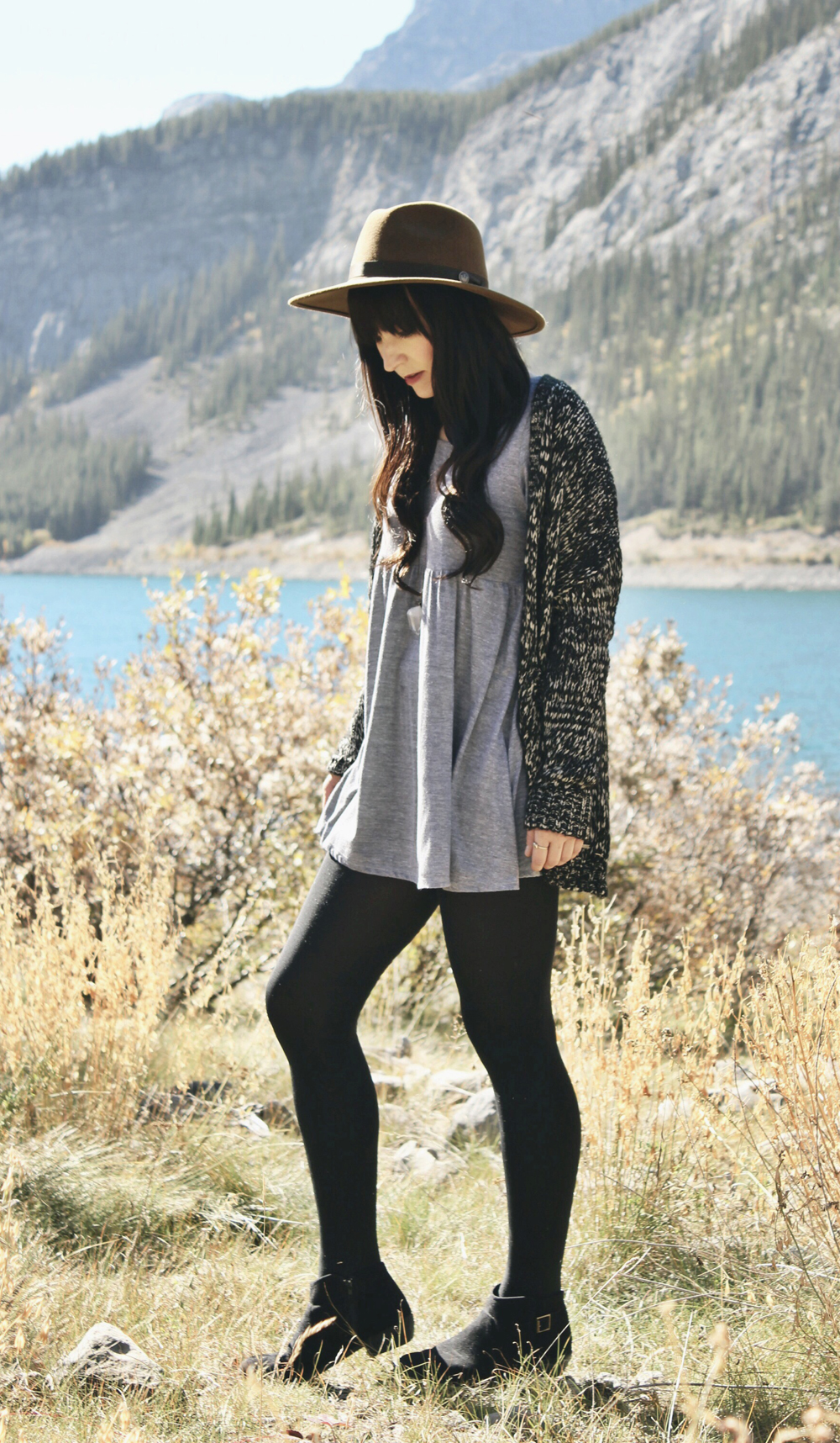 Outfit Details: Hat: Goorin Bros / Cardigan: Volcom / Dress: American Apparel / Necklace: Shesso / Boots: Forever 21