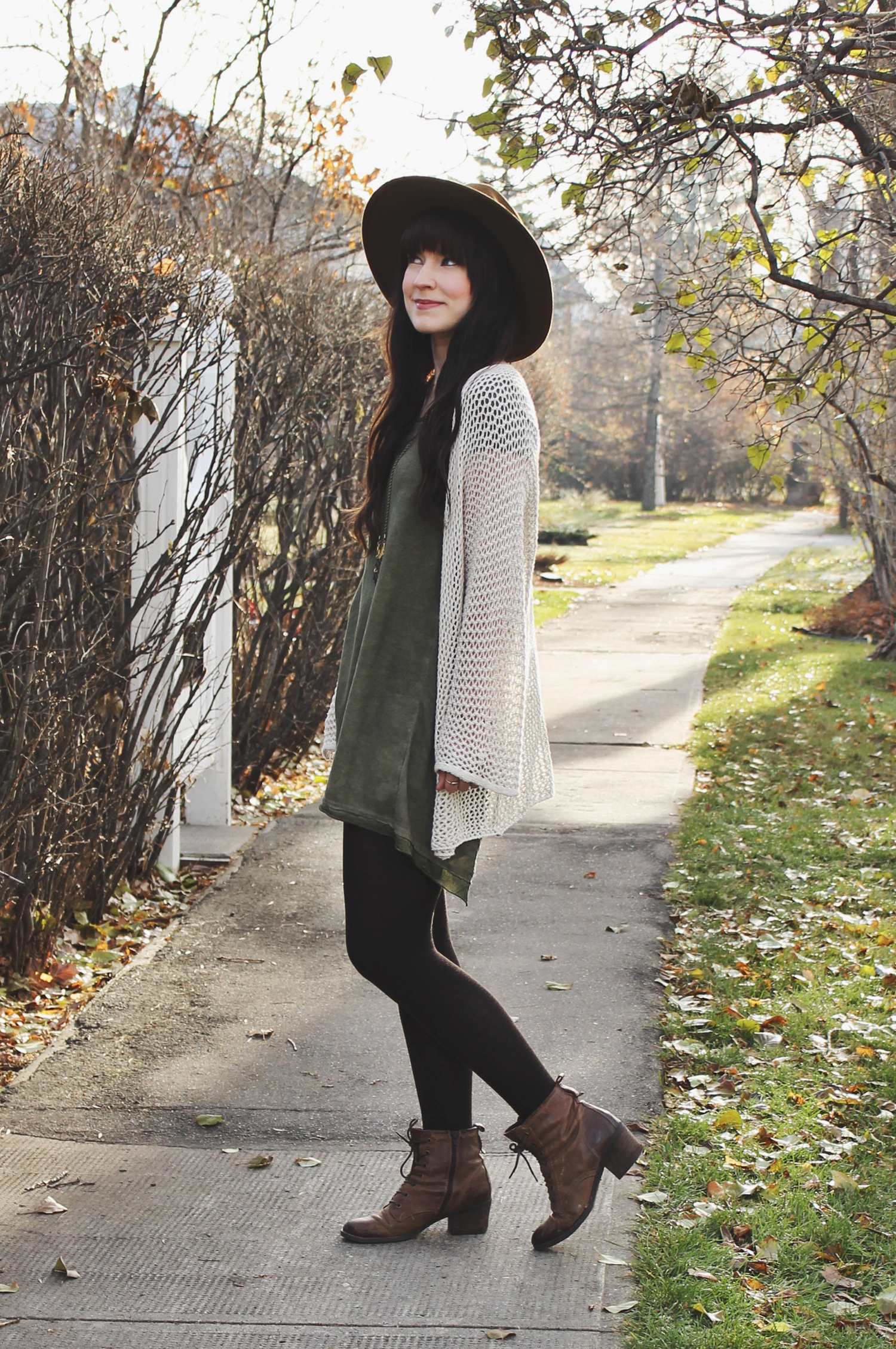 Outfit Details: Hat: c/o Goorin Bros / Dress: c/o Others Follow / Cardigan: Brandy Melville / Necklac: c/o Foxy Originals / Boots: Little Burgundy / Tights: H&M