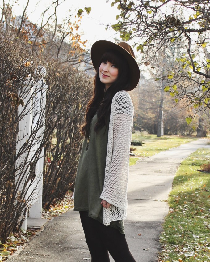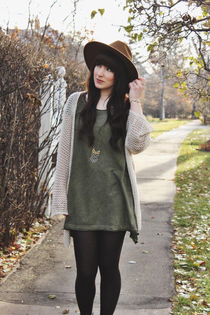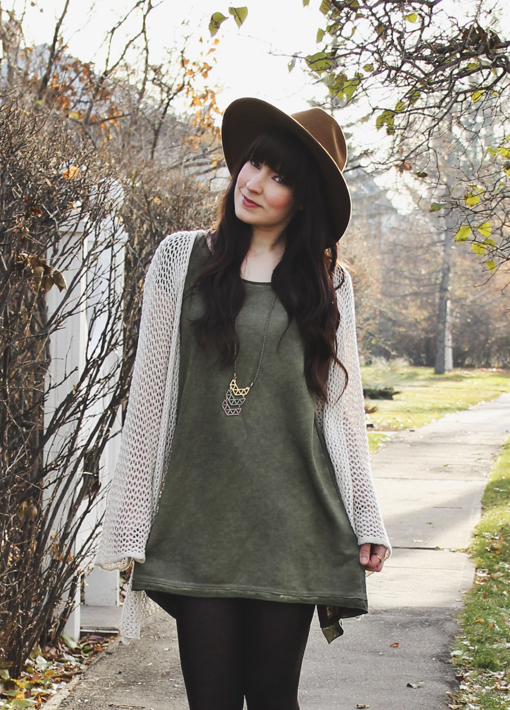 I’m starting to realize that I really enjoy earthy tones when it comes to my wardrobe. Green, brown and ivory tend to be my favourite colours and luckily for me they all go really well together. This outfit is a prime example of that. When a lot of items in your wardobe can be mixed and matched it makes it really easy to make outfits. I always try to keep in mind how well a new piece will fit in with the rest of my wardrobe when shopping. This dress by Others Follow is a prime example of a piece that fit into my wardrobe perfectly! I’m also really excited about my new necklace by Foxy Originals, it’s something I can wear with a lot of different outfits and I like that!