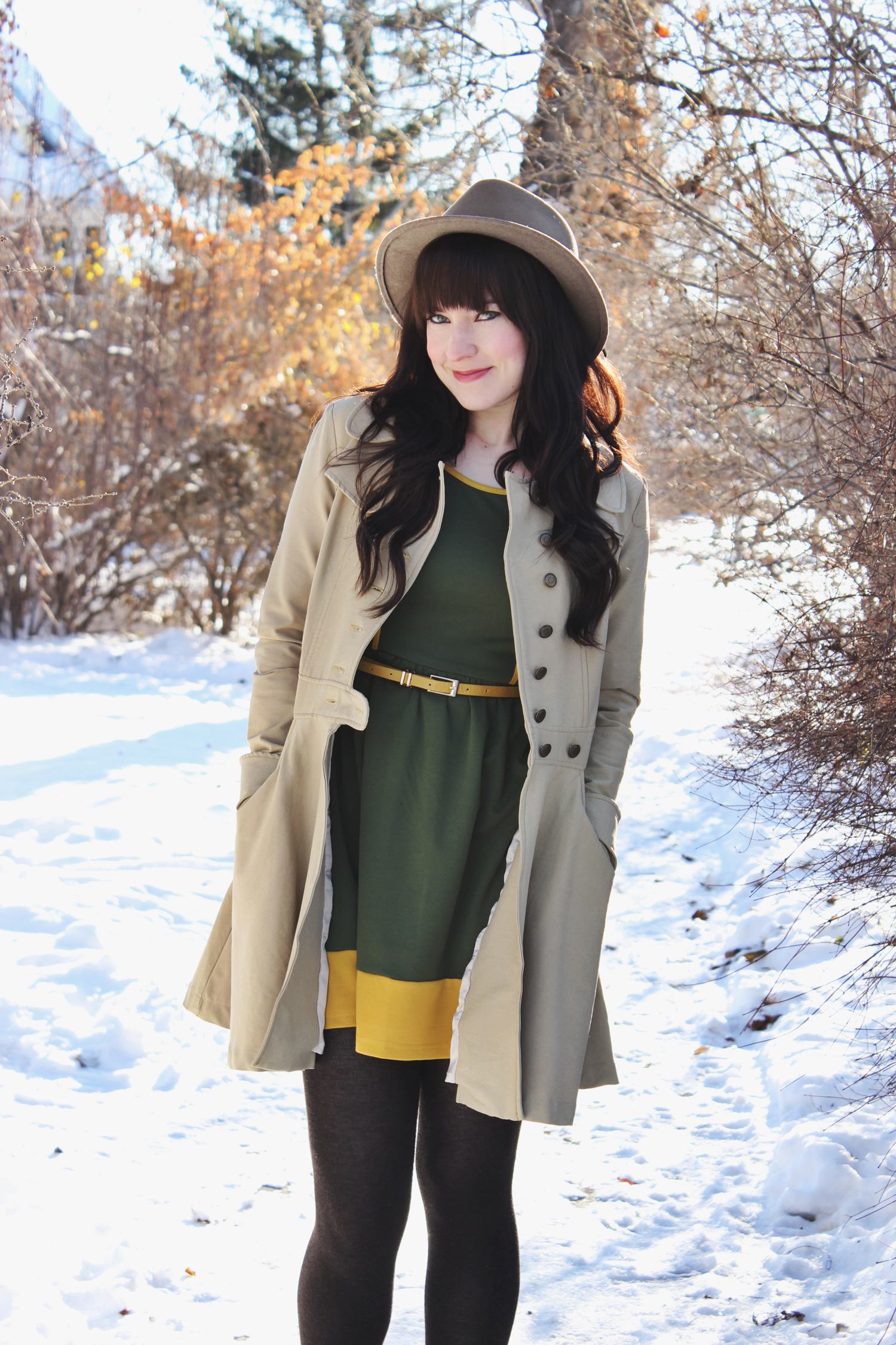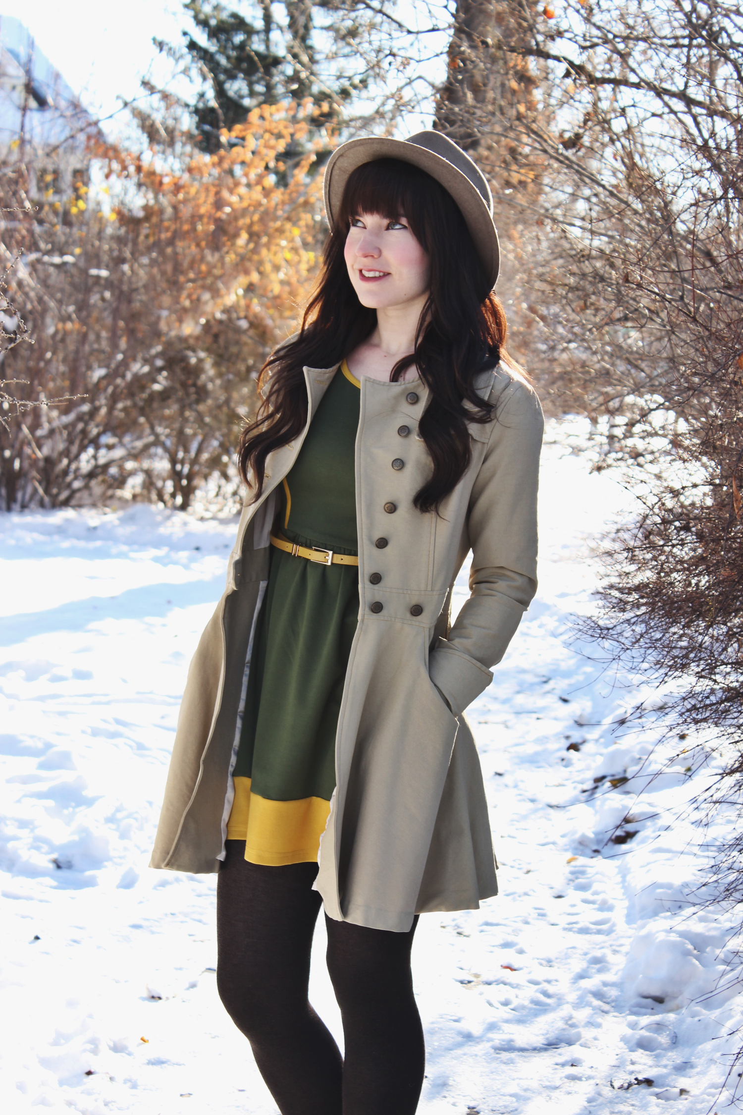 Outfit Details: Hat: Goorin Bros / Coat: Nick & Mo / Dress: C/O Avenle / Shoes: Spring / Tights: H&M