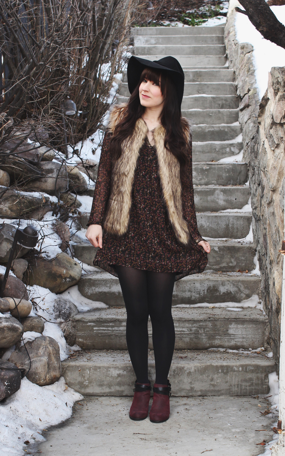 Outfit Details: Hat: Free People / Dress: Forever 21 / Vest: Forever 21 / shoes: Dolce Vita