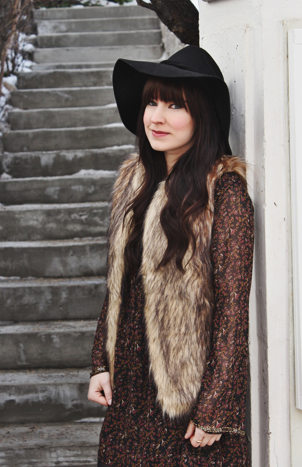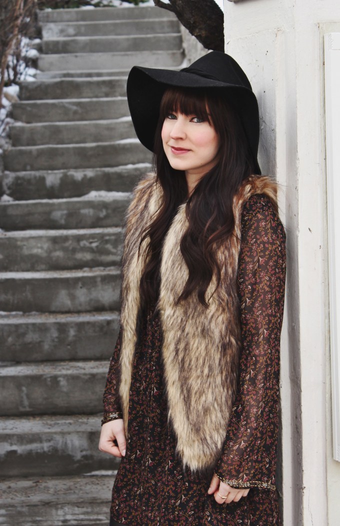This outfit is pretty different from what I usually wear and I love it! I don’t know what it is about them but I just really wanted a faux fur vest this year. I’ve seen a lot of different styles of vests out there but something about the colour and texture of this one drew me to it. I like that its a little glamorous but cool at the same time. It’s not something I would wear everyday but on those days I do wear it I feel very fancy!