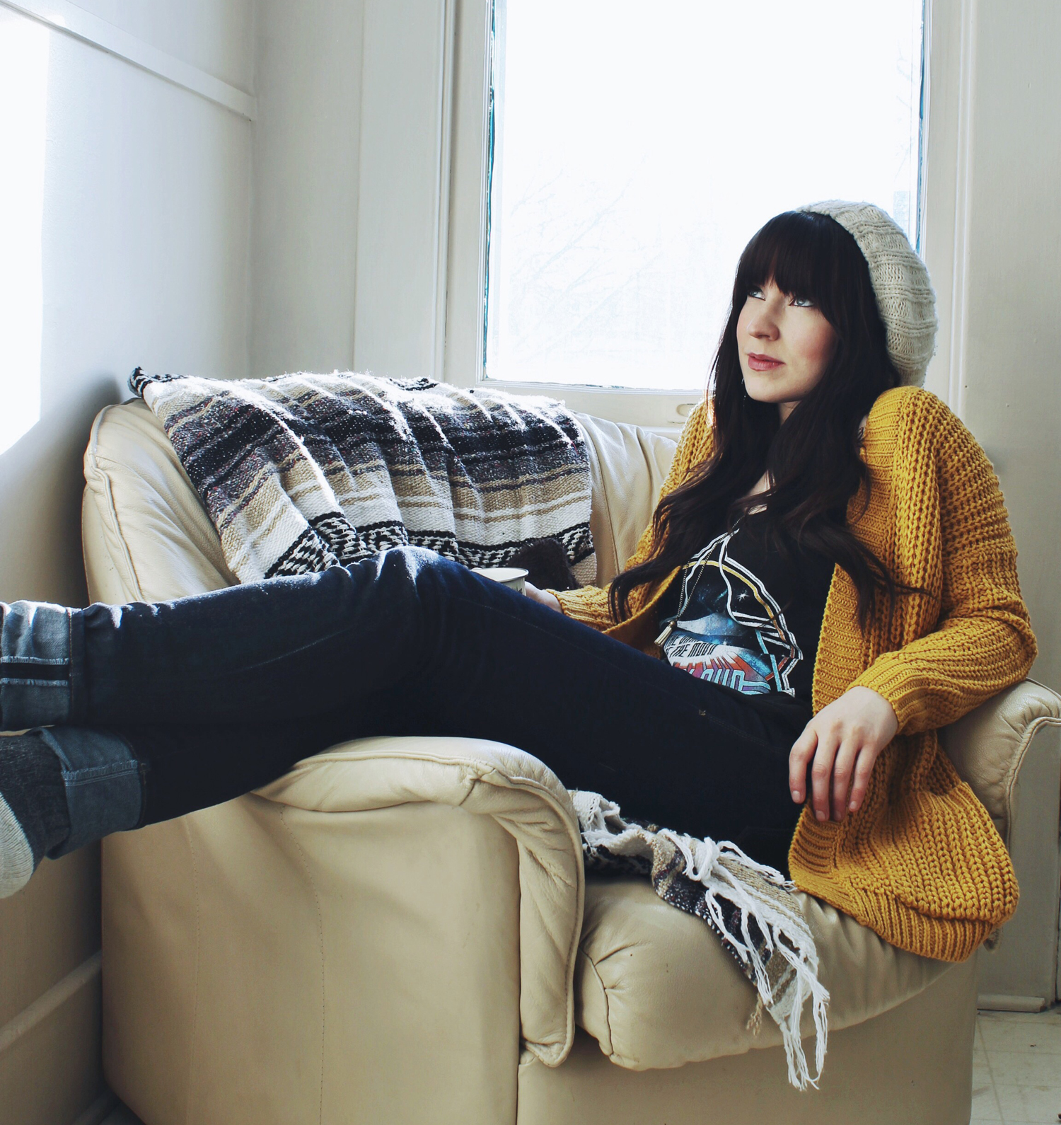 We’ve been having a bit of a cold spell here in Calgary. Lots of snow and some very low temperatures have made it hard for me to take photos. For this look I decided it was best to stay inside where it is warm and cozy. This outfit is perfect for cold days and lazy Sundays spent hanging around the house. This new cardigan from forever 21 is probably one of my absolute favourites! I love the colour mustard yellow and for the longest time i’ve been searching for a cardigan in this exact shade. Forever 21 has been a very reliable source for all kinds of cardigans lately.