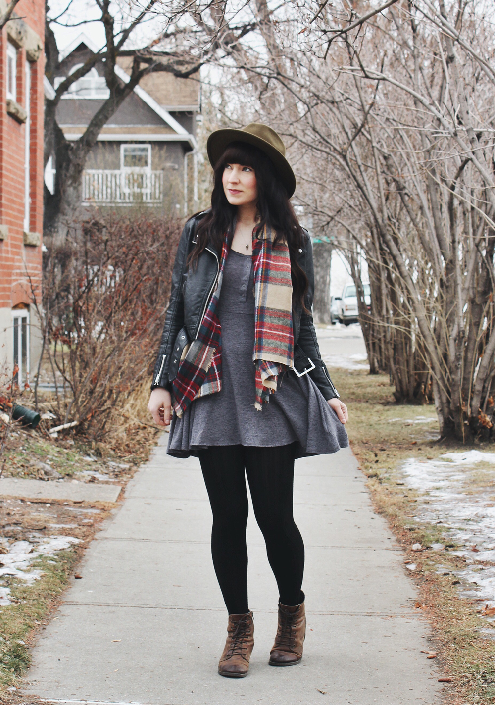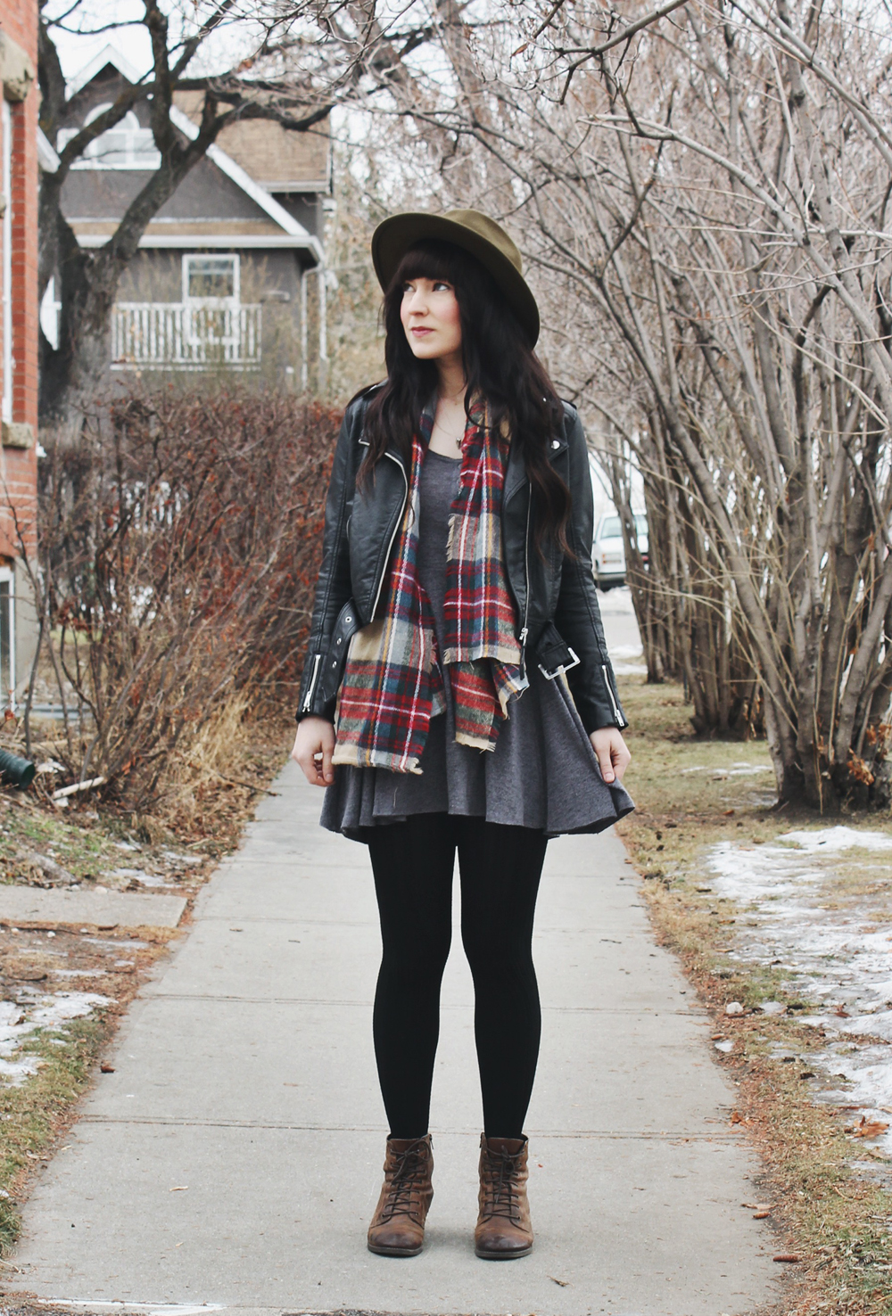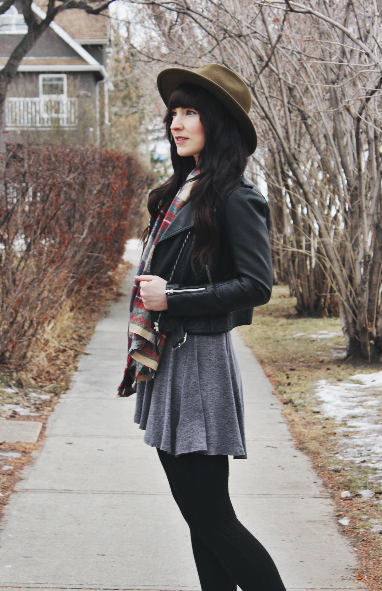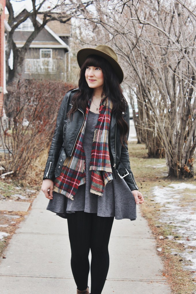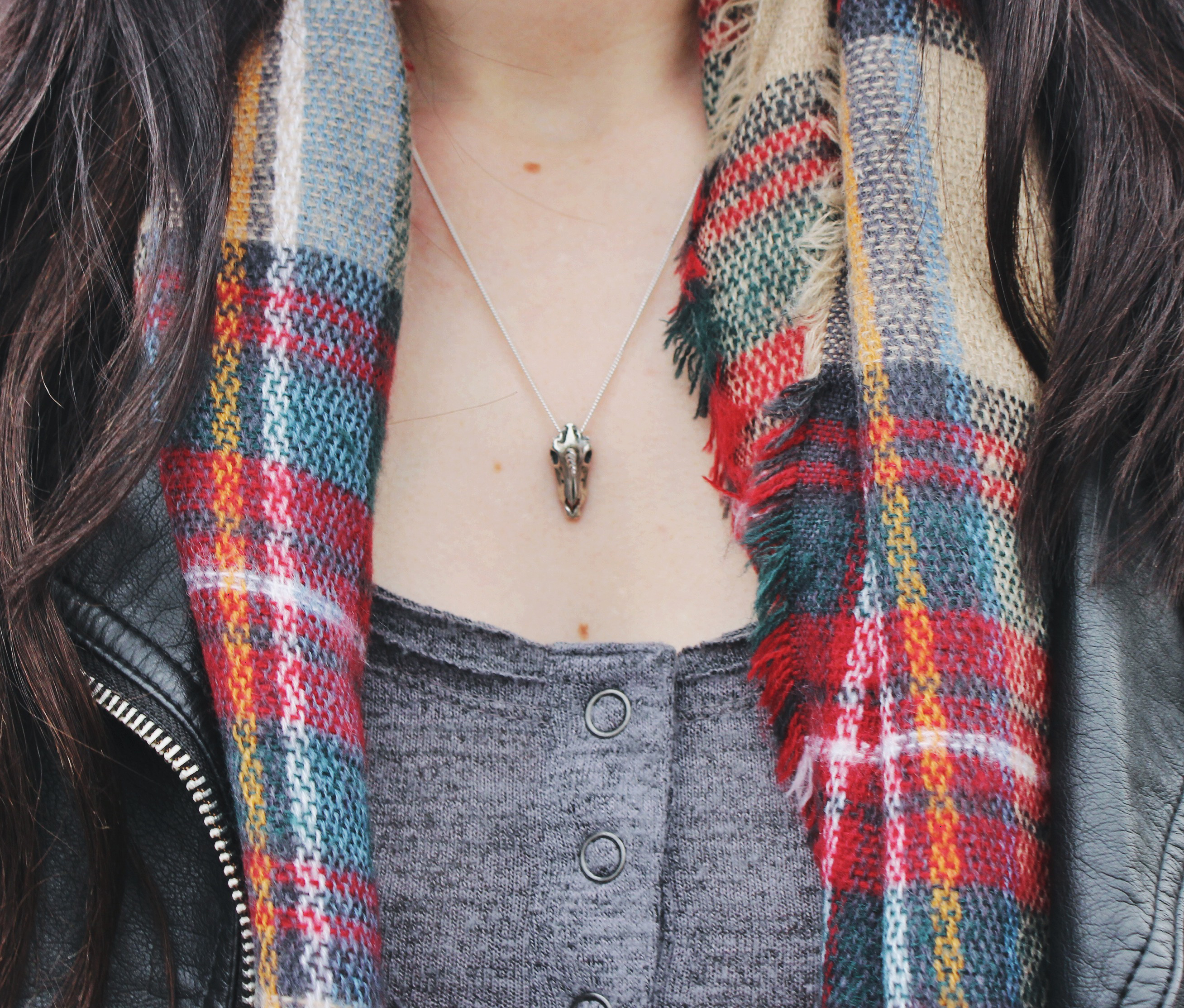 It’s actually been pretty warm out lately here in Calgary. This makes me very happy because it means I have a little more freedom in my outfit choices, instead of just going with the warmest option. This outfit is a great example of that, I was able to wear a leather jacket instead of a parka and still be warm! I did however add this plaid scarf for a little extra warmth. I’m also really really excited about this new necklace from Katz&Dahl.ย It’s a unicorn skull, how freak’n cool is that?! I’ve been wearing it a lot lately because i’m pretty obsessed with it!