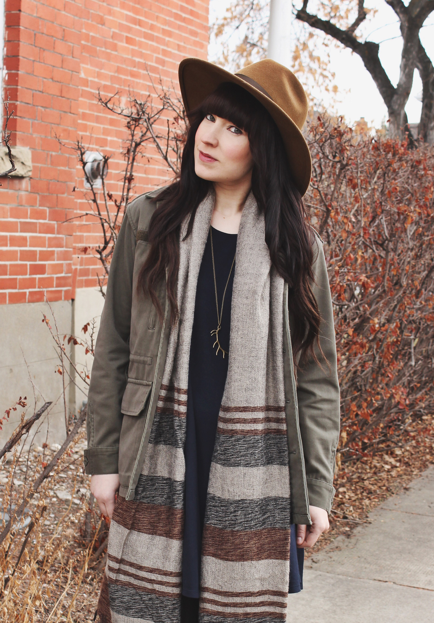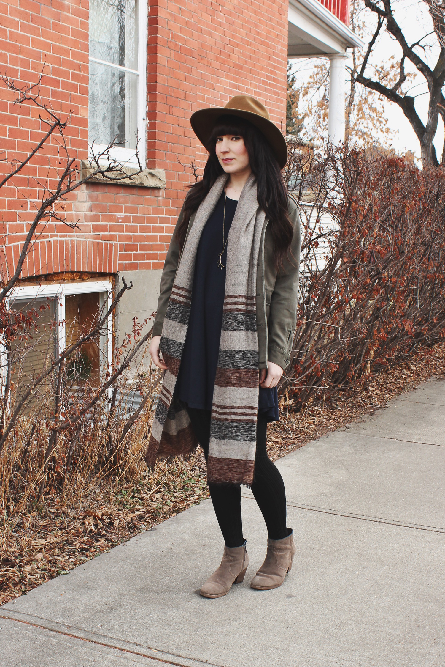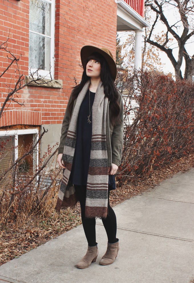 Outfit Details: Hat: C/O Goorin Bros / Jacket: Aritzia / Dress: Brandy Melville / Scarf: Urban Outfitters / Necklace: C/O Coutukitsch