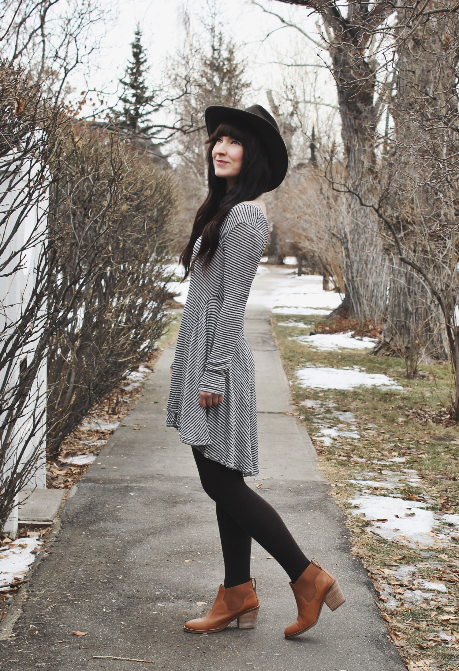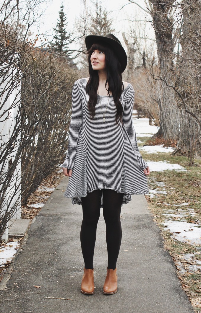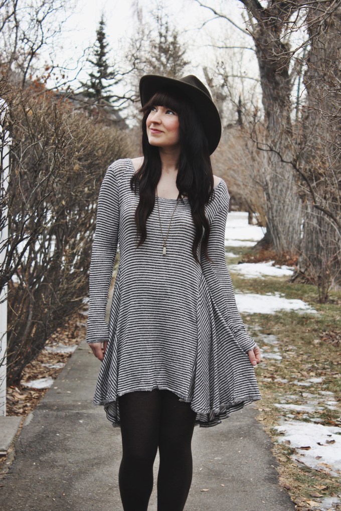 It’s common knowledge that i’m a suck for a good dress. This trapeze dress from Urban Outfitters is no exception. This cut is just so flattering that I find my self drawn to most dresses that have it. I wanted to keep this outfit relatively simple so I Just added a pair of tights and boots and one of my favourite western style wide brim hats. I also added my favourite tassel necklace by Coutukitsch.