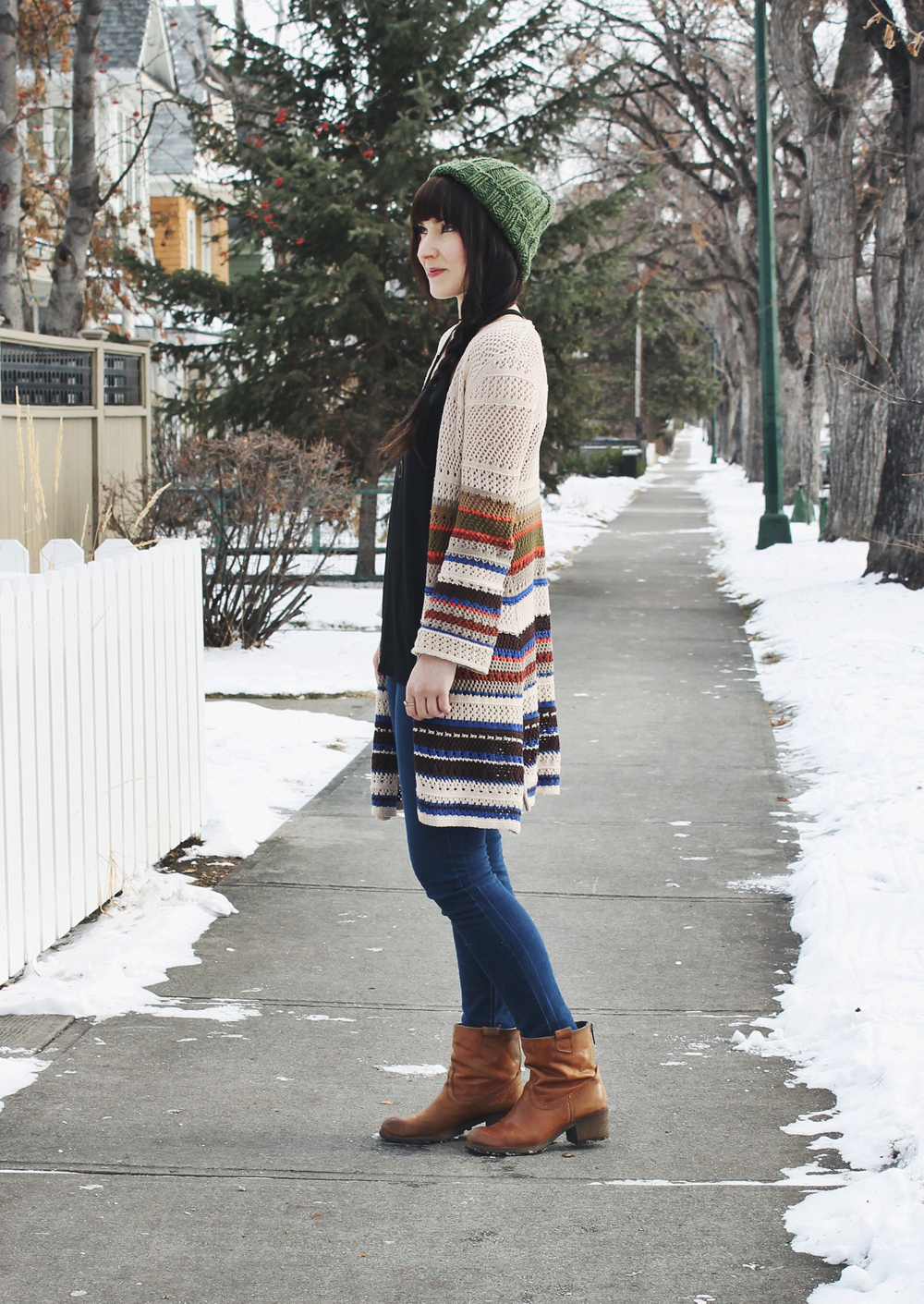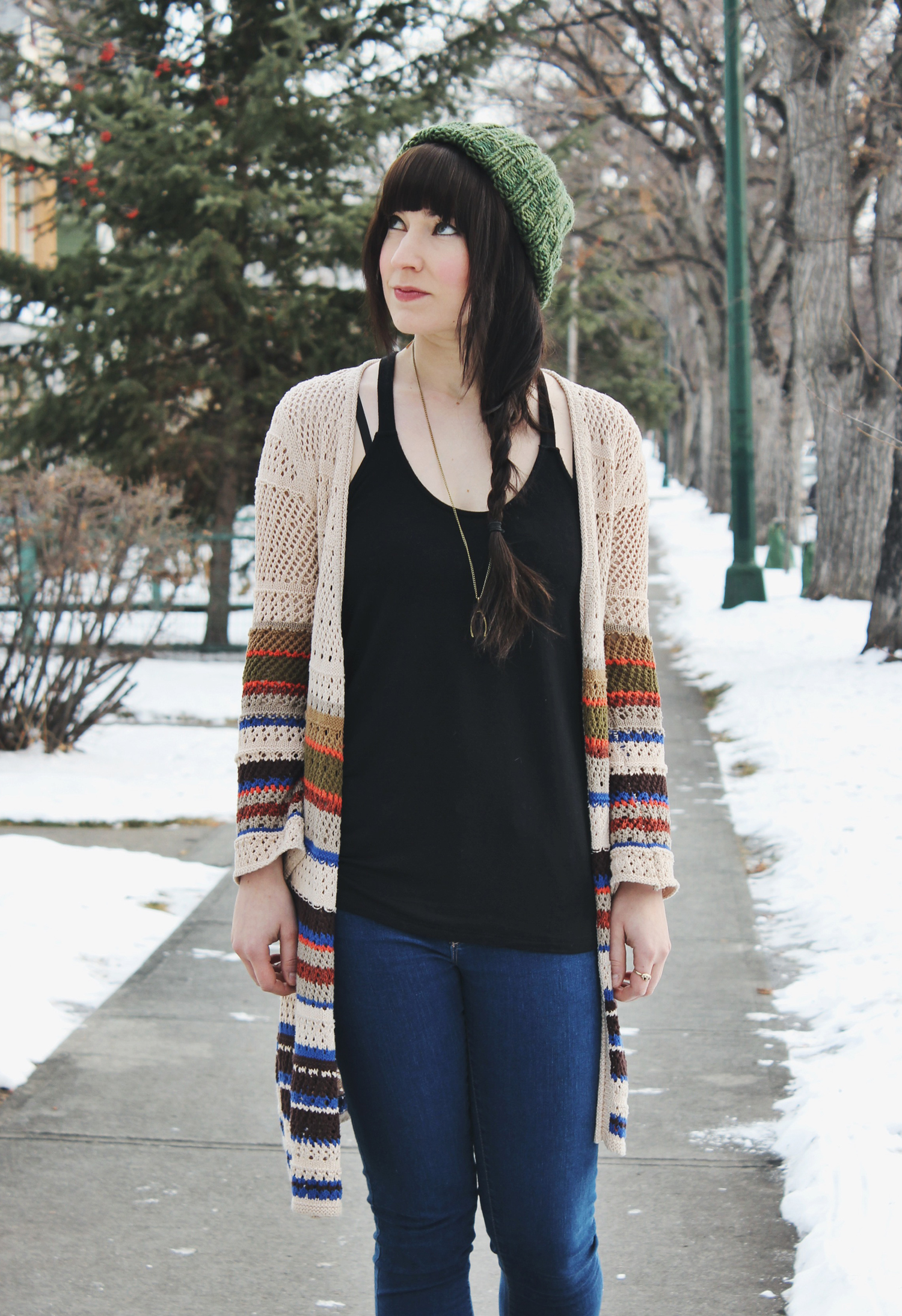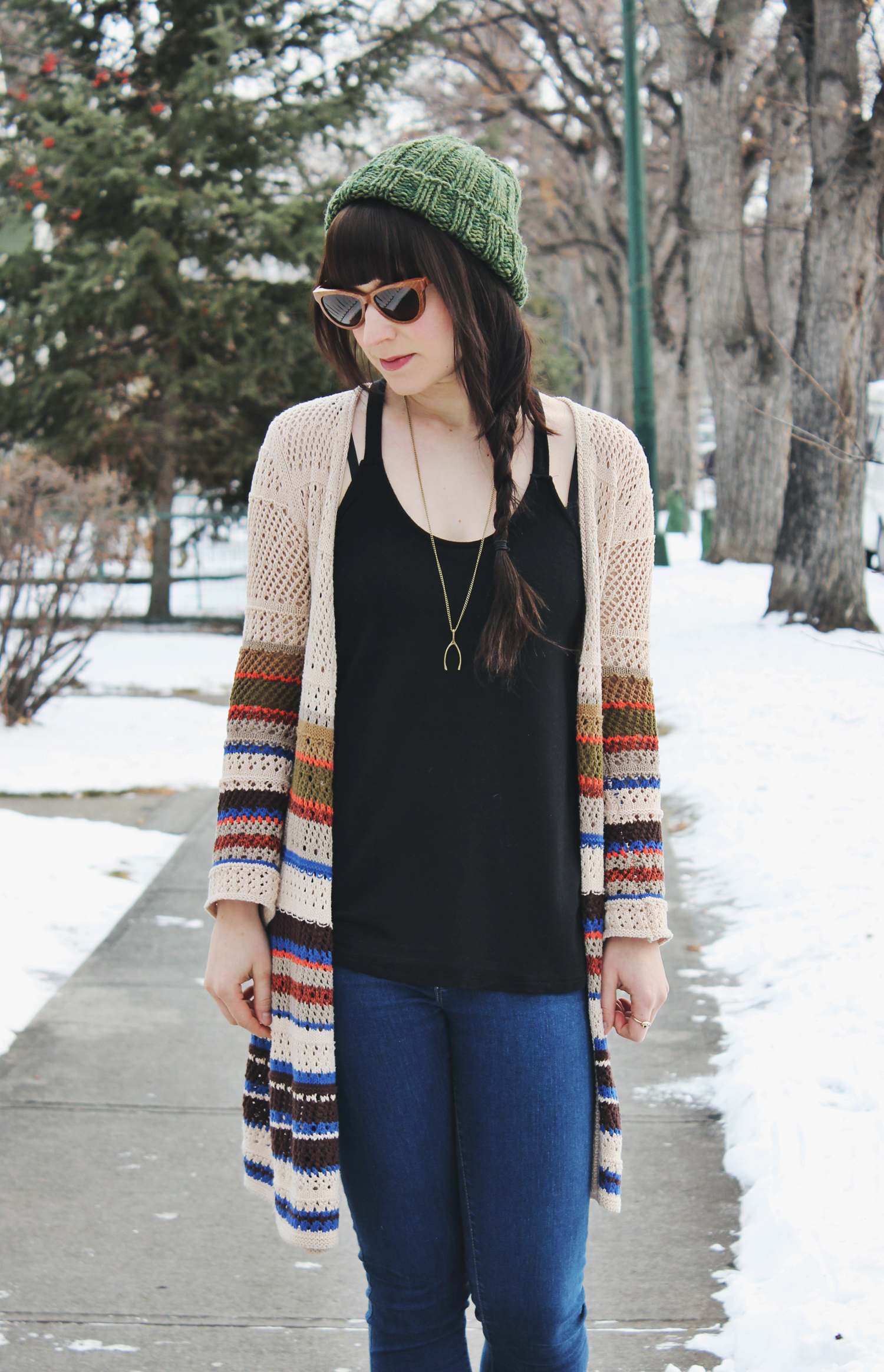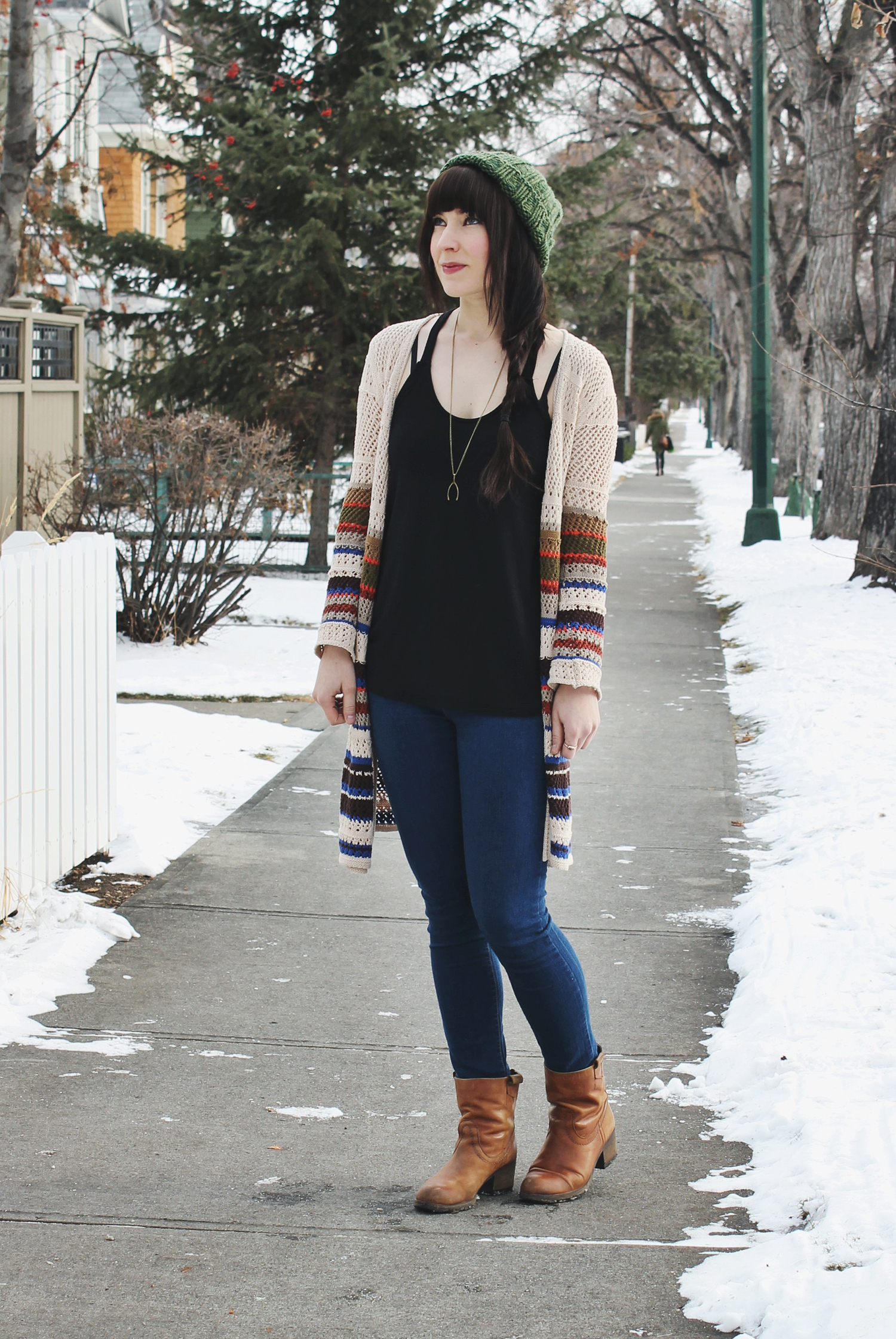This outfit is defiantly a go to look for me in the winter. Sometimes It’s just easier to throw on a pair of jeans and a tank top. Add a cardigan and a beanie for warmth and be on your way. This is one of my all time favourite cardigans. It’s colourful but not too over the top or flashy and I love that about it.