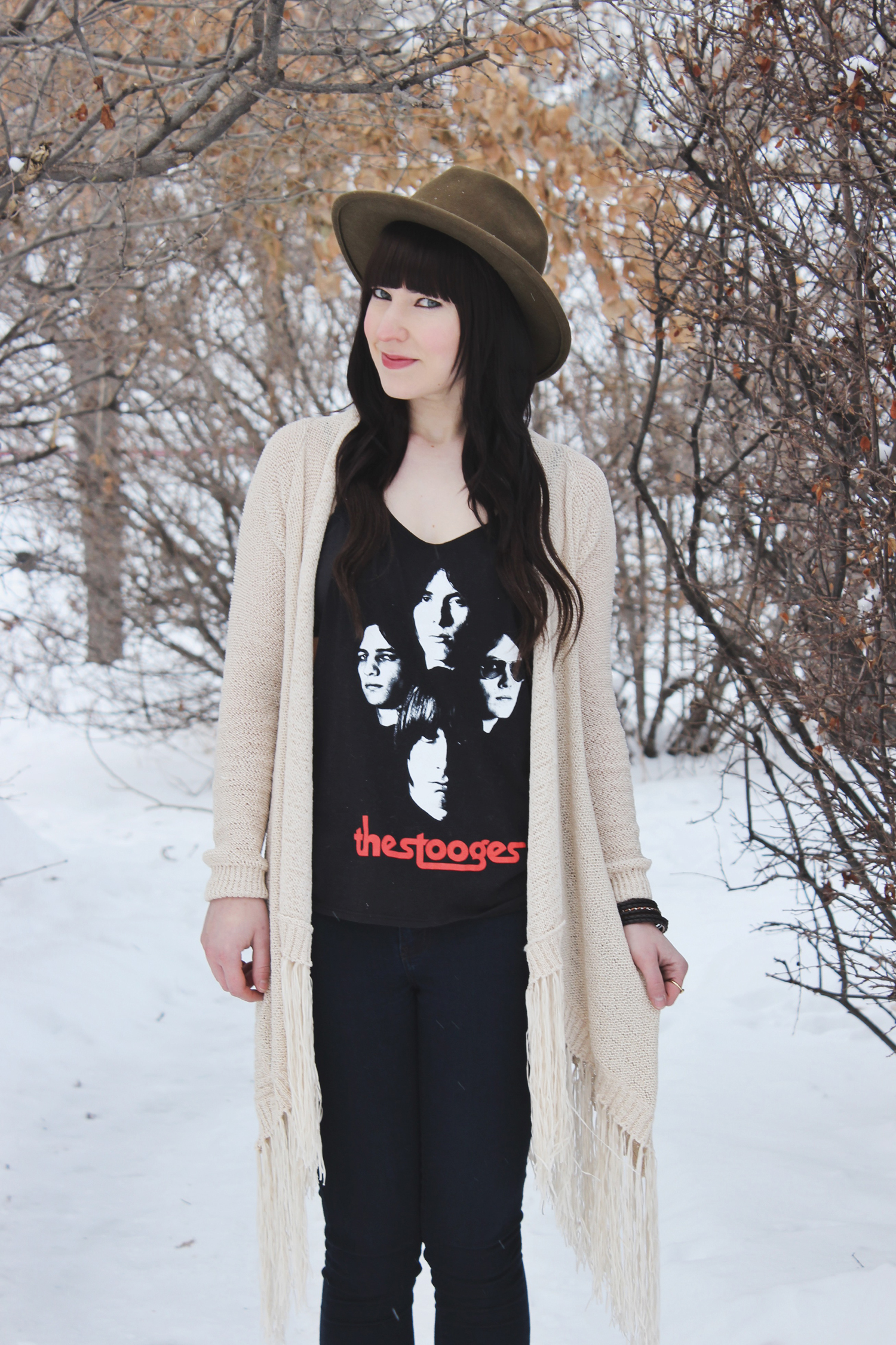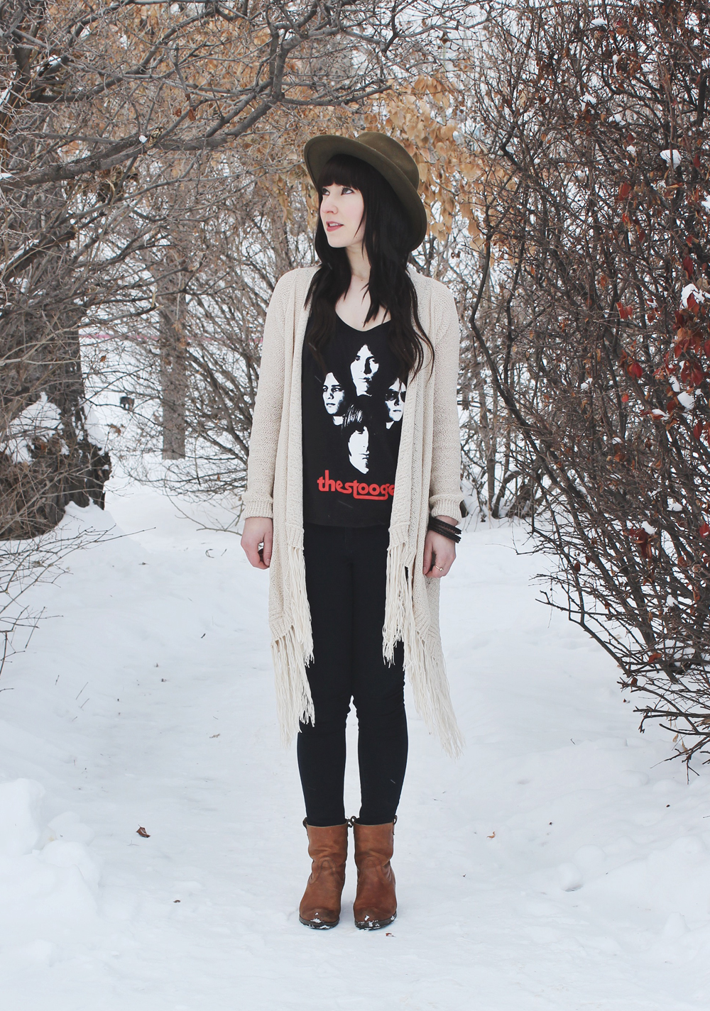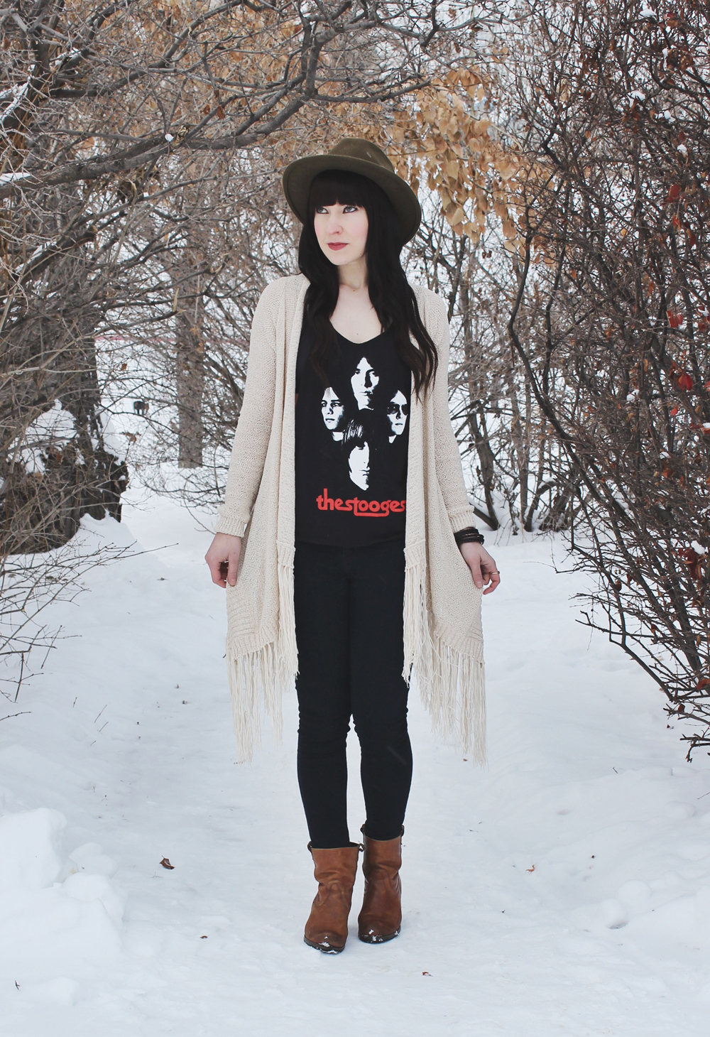 I think I have a little bit of an obsession with the Brand Love Stitch. Their Cardigans are slowly taking over all the space in my closet and i’m definitely ok with that. I love the colour of this particular cardigan and the fringe on the bottom is probably my favourite detail. Another thing that I like about this cardigan is that it’s made of a lighter material, come spring i’ll still be able to wear it. It’s nice to have that kind of versatility in an item. For the rest of the outfit I added my olive Brixton Hat and a pair of my favourite boots from little burgundy.