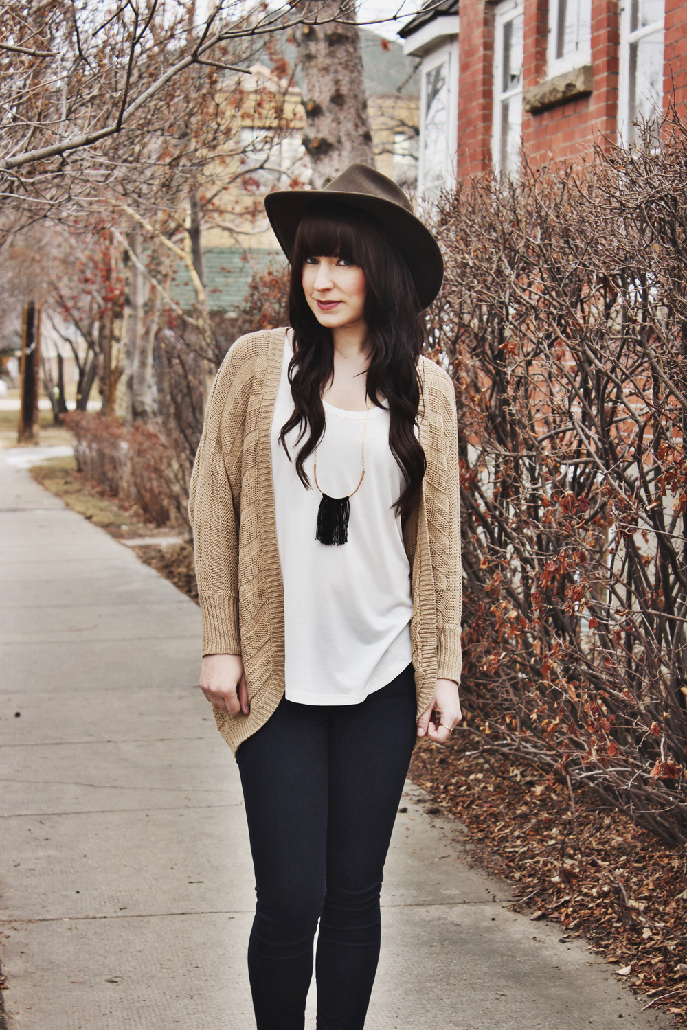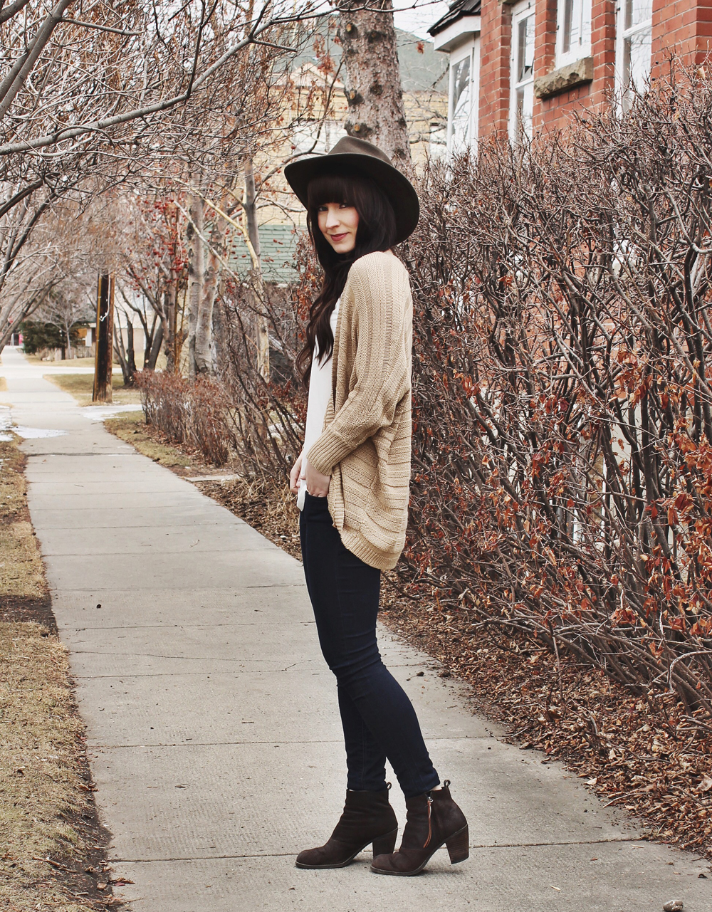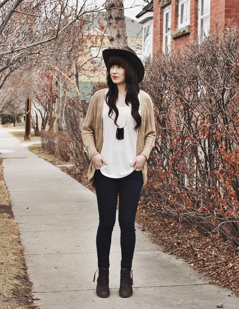 We’ve been having really nice weather in Calgary lately. For a while most of the snow had melted and it’s hard to tell from my photos that it’s even winter anymore. Although the snow will be back soon, I can’t help but feel excited for spring. This outfit is a casual everyday look that uses a few of my favourite wardrobe staples. You can’t go wrong with dark Denim and a white tank top. It’s simple and classic and easy to dress up or down. I added a simple tan cardigan from Forever 21 and my favourite brown suede booties.