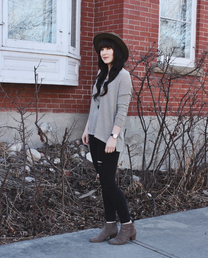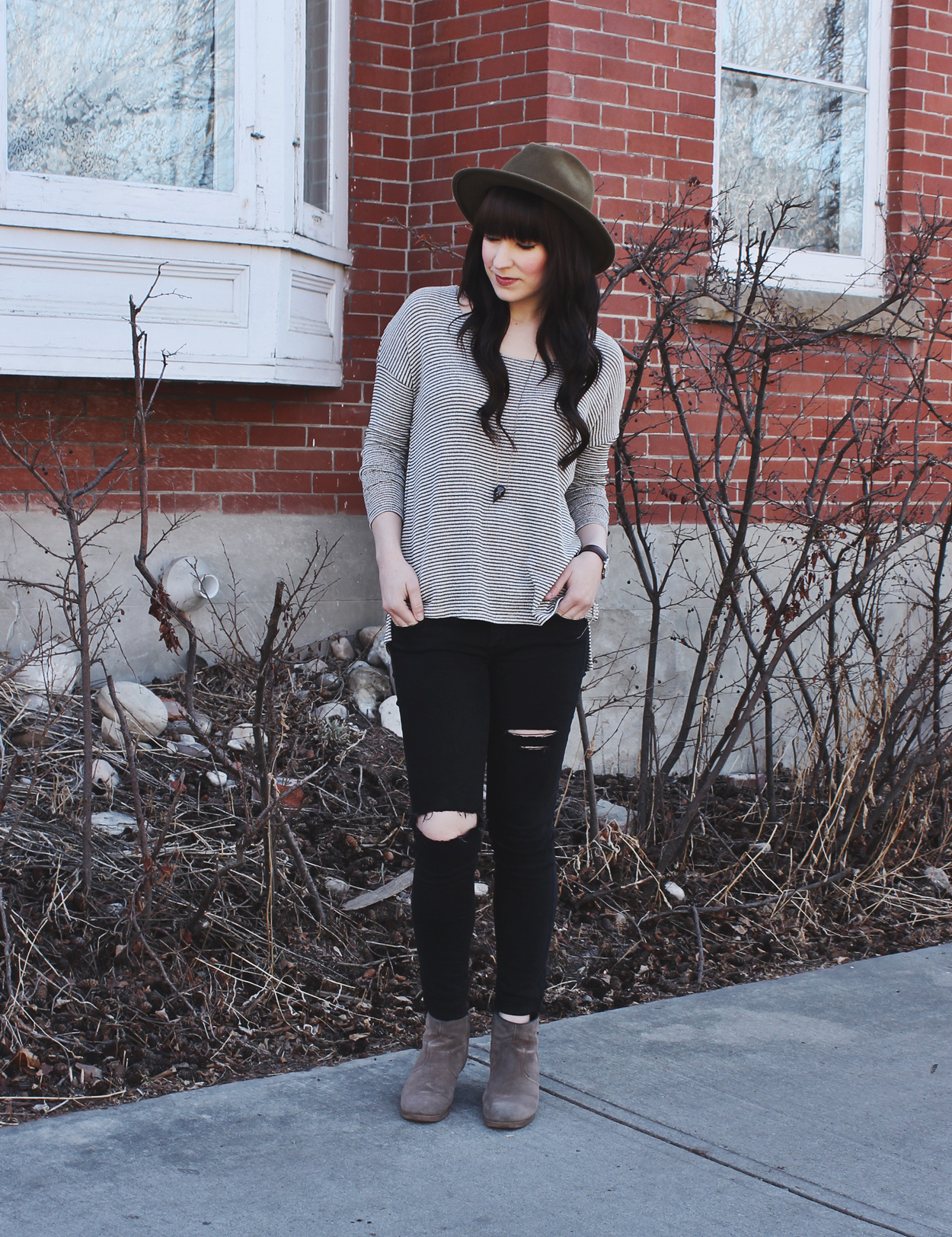 This outfit is something I could pretty much live in. It combines all of my favourite pieces in one outfit. This striped shirt from Urban Outfitters is a new staple in my wardobe. The rest of the outfit consists of my favourite black ripped skinny jeans and my favourite olive green Brixton hat.