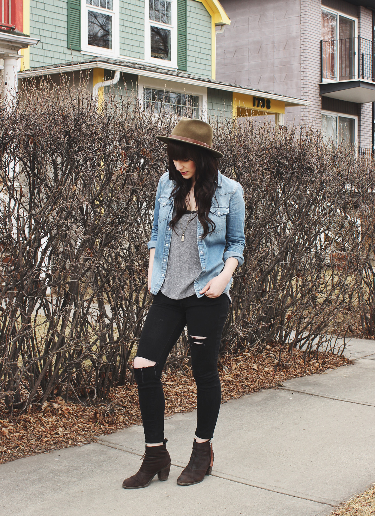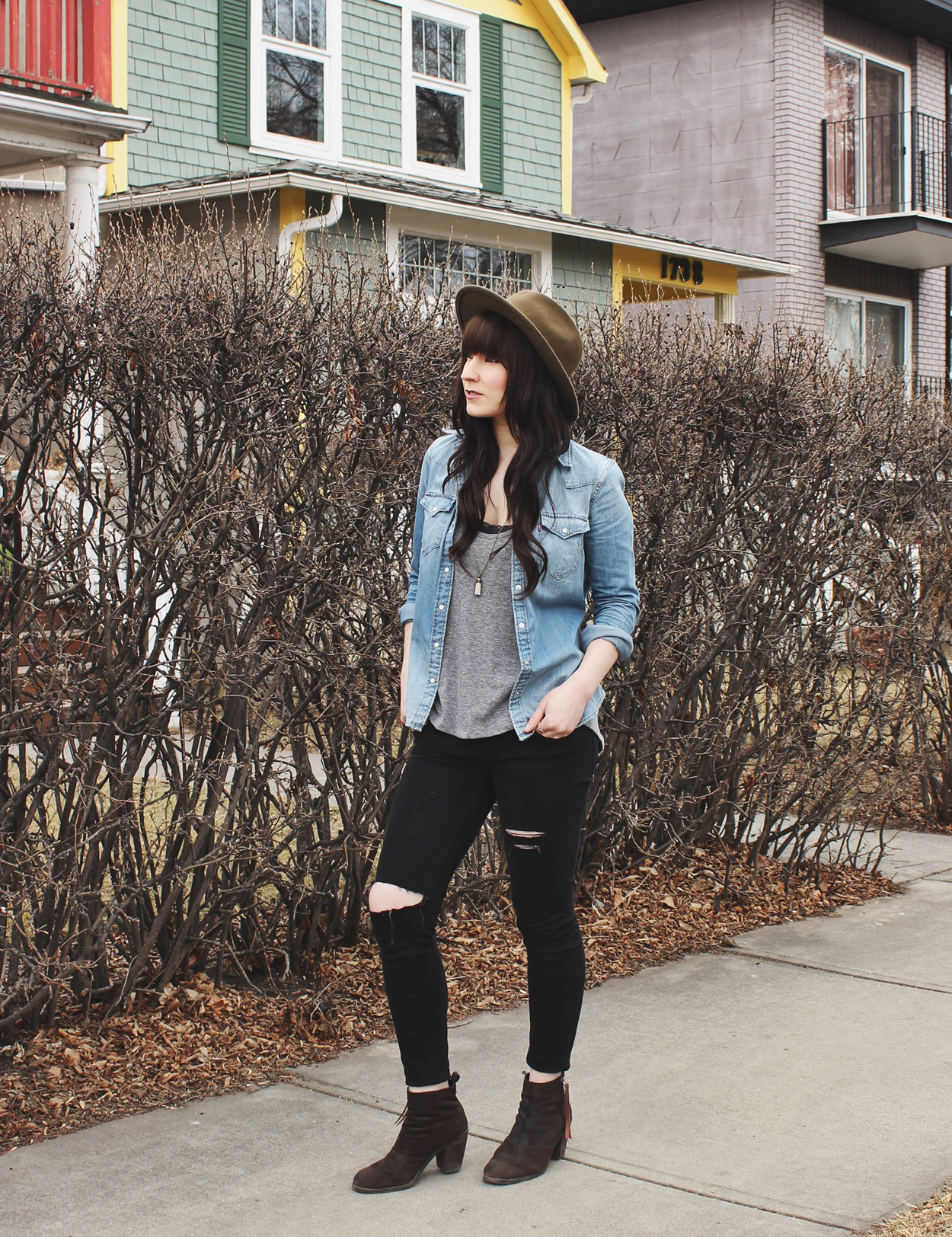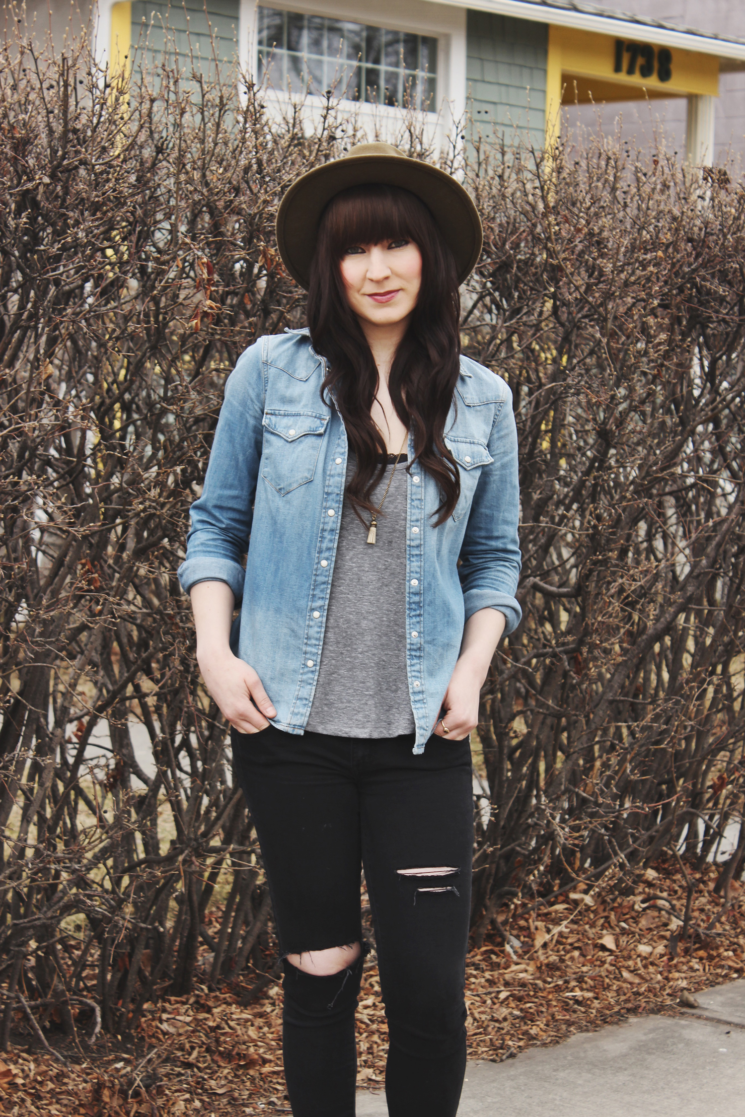 This denim shirt really is perfect and classic. It’s a great staple piece. I really like how it looks with the black jeans too.