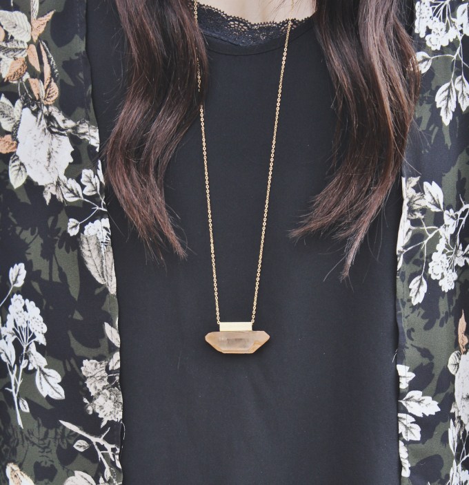 I thought this quartz necklace by Shesso was the perfect addition to this outfit. It’s so delicate and pretty and I think it looks awesome with the chiffon top and kimono. The colours from the necklace and the kimono complaint each other perfectly!