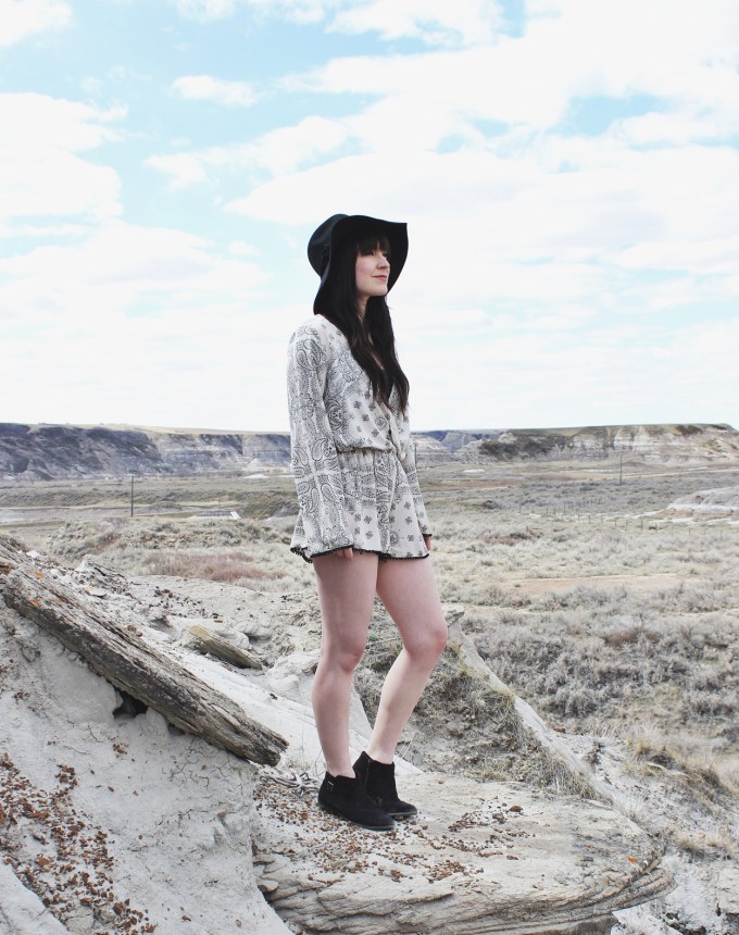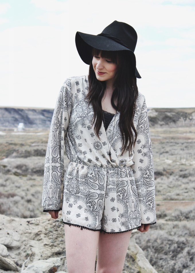 Outfit Details: Hat: Free people / Necklace: C/O Shesso / Romper: Illa Illa / Boots: Forever 21