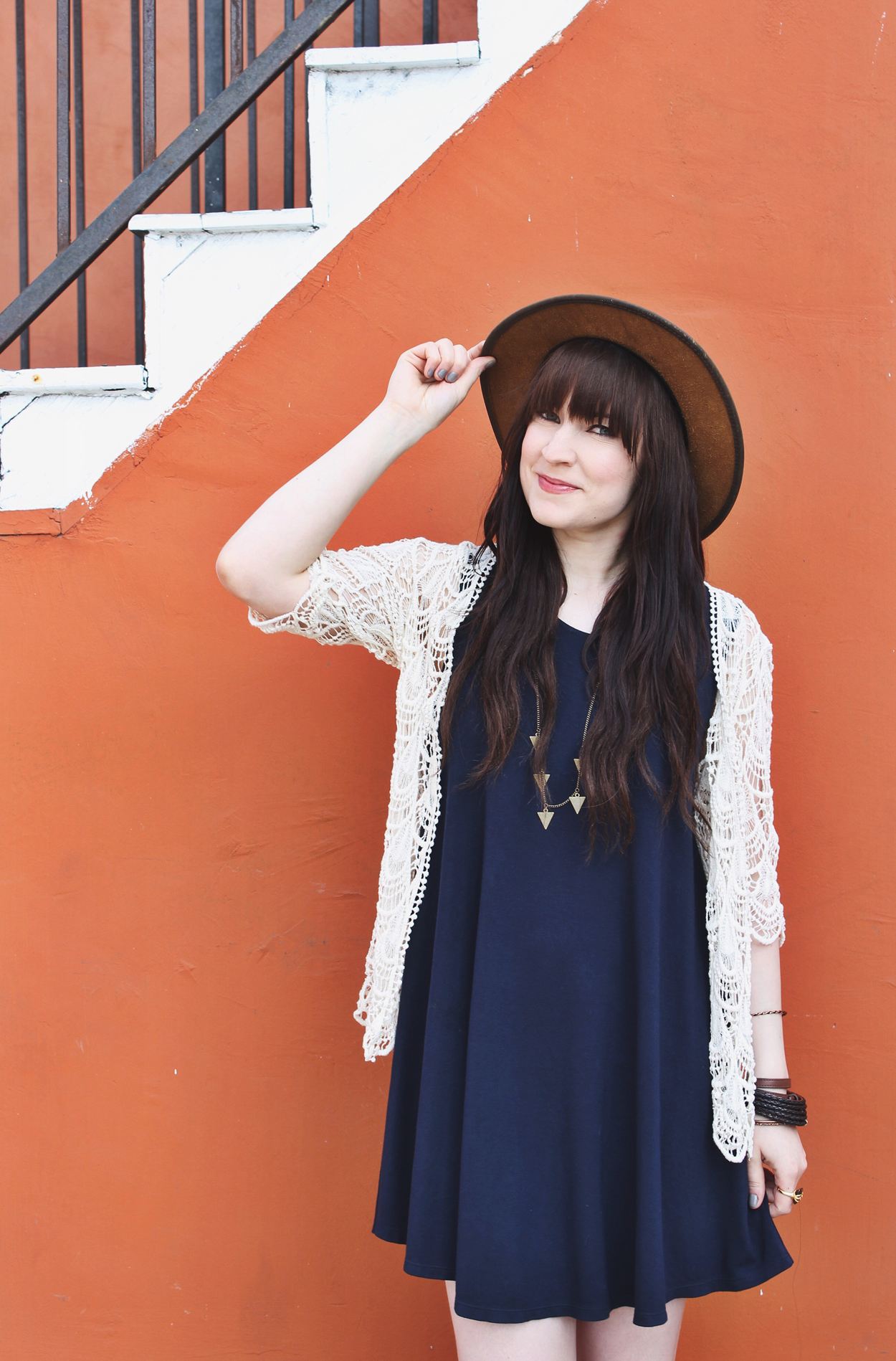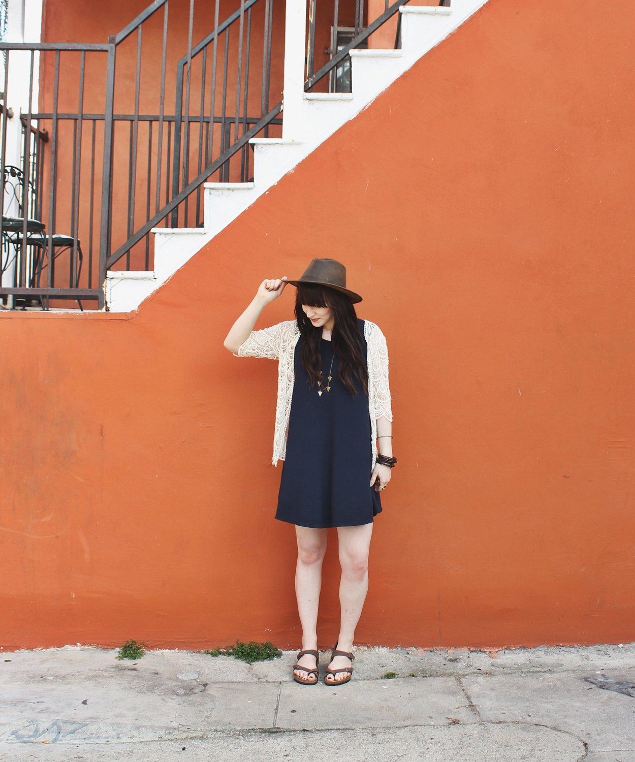 Outfit Details: Hat: C/O Goorin Bros / Cardigan: C/O Romwe.com / Necklace: C/O Coutukitsch / Dress: Brandy Melville / Sandals: Birkenstock / Ring C/O Mejuri