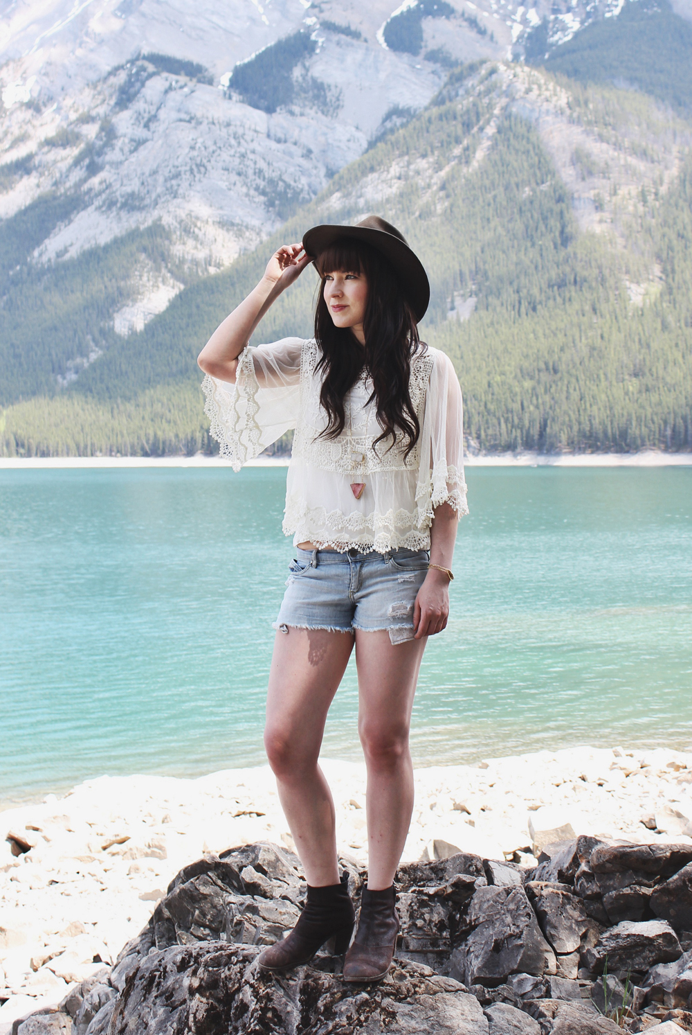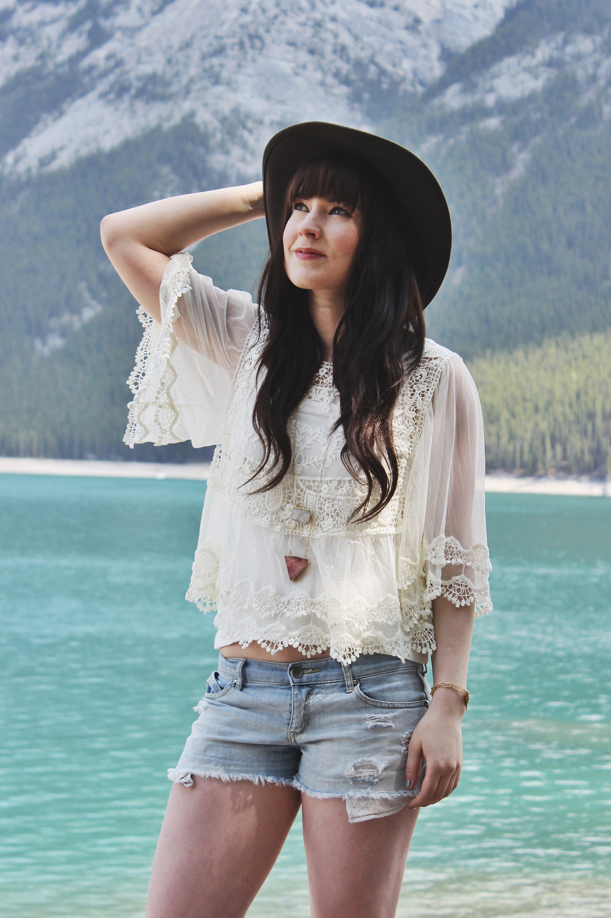 It feels like summer right now in Alberta, so i’ve obviously been taking advantage of that. These cut off denim shorts are getting a lot of wear lately. I wanted to do a look that was a little more feminine then what i’ve been wearing lately and I think this lace top by double zero fits that description quite well! I also wanted to wear my new Shesso geometric quartz necklace because it is gorgeous and I really needed the right outfit to show it off! I really hope the weather stays this nice so that I can continue to wear outfits like this.