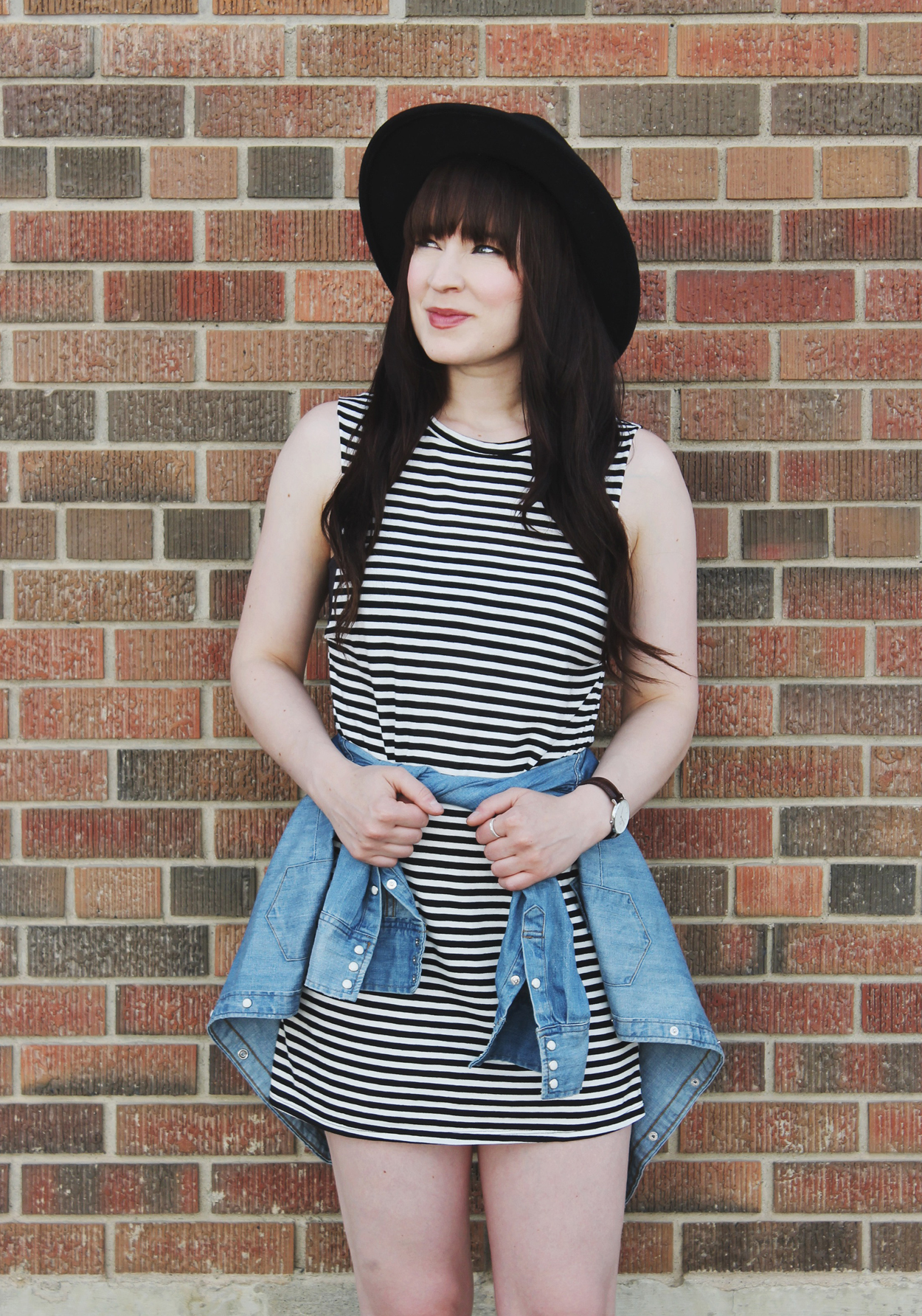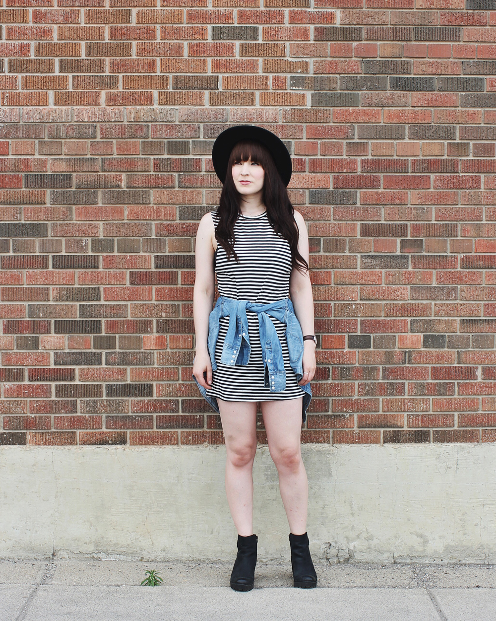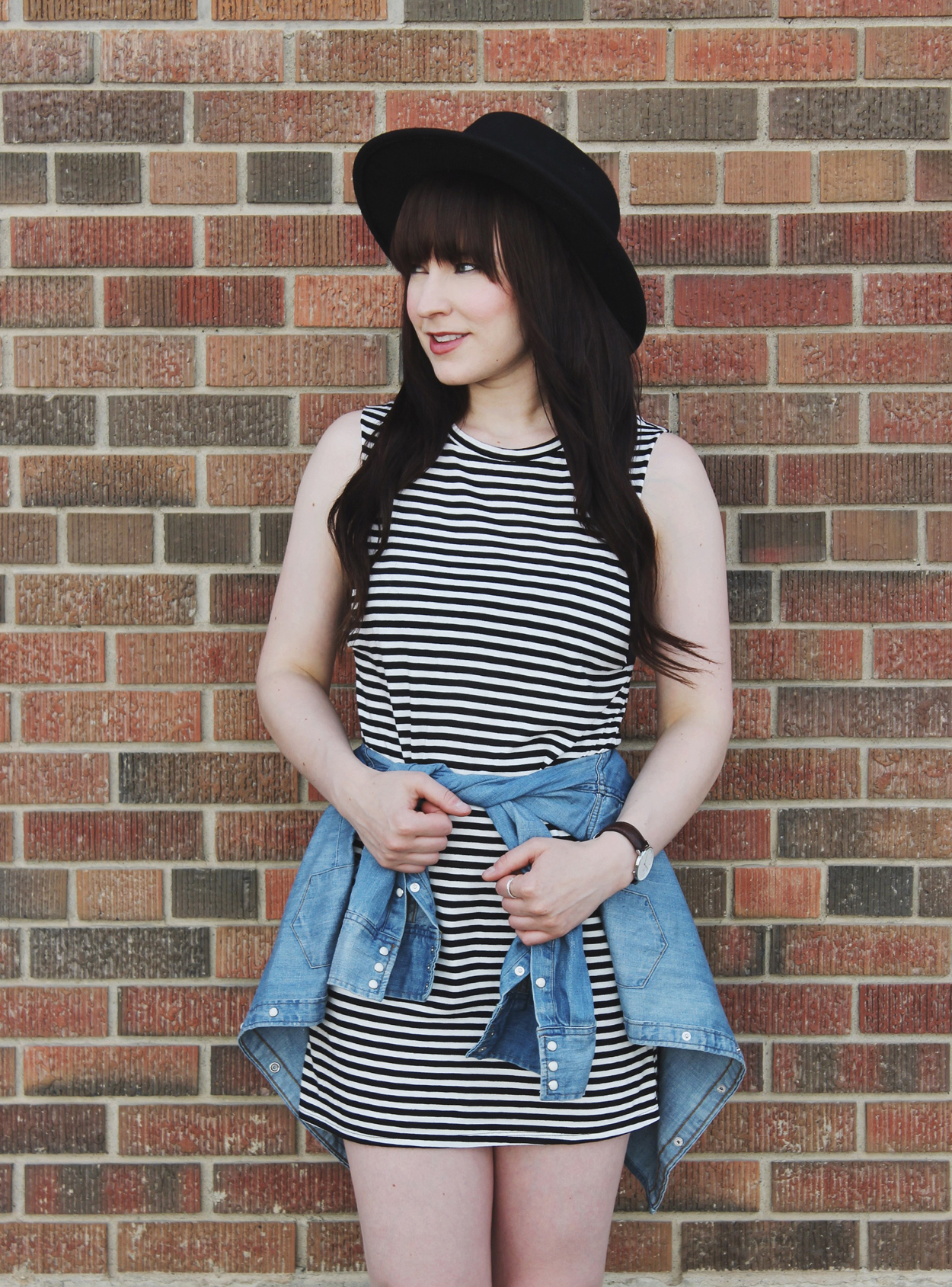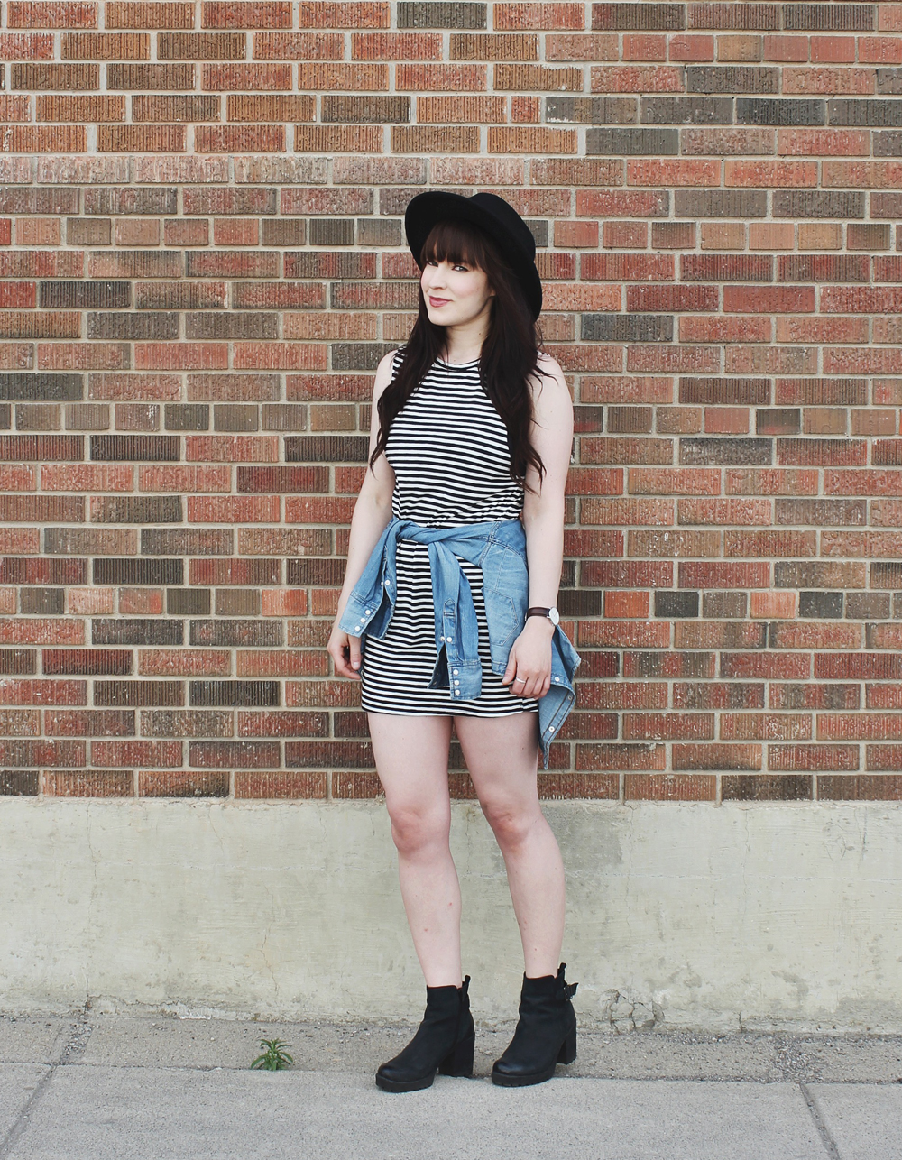 Outfit Details: Hat: Brixton / Dress: Billabong / Denim Shirt: Levi’s / Watch: C/O Daniel Wellingon / Boots: C/O Little Burgundy / Rings: Shesso