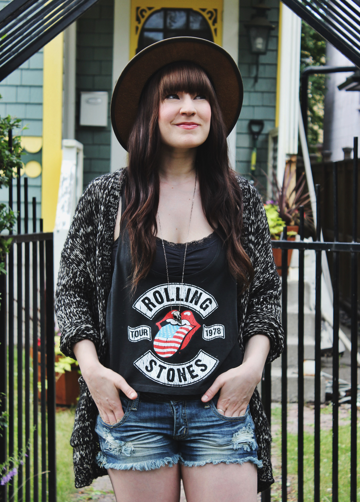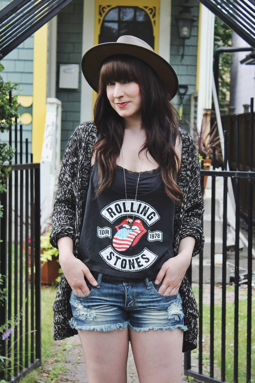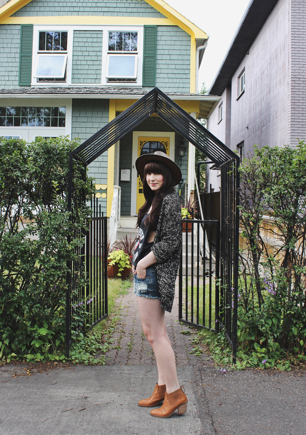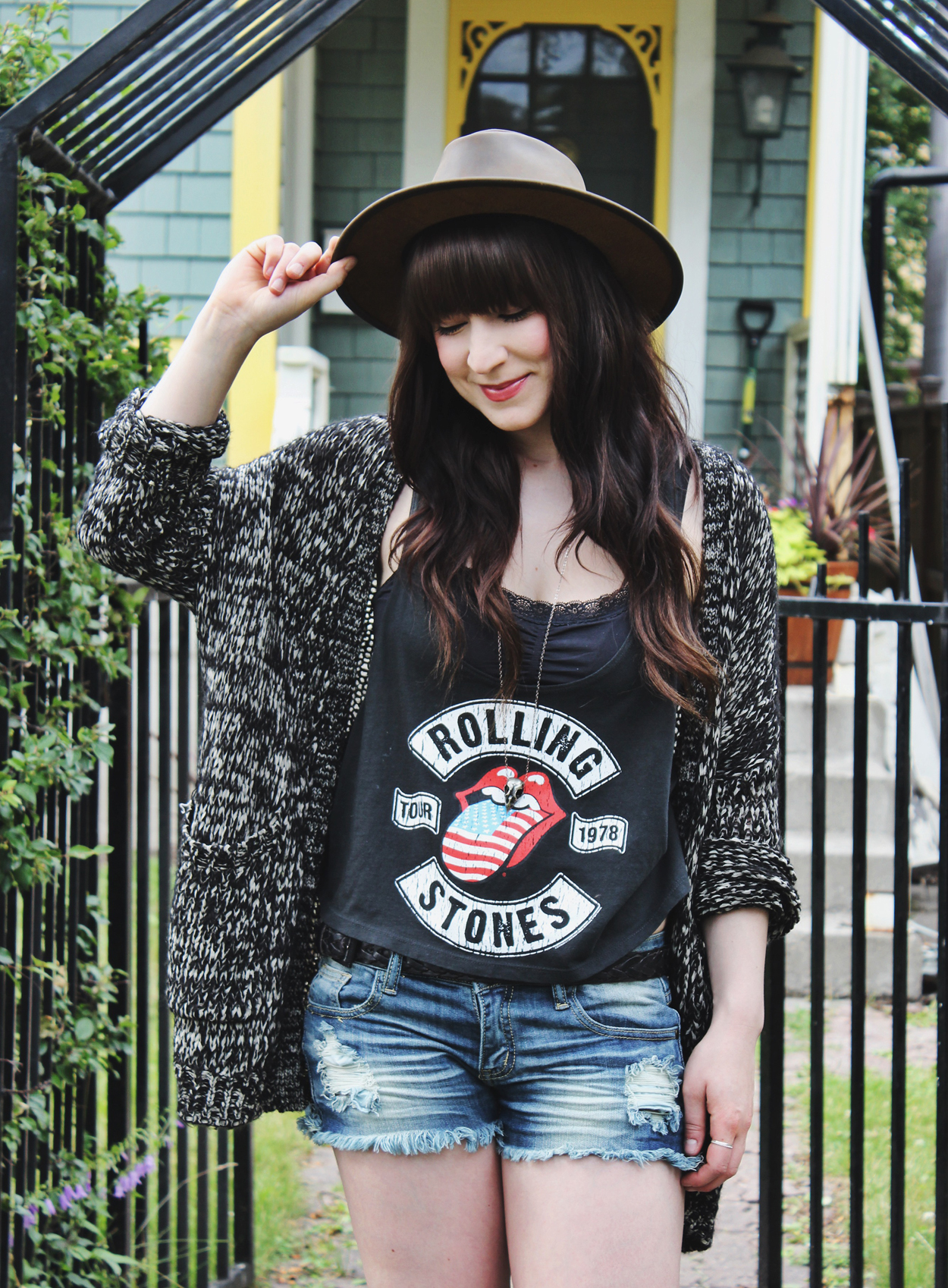 Outfit Details: Top: Forever 21 / Cardigan: Volcom / Jean shorts: Machine Jeans / Hat: C/O Goorin Bros / Necklace: C/O Black Sparrow Jewelry / Boots: Aldo
