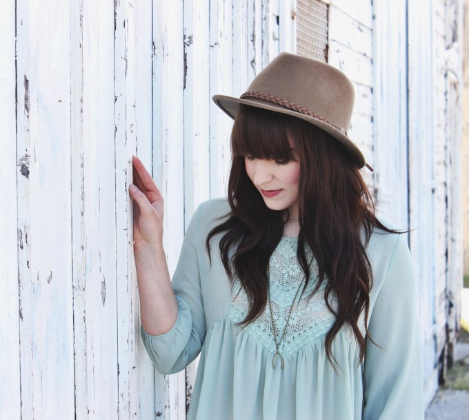 I’m always talking about adding more colour to my wardrobe. I wear a lot of beige and off white. When I saw this sage coloured top I knew it was the perfect addition to my closet. I love the lace detailing on the front and how light and airy the material is. It’s also very see through, so I wore my nude coloured bandeaux bra underneath. It’s good to have at least one nude coloured bra and or bandeaux to wear with shirts like this one.  For the rest of the look I wore one of my favourite Goorin Bros hats and this cute little wishbone necklace by Coutukitsch.