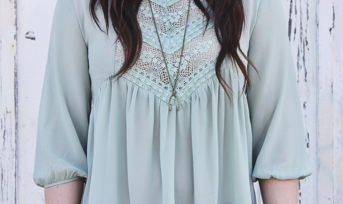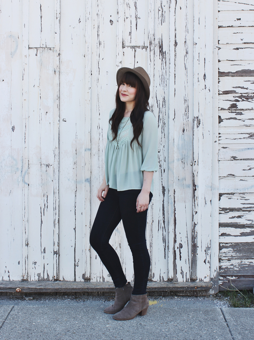 I’m always talking about adding more colour to my wardrobe. I wear a lot of beige and off white. When I saw this sage coloured top I knew it was the perfect addition to my closet. I love the lace detailing on the front and how light and airy the material is. It’s also very see through, so I wore my nude coloured bandeaux bra underneath. It’s good to have at least one nude coloured bra and or bandeaux to wear with shirts like this one.  For the rest of the look I wore one of my favourite Goorin Bros hats and this cute little wishbone necklace by Coutukitsch.