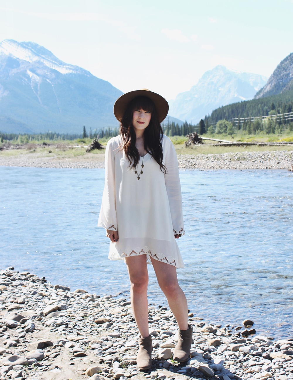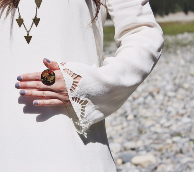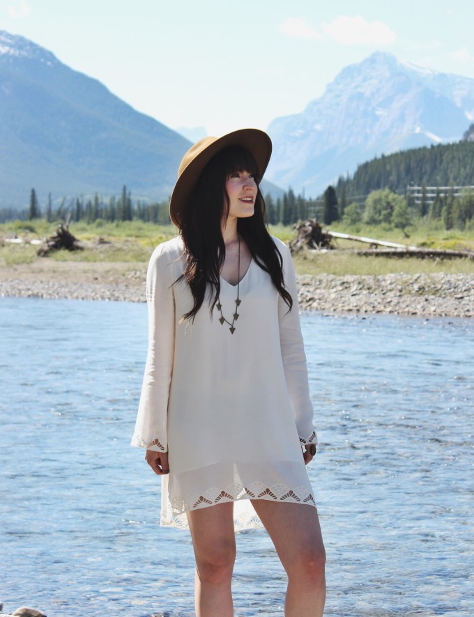 This off white shift dress by Gentle Fawn is a recent addition to my wardrobe. It’s elegant and classic and I love the detailing on the sleeves and hemline. Sometimes it’s nice to keep an outfit simple, so for this look I really wanted to keep my accessories to a minimum. I added my favourite Goorin bros hat and a pair of grey ankle boots. For jewelry I wore my triangle necklace by Coutukitsch and my new wood ring from Shade of a Bonsai.