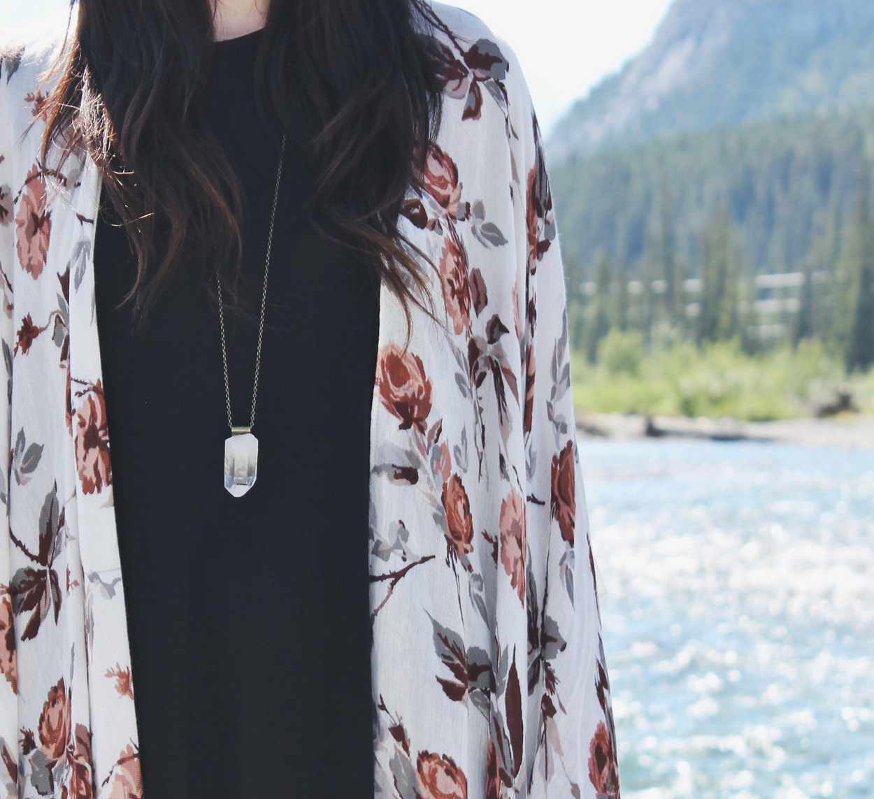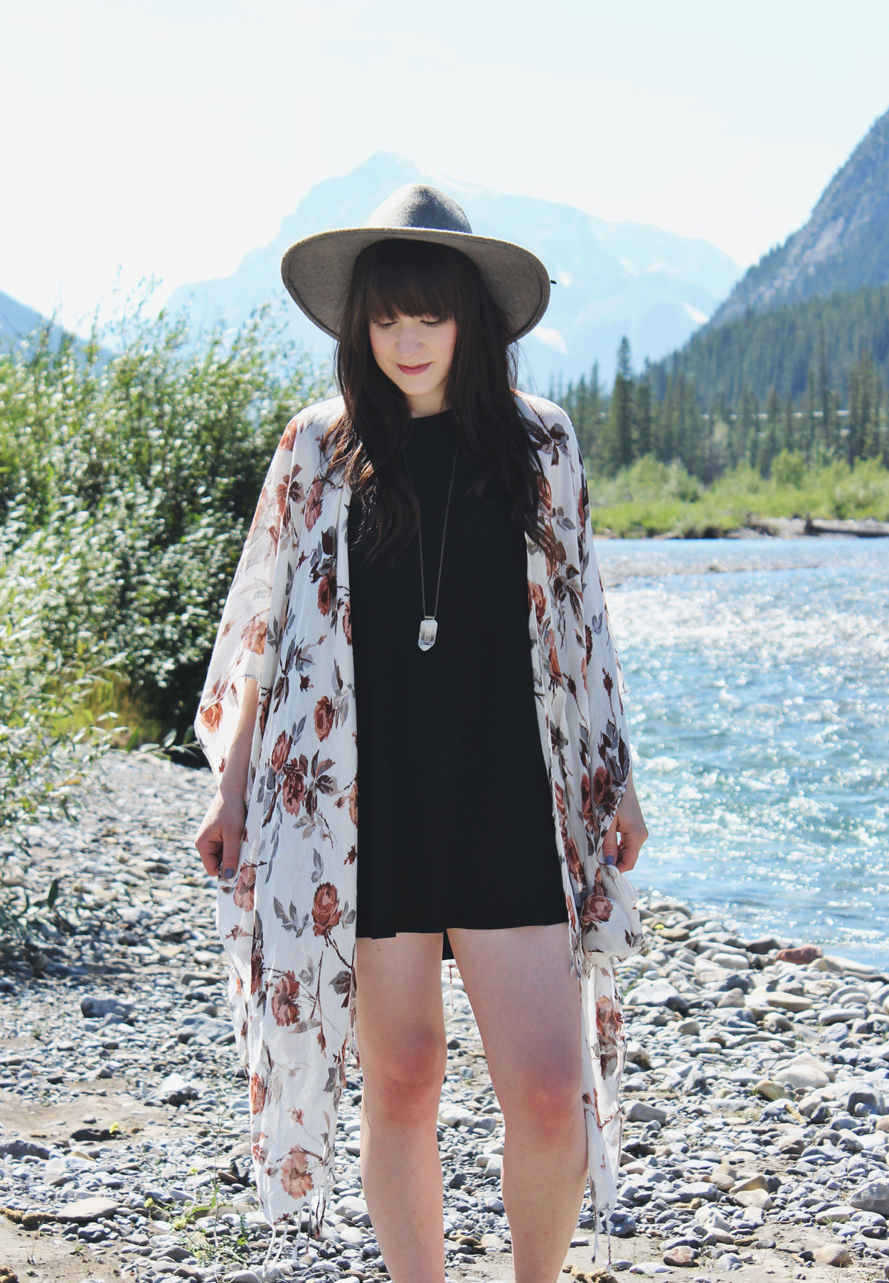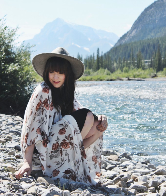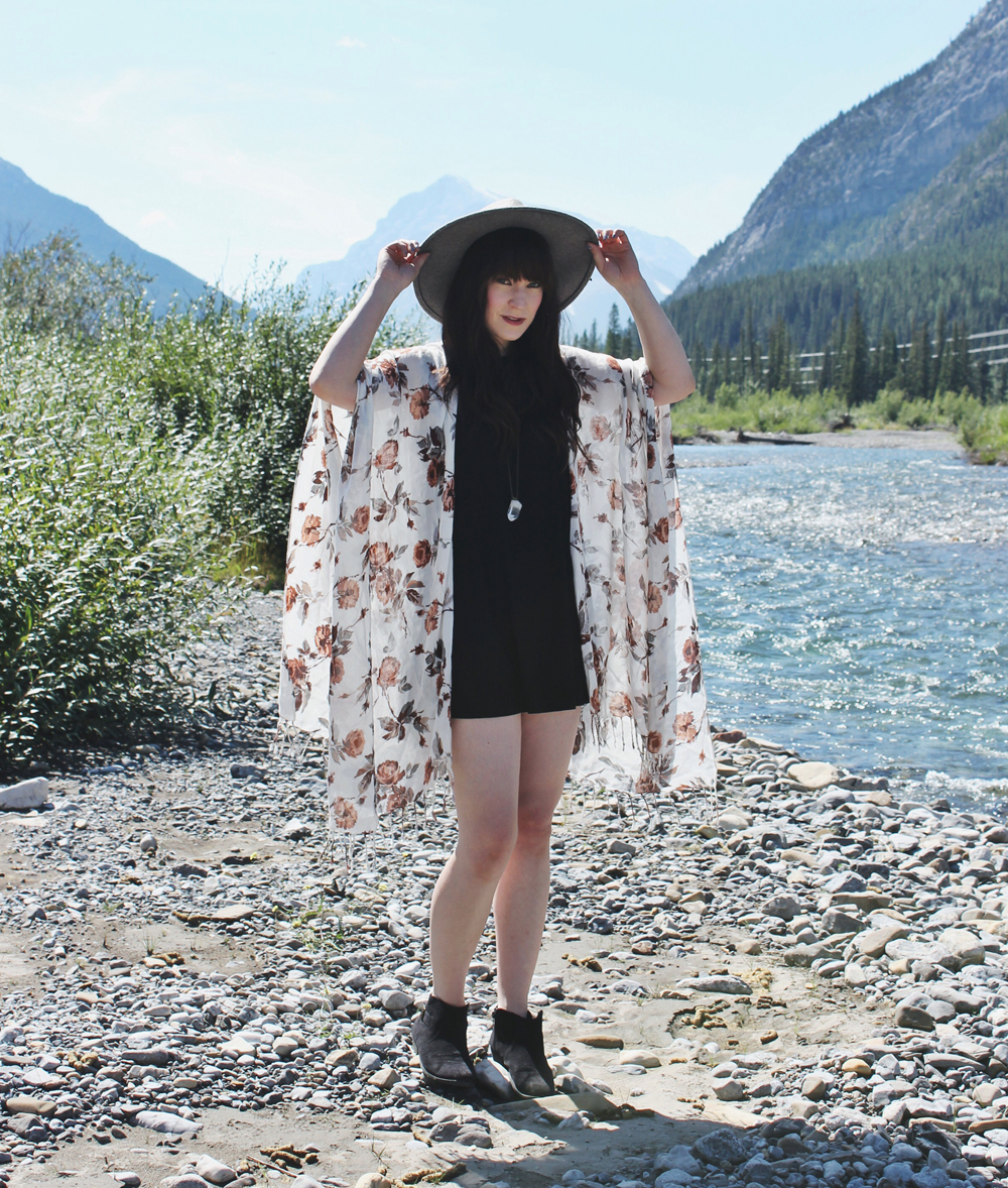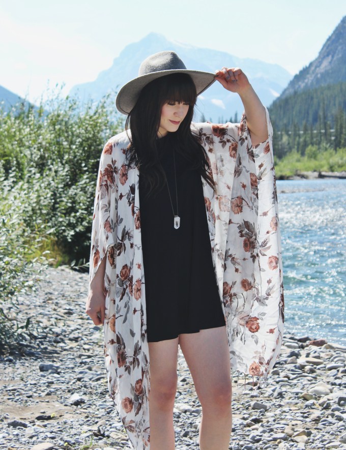 This look is great for a warm summer day. The floral shawl by Gentle Fawn is one of my favourite new pieces. I love the pattern and how light and flowy it is. I paired it with a simple black dress by Everly and my wide brim hat by Goorin Bros. I’m not much of a sunbather, so I like wide brimmed hats that keep the sun off my face.
