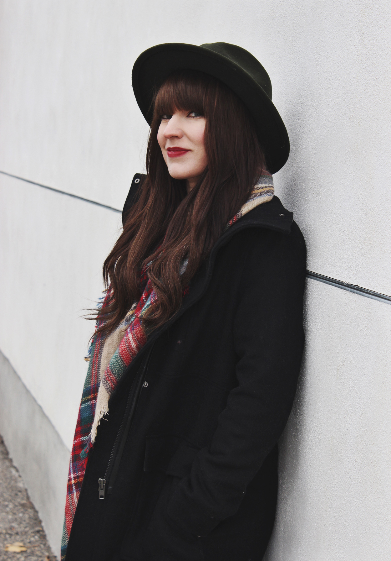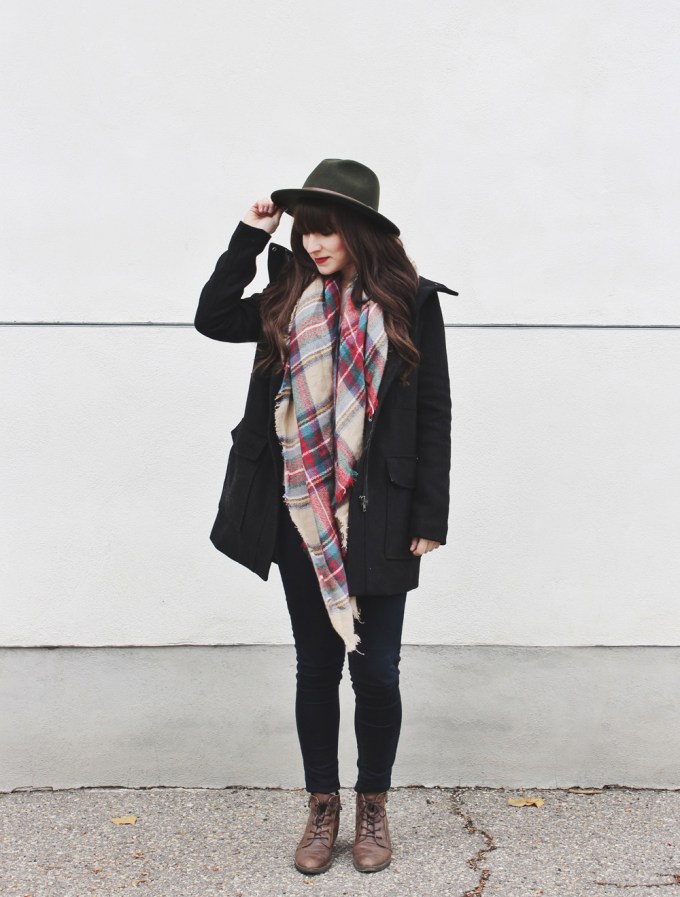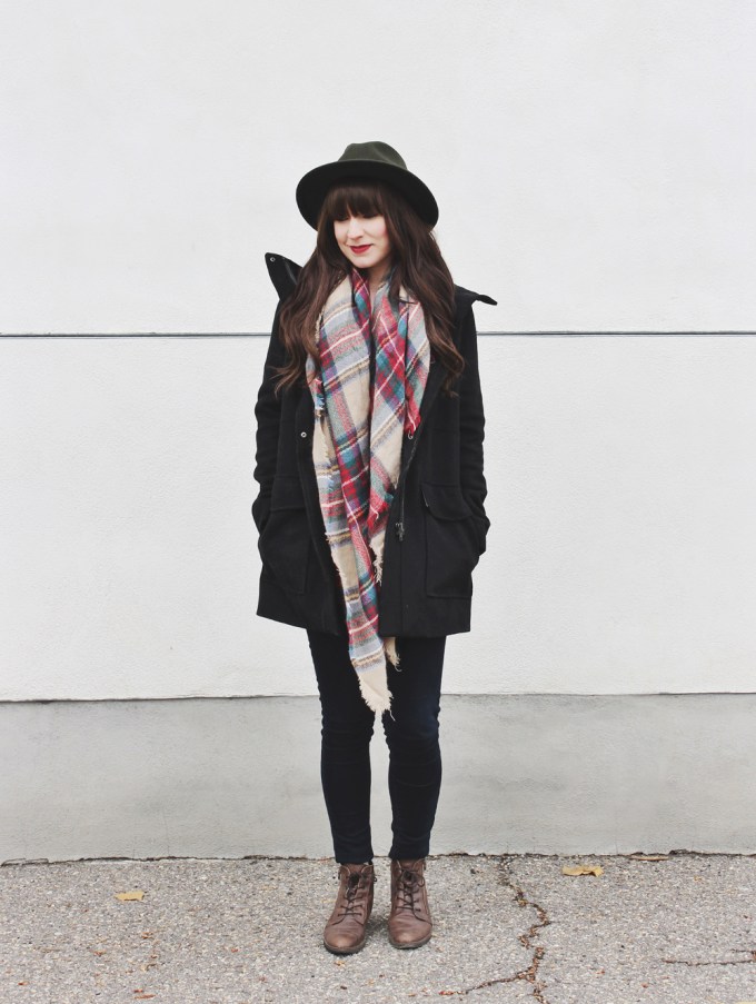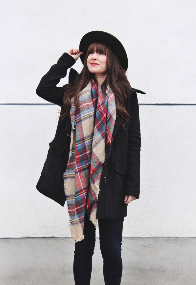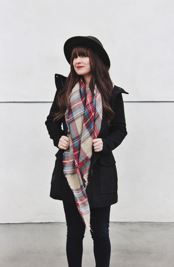 I must say that I really love a nice wool coat, especially this style. They ensure that even when it’s cold outside you can still look great! To complete this look I added my newest plaid scarf and one of my favourite Brixton hats.