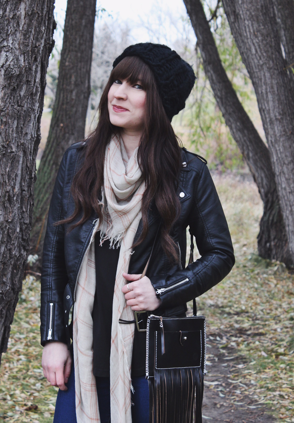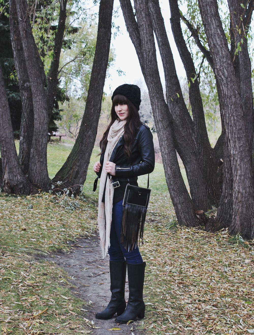 Outfit Details: Hat: Little Burgundy / Faux Leather Jacket: H&M / Scarf: C/O Lovestitch / Boots: C/O Cat Footwear / Bag: C/O Dunole / Jeans: Just USA