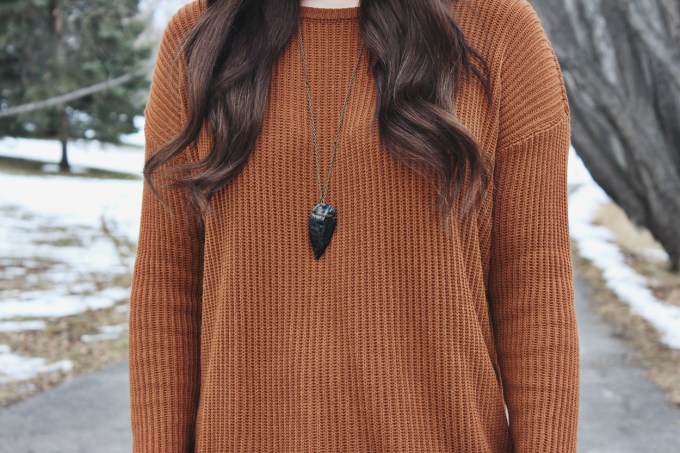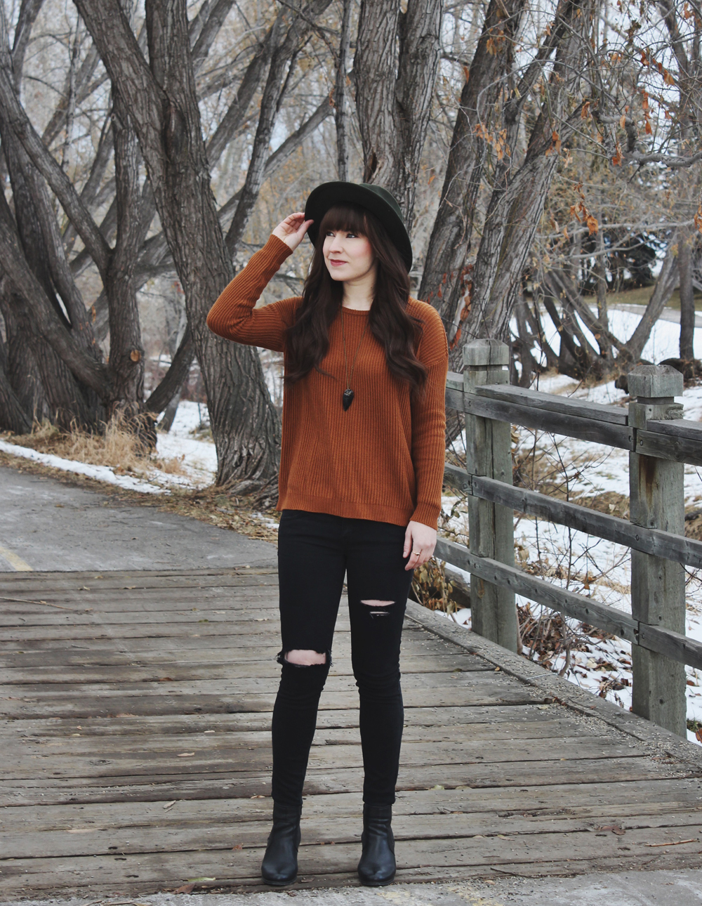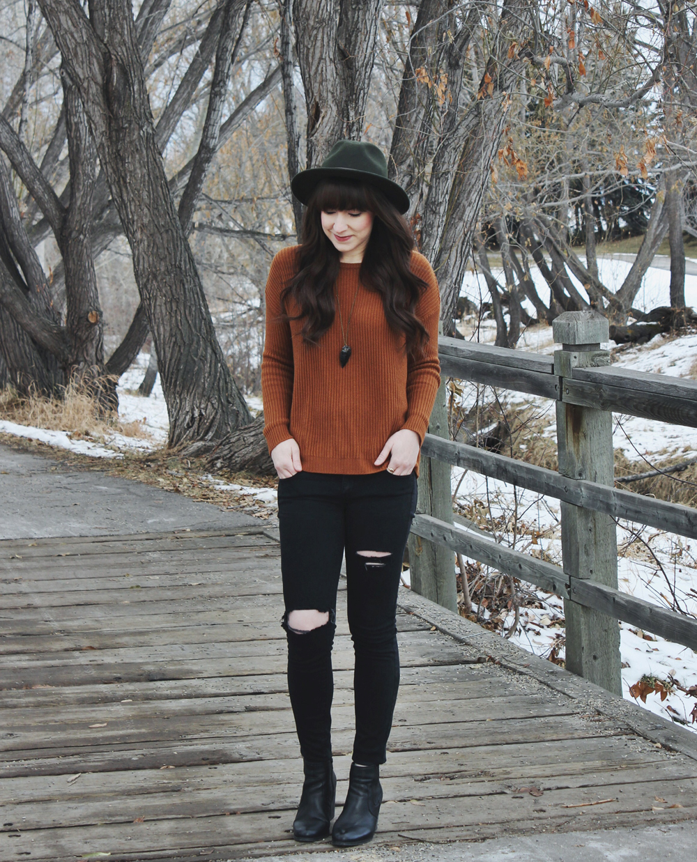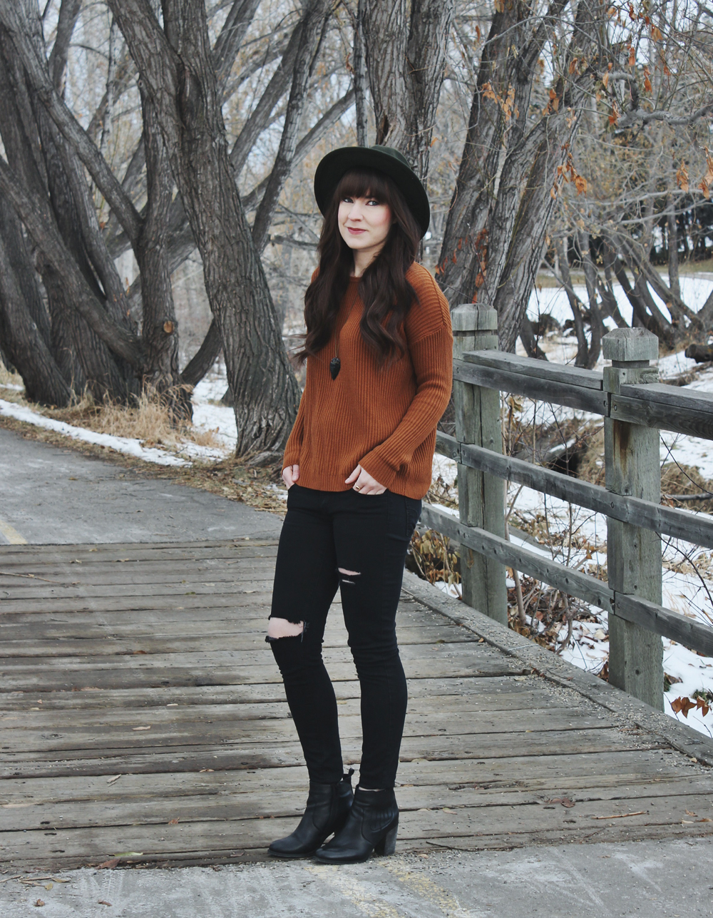 lately I’ve been feeling like my wardrobe is lacking in colour and I wanted to do something about it. One of my all time favourite colours is burnt orange, so when I saw this sweater at Brandy Melville I had to have it. To complete this look I added some ripped jeans and a pair of black ankle boots. This combination is one of my go to everyday looks. I like that it’s casual but still has a bit of edge to it.