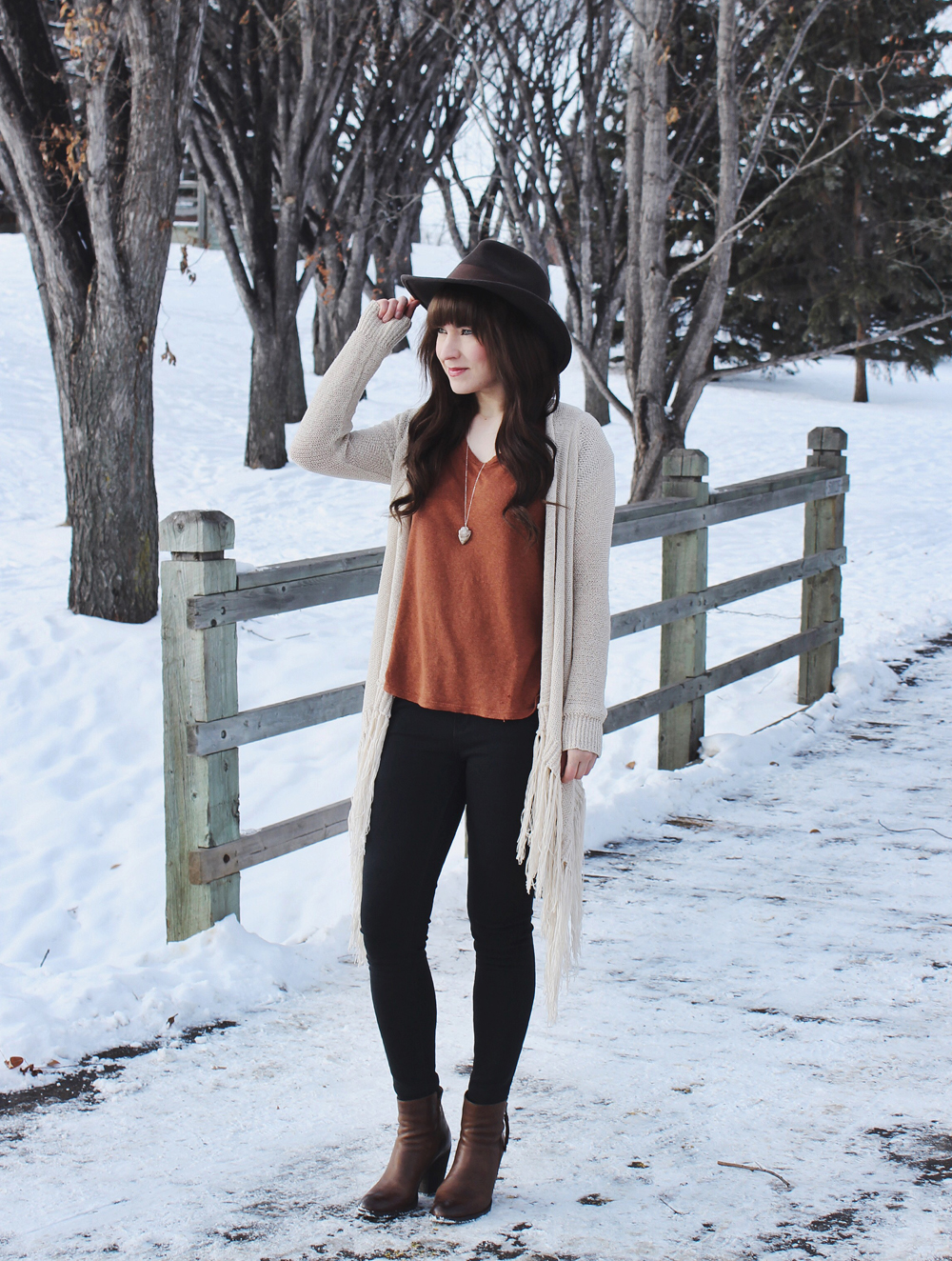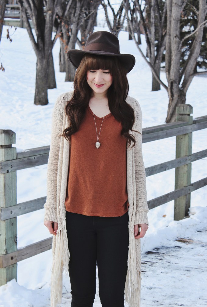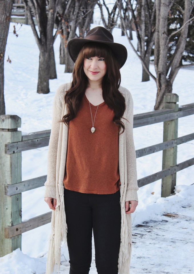 This look is one of my go to styles for everyday wear. An awesome hat, a cardigan and a pair of skinny jeans are the main staples of my wardobe. If these items happen to be in neutral colours and most of mine are, it makes it really easy to mix and match and create a lot of different looks with the same pieces. Versatility is great thing to look for in clothing, it makes choosing different outfits that much easier.