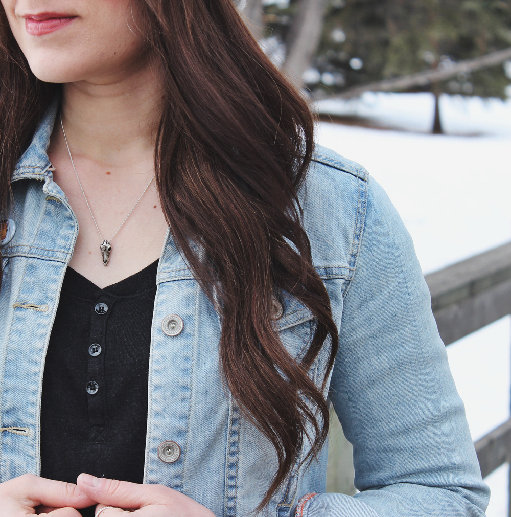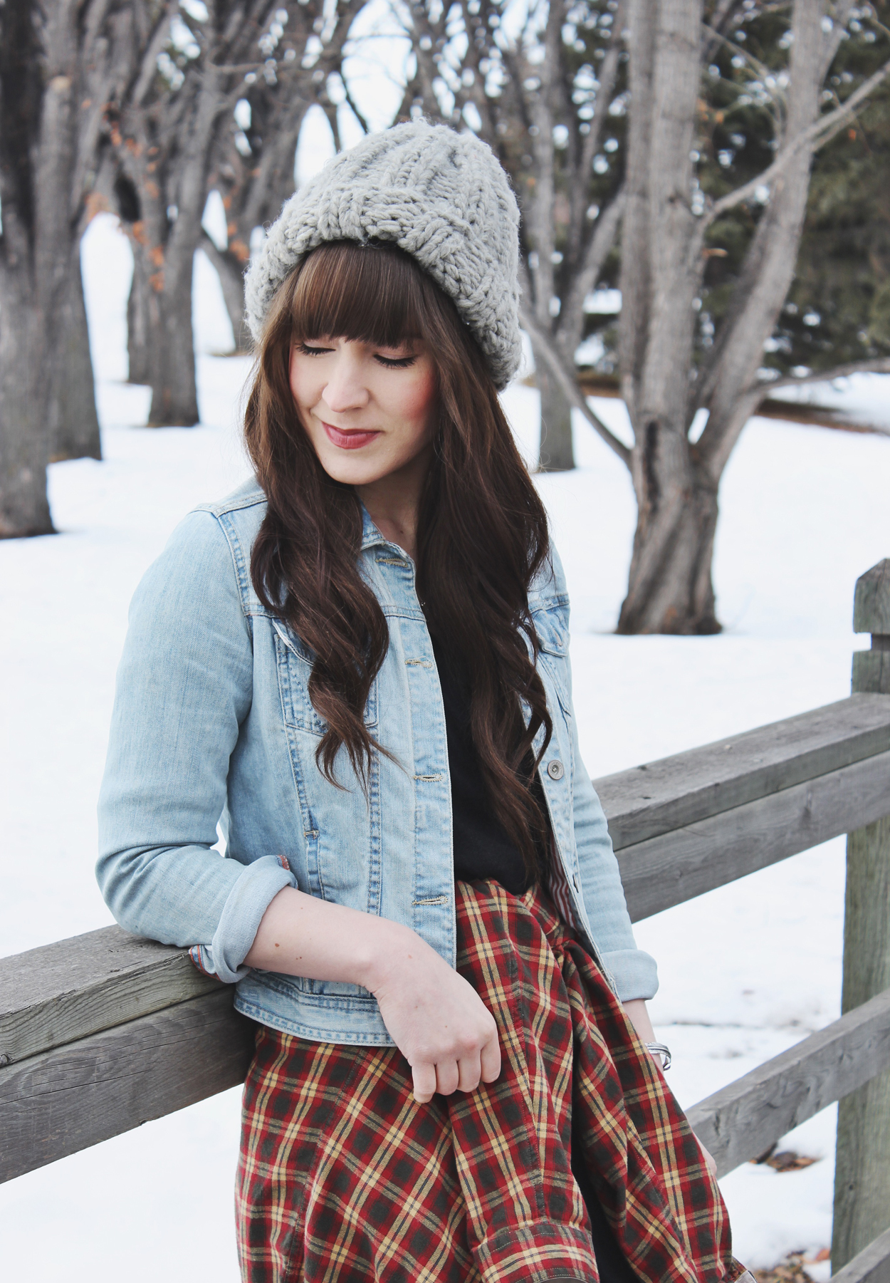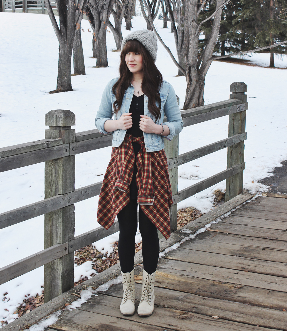 For the rest of the look I’m wearing a few of my favourite pieces. This denim jacket and wool hat are staples in my wardrobe. Underneath the jacket and plaid shirt is a really cute black dress by TNA. I know you can’t see it very well but I promise you it’s awesome. I love the little buttons on the front and it has a very flattering fit.