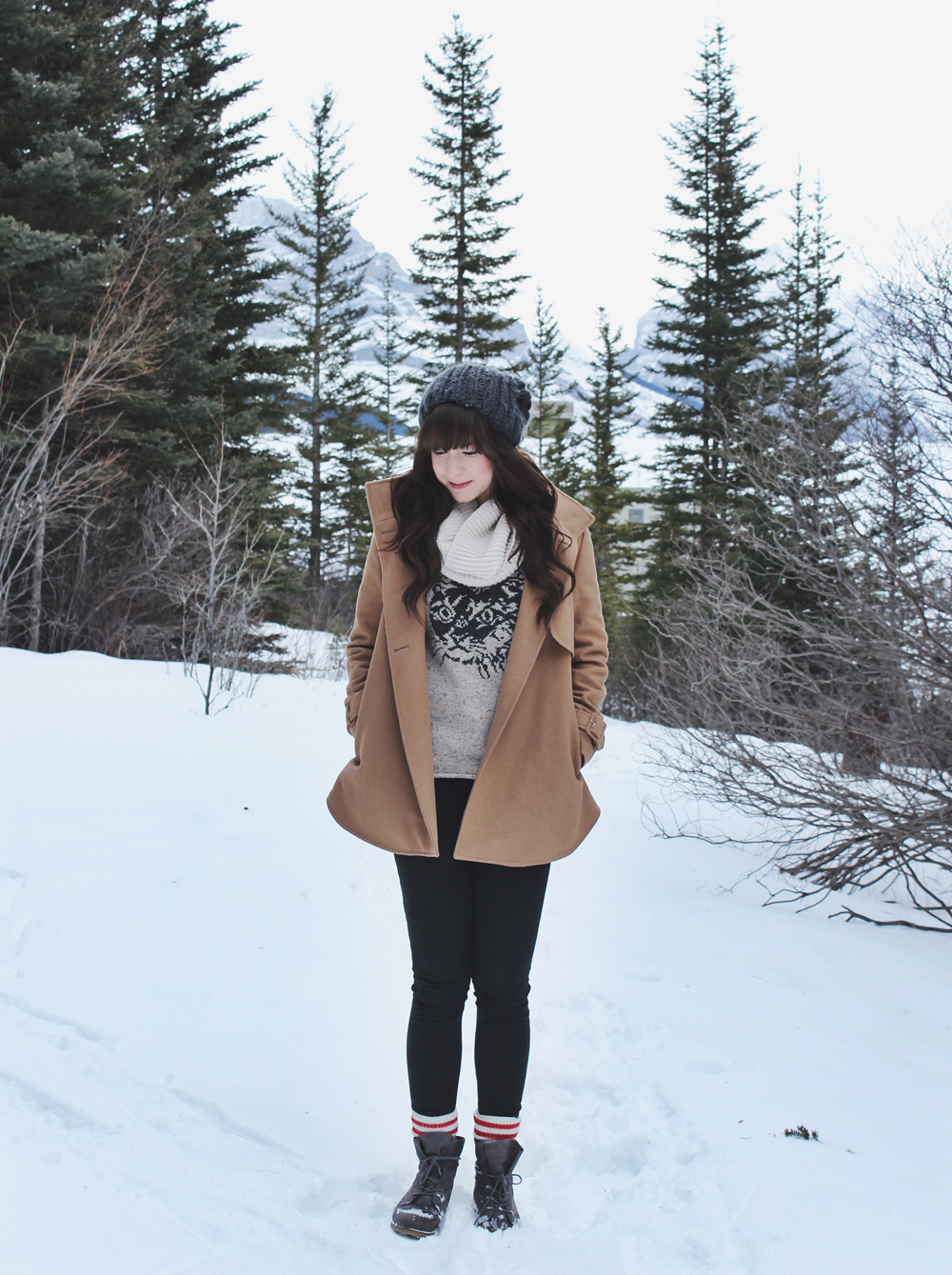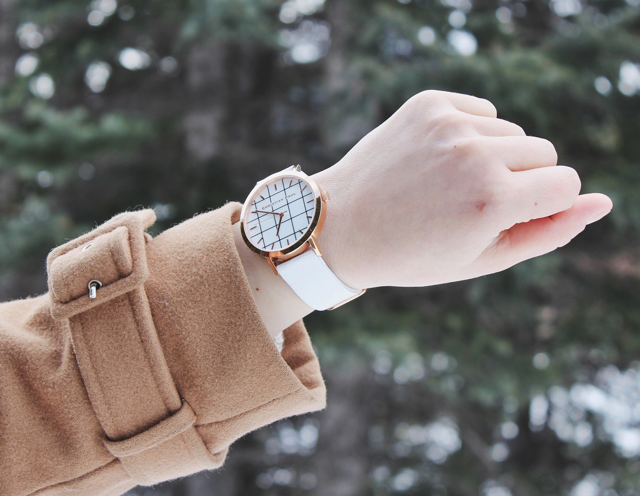 When it comes to choosing an outfit in the winter, most of the time practicality is the main concern. You have to wear weather appropriate styles unless you want to be cold and uncomfortable. For this look I’ve chosen some of my favourite winter pieces. This camel coloured wool coat is one of my all time favourites, I really love the colour and the style of it. Underneath I’ve got one of my favourite wool sweaters. It’s nice and warm and has a cat on it so it’s automatically pretty awesome. To complete the look I added a pair of grey skinny jeans, some of my favourite lace up boots and some wool socks. For accessories I choose a circle scarf and the newest addition to my collection, this gorgeous watch by Christian Paul!
