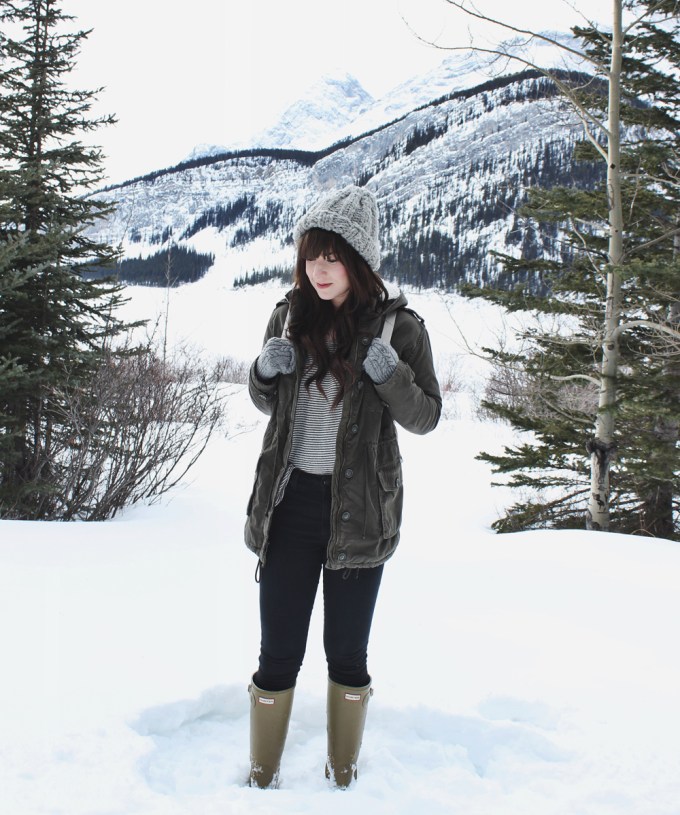 I’ve been hanging out in the city too much lately, so I figured i’d head to the mountains for a quick break. It’s been pretty warm in Calgary this past week, so a lot of snow has melted. That is not the case out in Kananaskis Country. They’ve got plenty of snow, I definitely needed these Hunter boots to trek around. This look consists of some more of my favourite winter gear. I got this coat last year from Ariztia, I own a lot of wool coats and I wanted something a little more casual. They’ve got a big sale going on right now, so if you are in the market for a new winter coat this is a good time to get one! I’m also wearing one of my favourite wool hats, I love how big and chunky it is. I wear it a lot and I was really hoping I would find more similar hats this year but they seem to be hard to come by (at least in colours that I like).