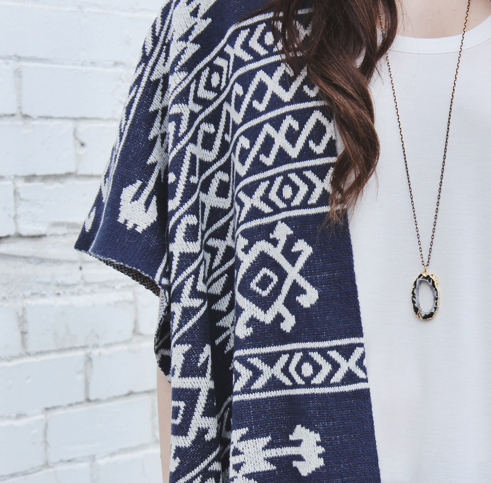I don’t know about you, but i’m ready for spring. This patterned shawl is a perfect transitional piece. It’s still warm enough for a brisk day but not so bulky that it wouldn’t be appropriate for more mild temperatures.  I was drawn to it because of the fringe detail and the pattern, i’m a sucker for both. Because the shawl has such a bold pattern, I decided to keep the rest of the outfit very plain with a white tank top and grey skinny jeans. To complete the look I added my favourite floppy hat and one of my favourite geode necklaces.