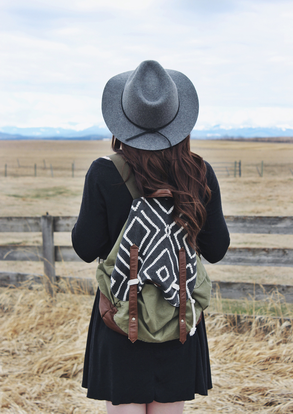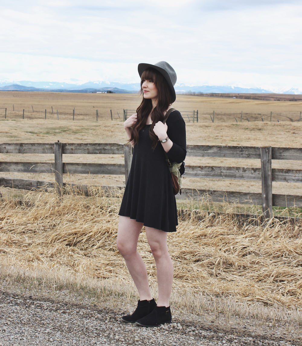Outfit Details: Dress: TNA / Hat: Brixton / Boots: Forever 21 / Backpack: Billabong / Watch: C/O Β Berg + Betts