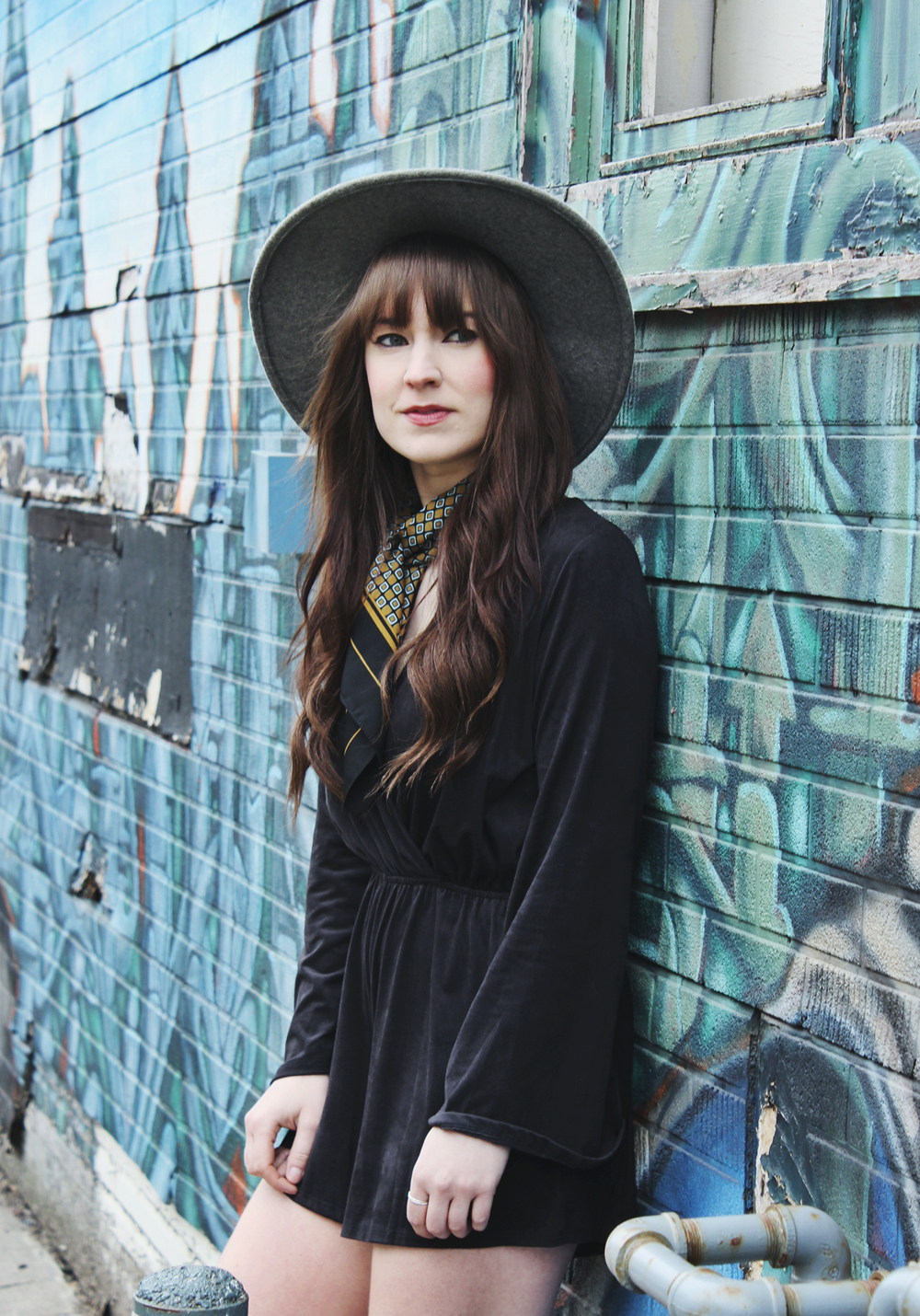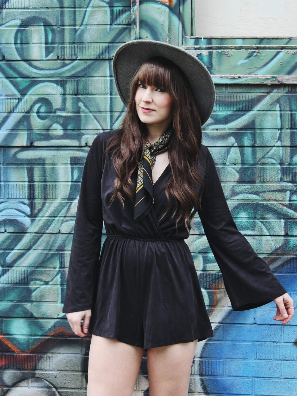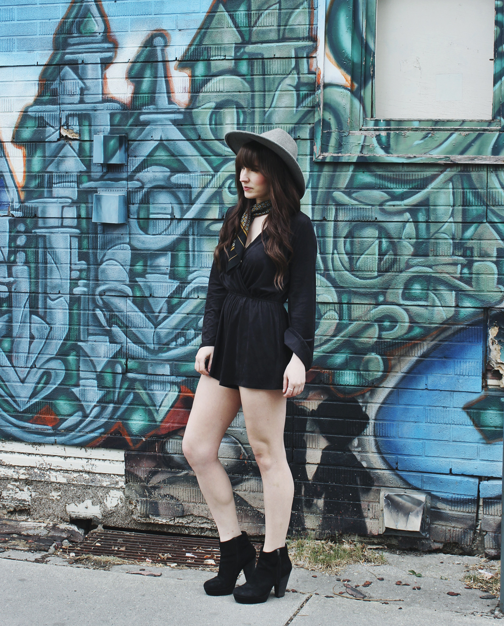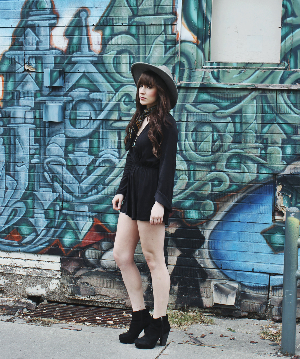 Outfit Details: Hat: Goorin Bros / Romper: Audrey 3+ 1 / Scarf: Urban Outfitters / Necklace: C/O Young Hearts Designs / Booties: Steve Madden