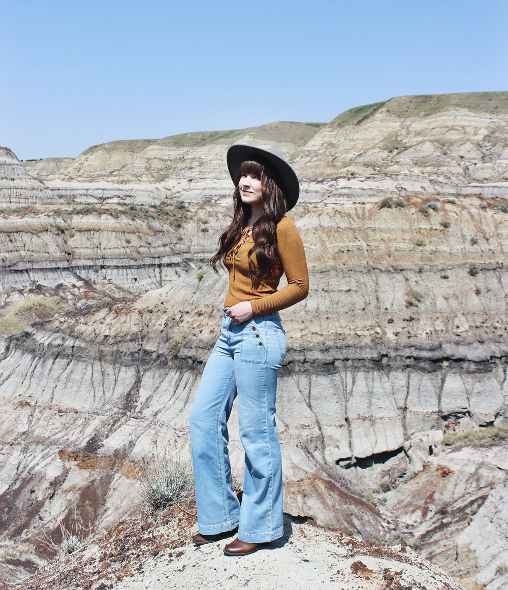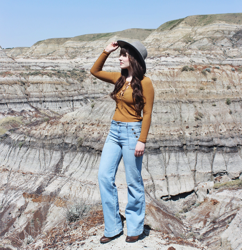 I love getting outfit shots in cool locations around Alberta and sometimes that requires a little leg work. We went pretty far into Horsetheif Canyon for these shots, so I came prepared with my Salomon hiking shoes. No they are not featured in this look, Wide legged jeans with a pair of hiking shoes wasn’t the look I was going for this time. If you were ever wondering if I wore an outfit like this on a hike in the badlands or the mountains, the answer is no. I wore appropriate footwear and changed when I got to the location.
