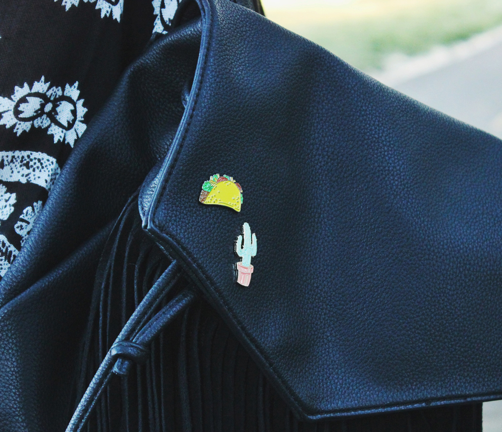 For the rest of the look I decided to wear my favourite wide legged jeans from dynamite. I need to wear them while I can because it’s been really hot in Calgary this past week and i’ve been living in Denim shorts. To accessorize I added my favourite bolo choker by Innerwolf, I’ve been playing around with different ways to wear it and found a new one that I love. It’s cool to have a piece of jewelry that can be manipulated into different looks, It’s very versatile! I’d also like to point out these adorable pins by Heather Buchanan, who doesn’t want a cute taco and cactus pin to put on every backpack and jacket they own?! She’s also has lots of other options, so do yourself a favourite and check out her site!