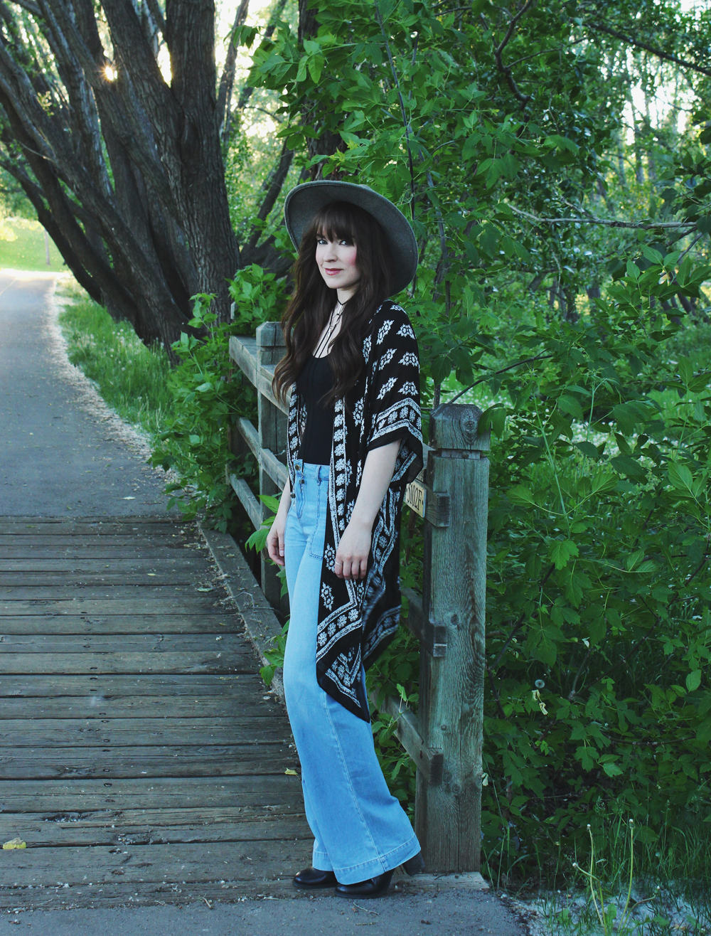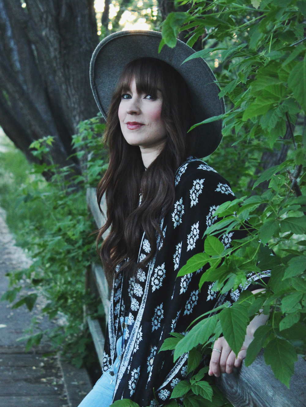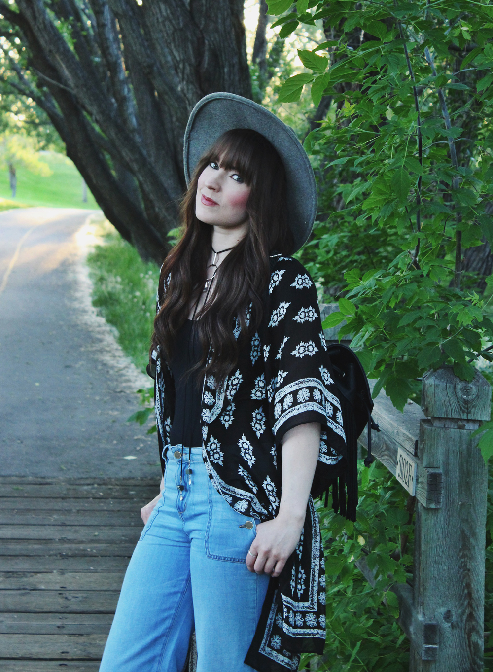Outfit Details: Hat: Goorin Bros / Kimono: C/O Lovestitch / Necklace: C/O Innerwolf Jewelry / Jeans: Dynamite / Pins: C/O Heather Buchanan