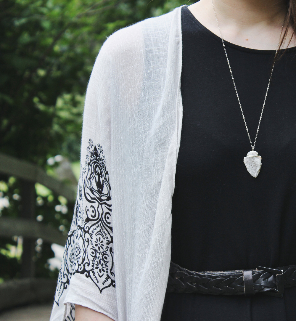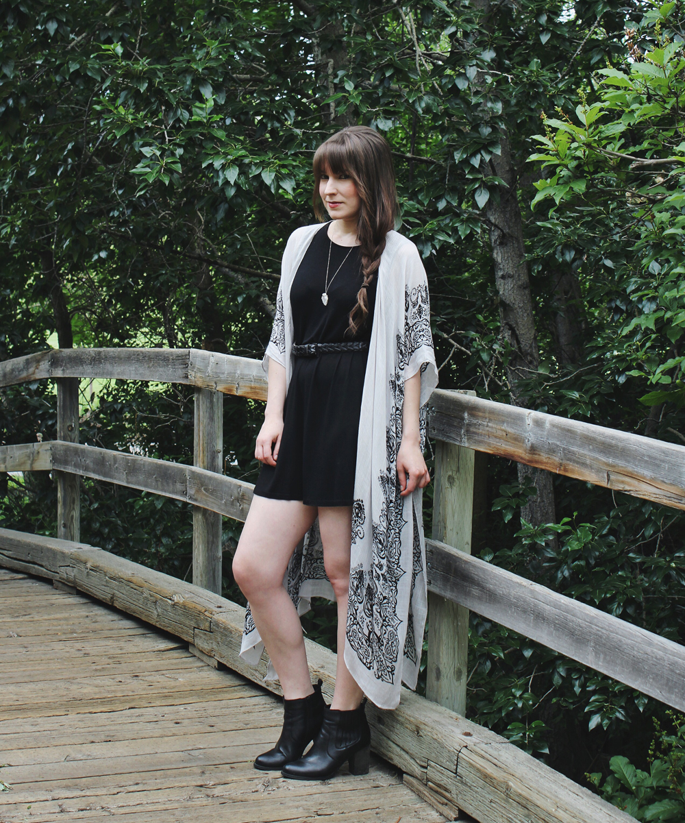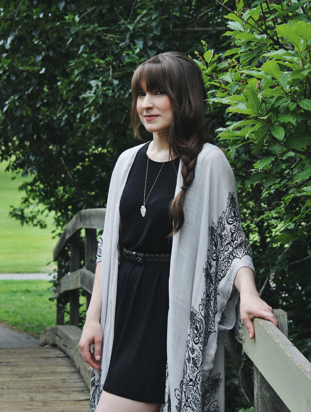 Because summer is finally here, I figured that I should focus on looks that really suit the weather. What is more weather appropriate than a light dress?! I feel like I havent been wearing dresses as much as I used to. To remedy that, I wore this little black dress under this awesome Love stitch kimono! I also decided to try something new with my hair in the form of a messy side braid. I really don’t mix up my hair routine very often but sometimes a little change is nice!