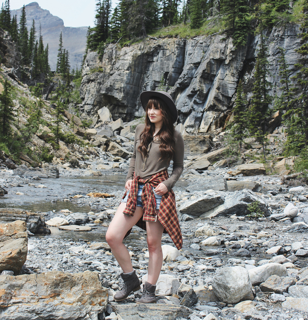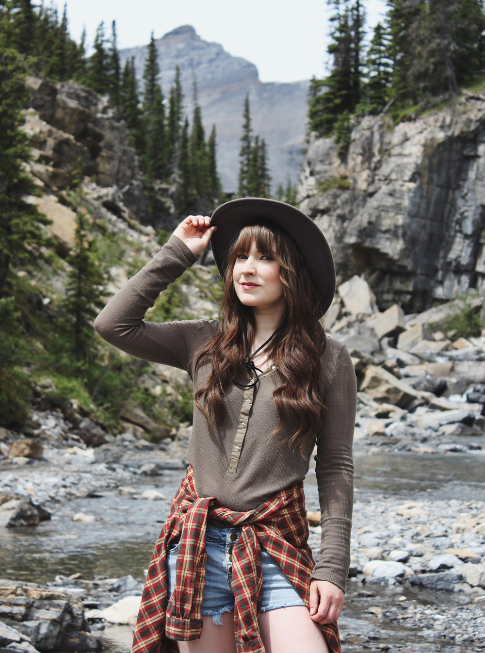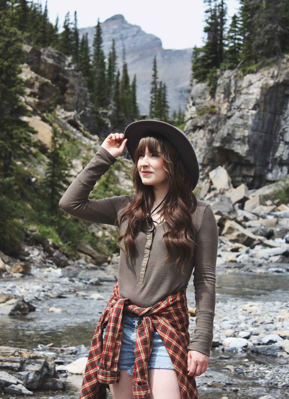 This is the second look from last weekends camping trip out in Waiparous. These photos were taken near the waterfall that we camped by. It’s really gorgeous out there and I want to go back asap! Full disclosure, I did both outfit shots the same day. My hair did not look like this after a night of camping, I certainly wish it did! My camping style really isn’t very different from my every style, I just wore more appropriate footwear. This oversized plaid shirt came in really handy when the temperature cooled down at night. On a side note, I don’t wear this hat very often but it was awesome to wear while camping. The string sort of makes me feel a bit like a girl scout but it really comes in really handy when the wind starts to pick up. It’s always nice when you don’t have to worry about losing your hat.